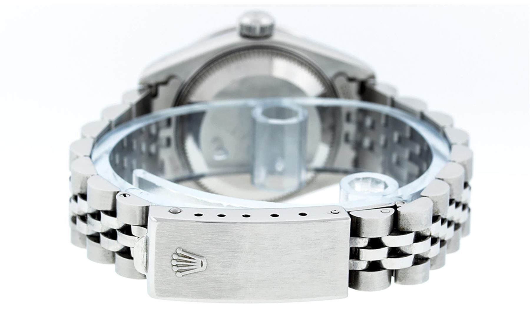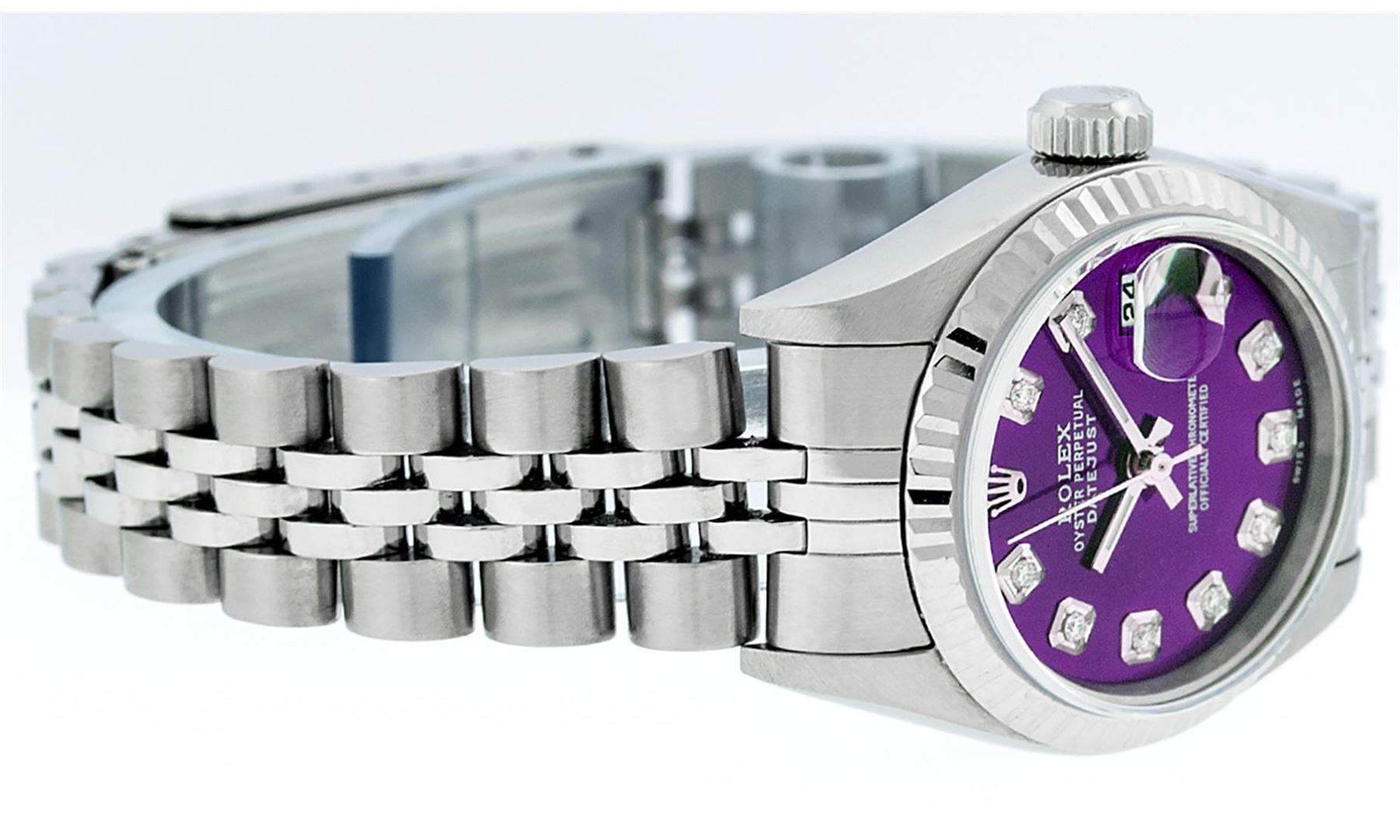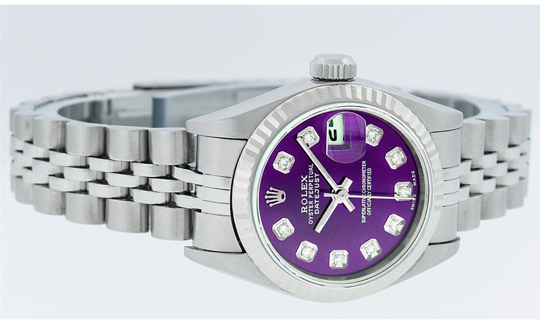 One Ladies Pre Owned Quickset Stainless Steel Rolex Datejust Polished Bright with Satin Finish, Serviced & Electronically Tested, Rolex Stainless Steel Case: 26mm, Rolex Stainless Steel Crown, Rolex Bezel: 18K White Gold Fluted Bezel. Custom Crystal: New Scratch Resistant Sapphire Cyclops Lens. Custom Hands: New Luminescent Hands. Rolex Movement: Automatic Winding Movement. Custom Dial: Refinished To Purple With Added Diamonds, Diamond Count: 10 Diamonds In Dial, Color: G to H, Clarity: SI1 Date Window: 3 O'Clock Position Date Display, Model: 79174 Quickset Datejust Caliber 2230. Condition: G-6 Extra Fine. Rolex Bracelet: Stainless Steel Jubilee Band. Bright Polish & Satin Finish. 6.0 Inch Length, Adjustable. Standard Clasp, With Rolex Logo. This Watch Has Been Serviced Time Tested And Is In Excellent Condition It Is Free Of All Scratches And Dents.