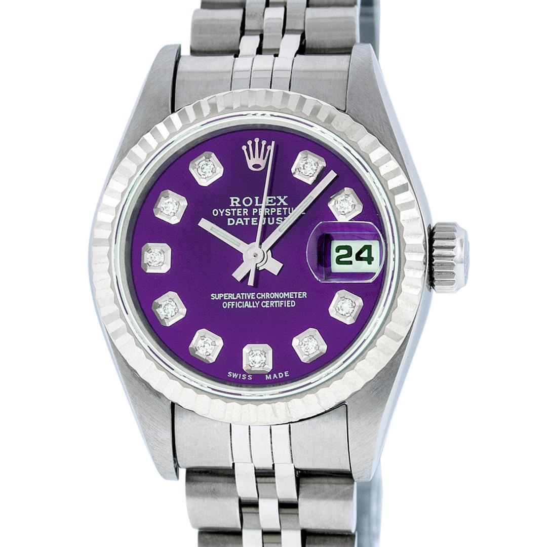 One Ladies Pre Owned Quickset Stainless Steel Rolex Datejust Polished Bright with Satin Finish, Serviced & Electronically Tested, Rolex Stainless Steel Case: 26mm, Rolex Stainless Steel Crown, Rolex Bezel: 18K White Gold Fluted Bezel. Custom Crystal: New Scratch Resistant Sapphire Cyclops Lens. Custom Hands: New Luminescent Hands. Rolex Movement: Automatic Winding Movement. Custom Dial: Refinished To Purple With Added Diamonds, Diamond Count: 10 Diamonds In Dial, Color: G to H, Clarity: SI1 Date Window: 3 O'Clock Position Date Display, Model: 79174 Quickset Datejust Caliber 2230. Condition: G-6 Extra Fine. Rolex Bracelet: Stainless Steel Jubilee Band. Bright Polish & Satin Finish. 6.0 Inch Length, Adjustable. Standard Clasp, With Rolex Logo. This Watch Has Been Serviced Time Tested And Is In Excellent Condition It Is Free Of All Scratches And Dents.