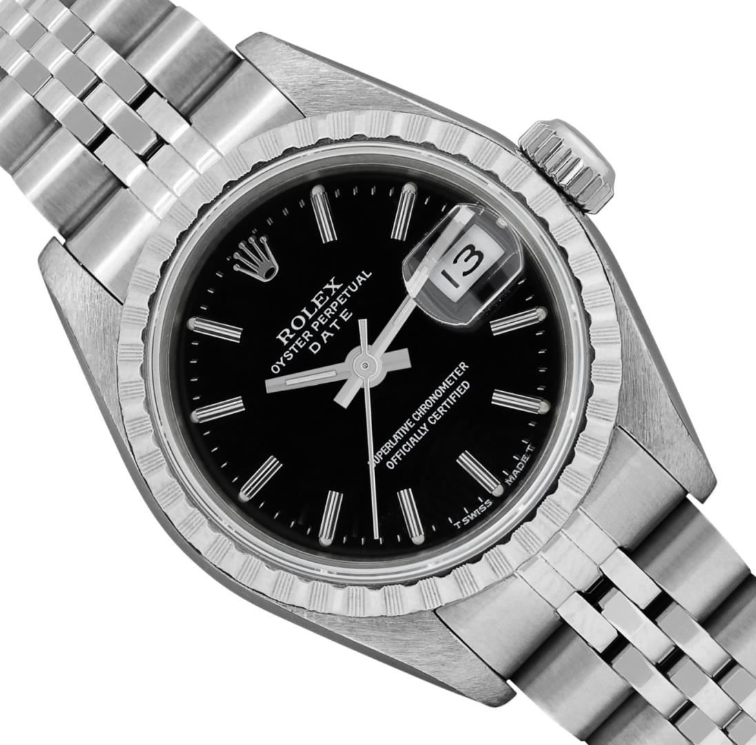 One Rolex Ladies Pre Owned Stainless Steel Date Wristwatch Polished Bright with Satin Finish, Serviced & Electronically Tested, Stainless Steel Case: 26mm, Stainless Steel Crown, Rolex Stainless Steel Engine Turn bezel. Custom Crystal: New Sapphire With Magnified Date Window. Custom Hands: New Luminescent Hands. Rolex Movement: 2135 Automatic Winding Movement. Rolex Dial: Factory Black With Index Hour Markers And Lumi Dots. Date Window: 3 O'Clock Position Date Display, Model: Quickset Date. Condition: G-6 Extra Fine. Rolex Bracelet: Stainless Steel Jubilee Band. Bright Polish & Satin Finish. 6.0 Inch Length, Adjustable. Standard Clasp, With Rolex Logo. This Watch Has Been Serviced And Time Tested. It Is In Excellent Condition, Free Of All Scratches And Dents. This Watch Comes With A Rolex Box.