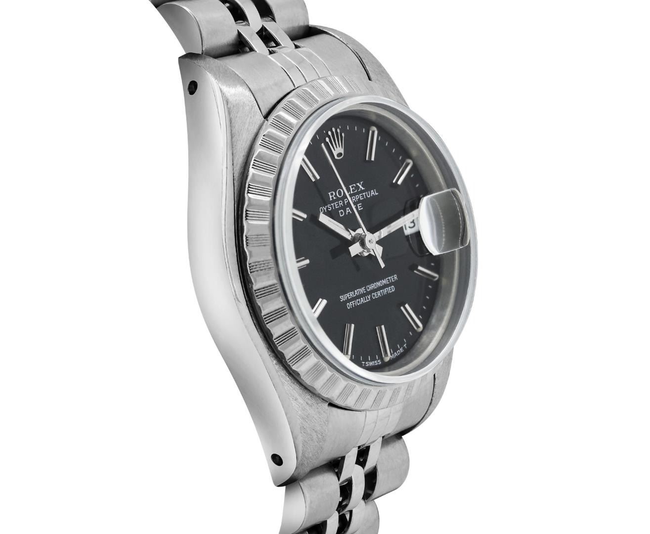 One Rolex Ladies Pre Owned Stainless Steel Date Wristwatch Polished Bright with Satin Finish, Serviced & Electronically Tested, Stainless Steel Case: 26mm, Stainless Steel Crown, Rolex Stainless Steel Engine Turn bezel. Custom Crystal: New Sapphire With Magnified Date Window. Custom Hands: New Luminescent Hands. Rolex Movement: 2135 Automatic Winding Movement. Rolex Dial: Factory Black With Index Hour Markers And Lumi Dots. Date Window: 3 O'Clock Position Date Display, Model: Quickset Date. Condition: G-6 Extra Fine. Rolex Bracelet: Stainless Steel Jubilee Band. Bright Polish & Satin Finish. 6.0 Inch Length, Adjustable. Standard Clasp, With Rolex Logo. This Watch Has Been Serviced And Time Tested. It Is In Excellent Condition, Free Of All Scratches And Dents. This Watch Comes With A Rolex Box.
