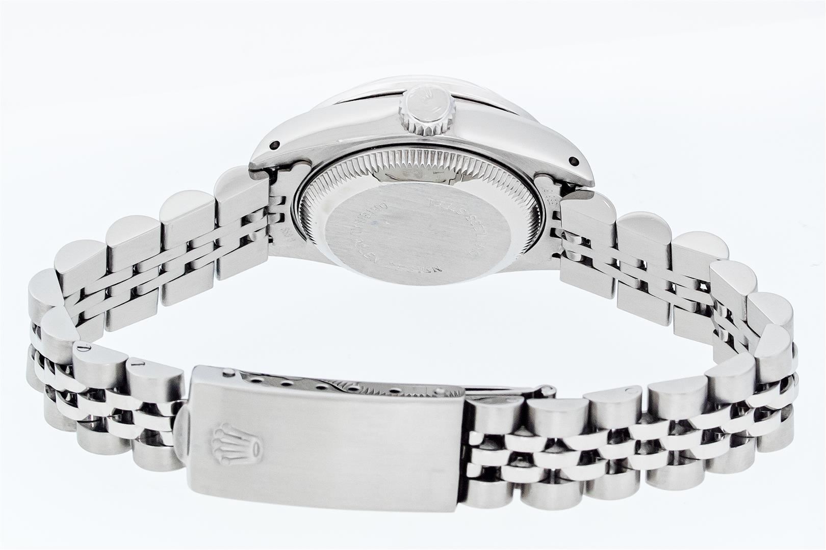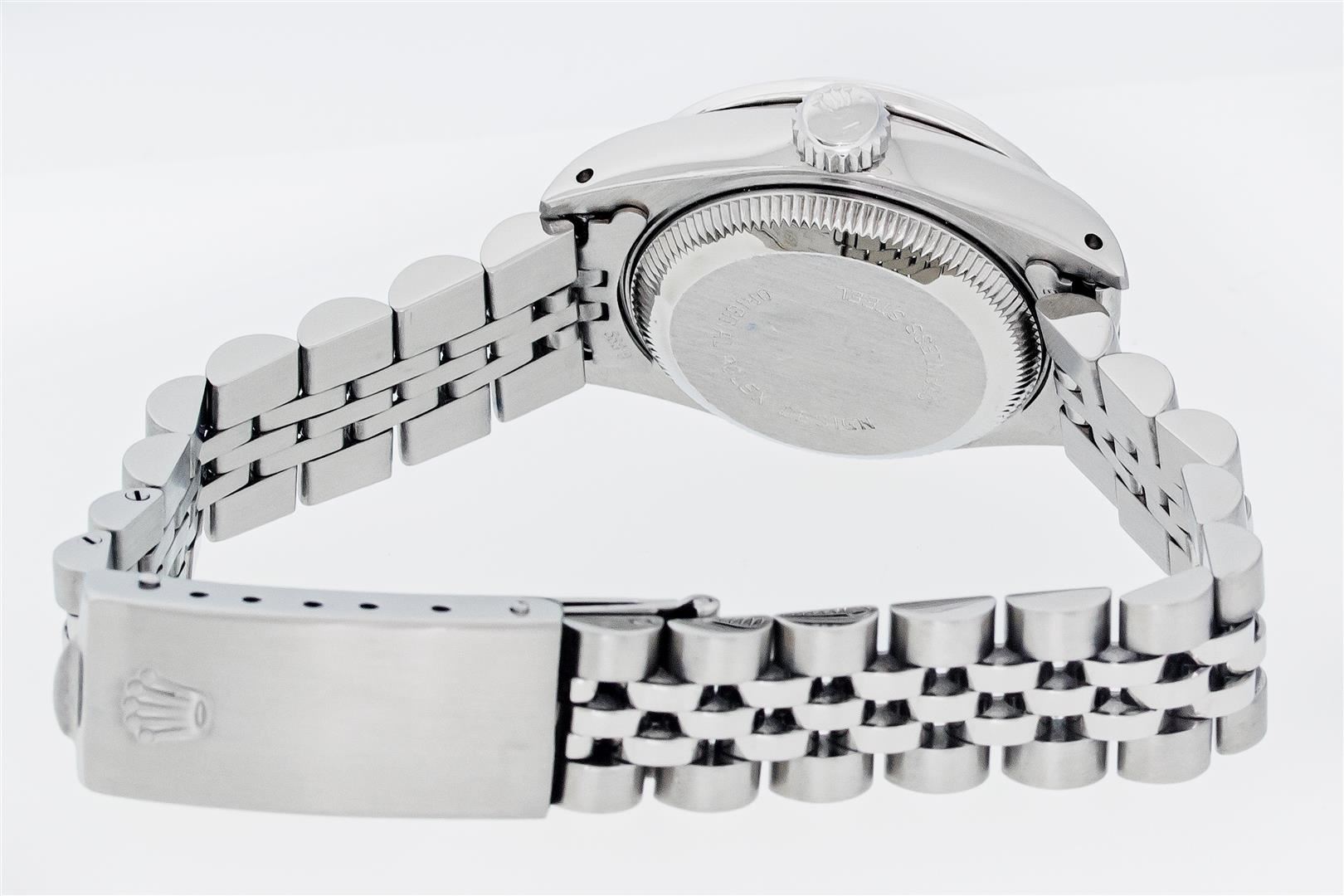 One Ladies Pre Owned Quickset Stainless Steel Rolex Datejust Polished Bright with Satin Finish Serviced & Electronically Tested, Rolex Stainless Steel Case: 26mm, Rolex Stainless Steel Crown, Custom Bezel: New 18K White Gold Beadset Diamond And Ruby Bezel, Diamond Count: 28 Diamonds + 4 Rubies, Color: G to H, Clarity: SI-VS, Custom Crystal: New Sapphire With Magnified Date Window. Custom Hands: New Luminescent Hands. Rolex Movement: Automatic Winding Movement. Rolex Dial: Black Index Dial With Dash Track And Lumi Dots. Date Window: 3 O'Clock Position Date Display, Model: Quickset Datejust. Condition: G-6 Extra Fine. Rolex Bracelet: Stainless Steel Jubilee Band With Rolex Crown On Buckle. Bright Polish & Satin Finish. Band Length: 6.0 Inch Length, Adjustable. Standard Clasp, With Rolex Logo. This Watch Has Been Serviced Time Tested And Is In Excellent Condition It Is Free Of All Scratches And Dents.