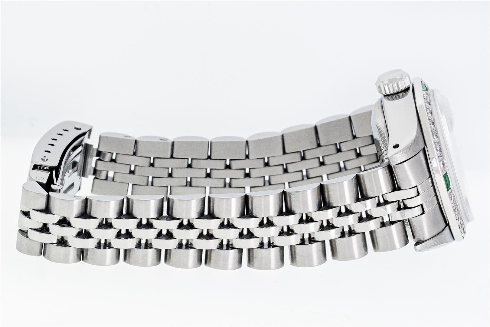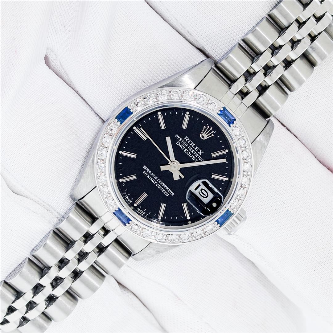 One Ladies Pre Owned Quickset Stainless Steel Rolex Datejust Polished Bright with Satin Finish Serviced & Electronically Tested, Rolex Stainless Steel Case: 26mm, Rolex Stainless Steel Crown, Custom Bezel: New 18K White Gold Beadset Diamond And Sapphire Bezel, Diamond Count: 28 Diamonds + 4 Sapphires, Color: G to H, Clarity: SI-VS, Custom Crystal: New Sapphire With Magnified Date Window. Custom Hands: New Luminescent Hands. Rolex Movement: Automatic Winding Movement. Rolex Dial: Black Index Dial With Dash Track And Lumi Dots. Date Window: 3 O'Clock Position Date Display, Model: Quickset Datejust. Condition: G-6 Extra Fine. Rolex Bracelet: Stainless Steel Jubilee Band With Rolex Crown On Buckle. Bright Polish & Satin Finish. Band Length: 6.0 Inch Length, Adjustable. Standard Clasp, With Rolex Logo. This Watch Has Been Serviced Time Tested And Is In Excellent Condition It Is Free Of All Scratches And Dents.