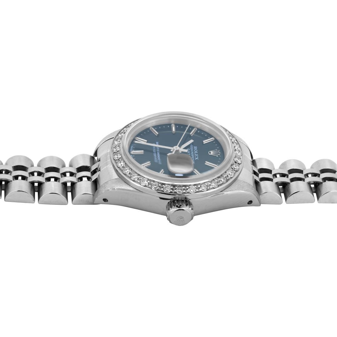 One Rolex Ladies Pre Owned Stainless Steel Date Wristwatch Polished Bright with Satin Finish, Serviced & Electronically Tested, Stainless Steel Case: 26mm, Stainless Steel Crown, Custom Bezel: New 18K White Gold Beadset Diamond Bezel, Diamond Count: 32 Diamonds. Custom Crystal: New Sapphire With Magnified Date Window. Custom Hands: New Luminescent Hands. Rolex Movement: 2135 Automatic Winding Movement. Rolex Dial: Factory Black With Index Hour Markers And Lumi Dots. Date Window: 3 O'Clock Position Date Display, Model: Quickset Date. Condition: G-6 Extra Fine. Rolex Bracelet: Stainless Steel Jubilee Band. Bright Polish & Satin Finish. 6.0 Inch Length, Adjustable. Standard Clasp, With Rolex Logo. This Watch Has Been Serviced And Time Tested. It Is In Excellent Condition, Free Of All Scratches And Dents. This Watch Comes With A Rolex Box.