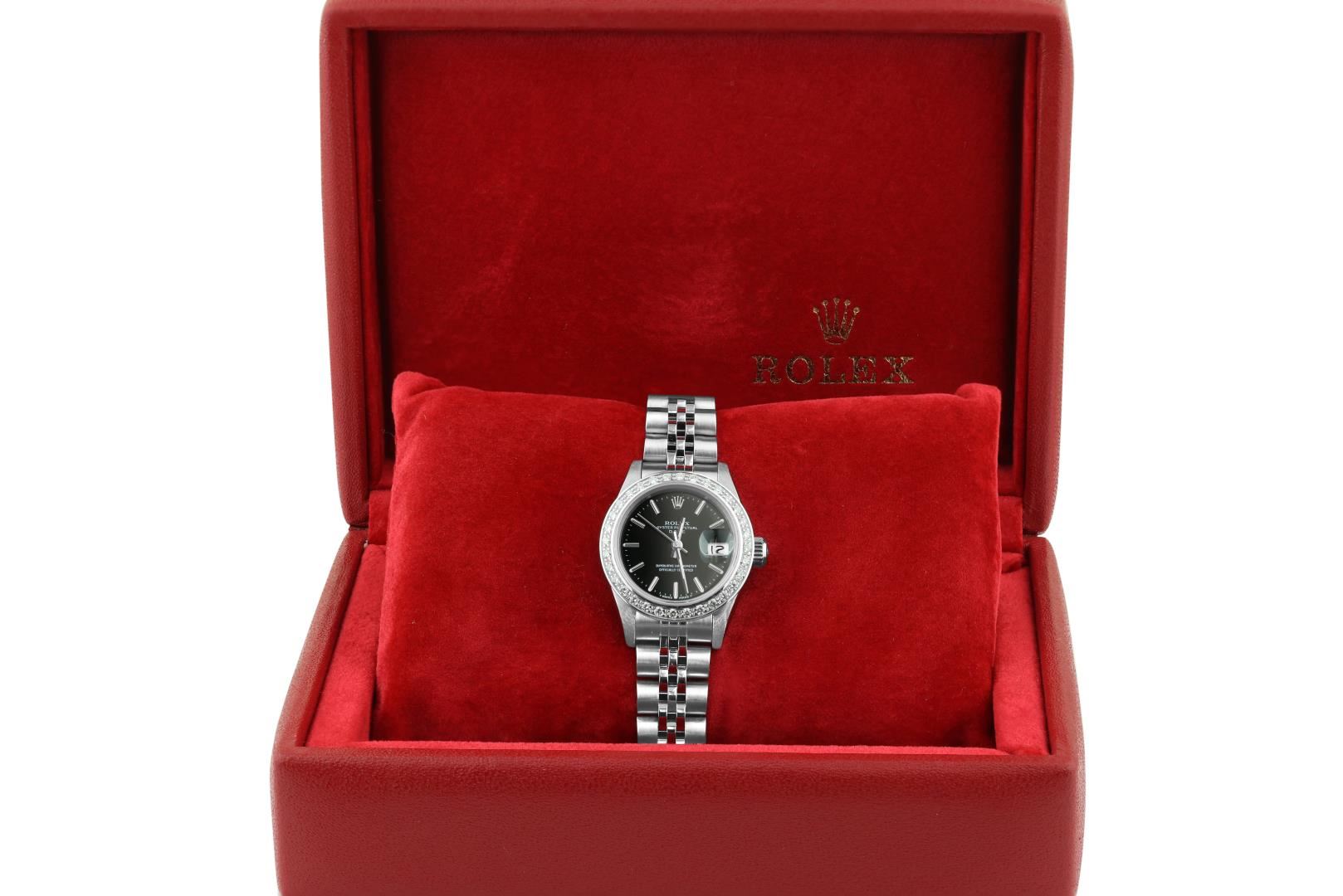 One Rolex Ladies Pre Owned Stainless Steel Date Wristwatch Polished Bright with Satin Finish, Serviced & Electronically Tested, Stainless Steel Case: 26mm, Stainless Steel Crown, Custom Bezel: New 18K White Gold Beadset Diamond Bezel, Diamond Count: 32 Diamonds. Custom Crystal: New Sapphire With Magnified Date Window. Custom Hands: New Luminescent Hands. Rolex Movement: 2135 Automatic Winding Movement. Rolex Dial: Factory Black With Index Hour Markers And Lumi Dots. Date Window: 3 O'Clock Position Date Display, Model: Quickset Date. Condition: G-6 Extra Fine. Rolex Bracelet: Stainless Steel Jubilee Band. Bright Polish & Satin Finish. 6.0 Inch Length, Adjustable. Standard Clasp, With Rolex Logo. This Watch Has Been Serviced And Time Tested. It Is In Excellent Condition, Free Of All Scratches And Dents. This Watch Comes With A Rolex Box.