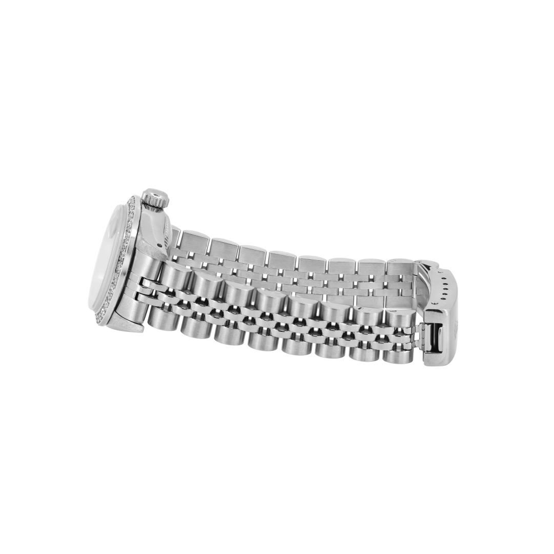 One Rolex Ladies Pre Owned Stainless Steel Date Wristwatch Polished Bright with Satin Finish, Serviced & Electronically Tested, Stainless Steel Case: 26mm, Stainless Steel Crown, Custom Bezel: New 18K White Gold Beadset Diamond Bezel, Diamond Count: 32 Diamonds. Custom Crystal: New Sapphire With Magnified Date Window. Custom Hands: New Luminescent Hands. Rolex Movement: 2135 Automatic Winding Movement. Rolex Dial: Factory Black With Index Hour Markers And Lumi Dots. Date Window: 3 O'Clock Position Date Display, Model: Quickset Date. Condition: G-6 Extra Fine. Rolex Bracelet: Stainless Steel Jubilee Band. Bright Polish & Satin Finish. 6.0 Inch Length, Adjustable. Standard Clasp, With Rolex Logo. This Watch Has Been Serviced And Time Tested. It Is In Excellent Condition, Free Of All Scratches And Dents. This Watch Comes With A Rolex Box.