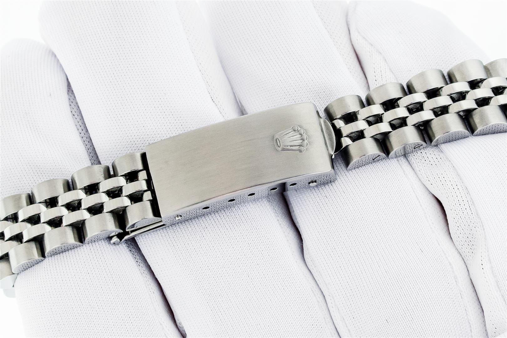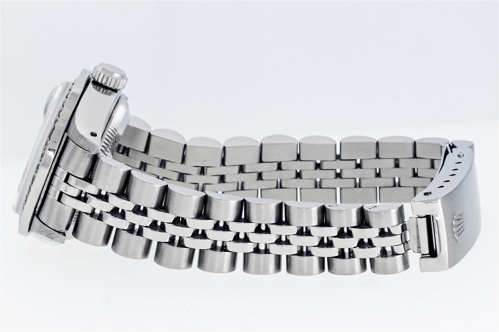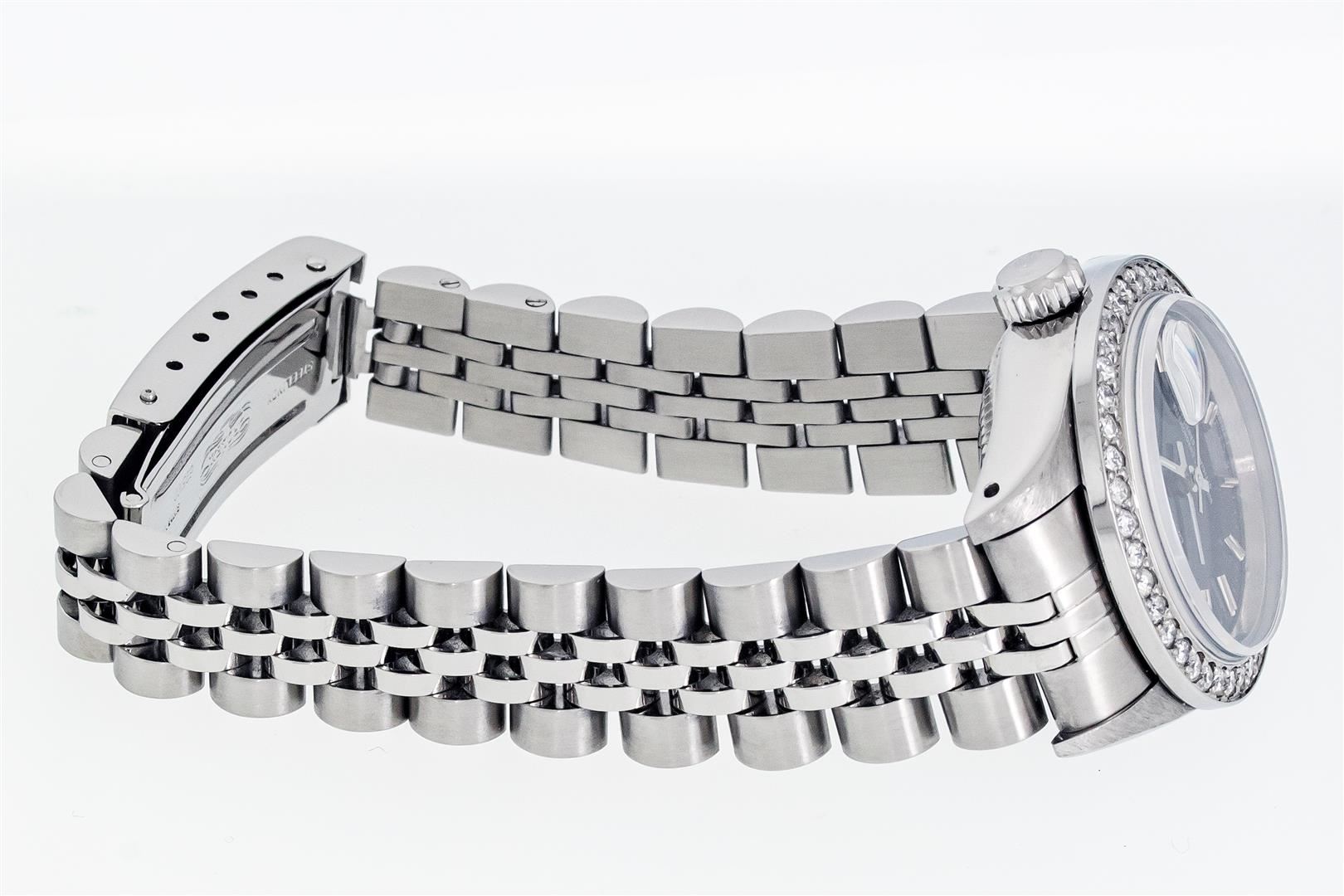 One Ladies Pre Owned Quickset Stainless Steel Rolex Datejust Polished Bright with Satin Finish Serviced & Electronically Tested, Rolex Stainless Steel Case: 26mm, Rolex Stainless Steel Crown, Custom Bezel: New Stainless Steel Diamond Pave Bezel, Diamond Count: 40 Diamonds, Color: G to H, Clarity: SI-VS, Custom Crystal: New Sapphire With Magnified Date Window. Custom Hands: New Luminescent Hands. Rolex Movement: Automatic Winding Movement. Rolex Dial: Black Index Dial With Dash Track And Lumi Dots. Date Window: 3 O'Clock Position Date Display, Model: Quickset Datejust. Condition: G-6 Extra Fine. Rolex Bracelet: Stainless Steel Jubilee Band With Rolex Crown On Buckle. Bright Polish & Satin Finish. Band Length: 6.0 Inch Length, Adjustable. Standard Clasp, With Rolex Logo. This Watch Has Been Serviced Time Tested And Is In Excellent Condition It Is Free Of All Scratches And Dents.
