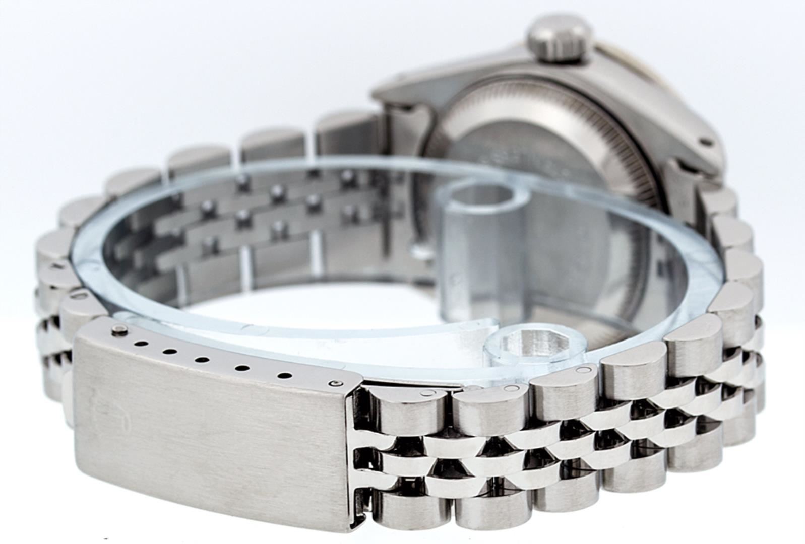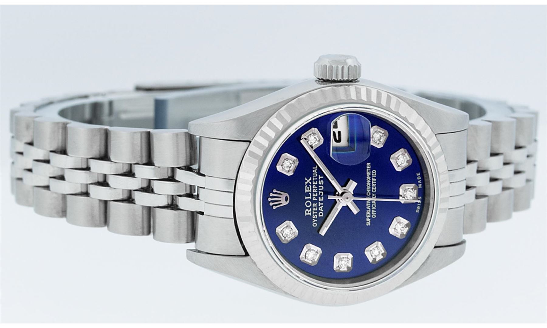 One Rolex Ladies Pre Owned Quickset Stainless Steel Datejust Polished Bright with Satin Finish, Serviced And Electronically Tested, Rolex Stainless Steel Case: 26mm, Rolex Stainless Steel Crown, Rolex Bezel: 18K White Gold Fluted Bezel. Custom Crystal: New Sapphire With Date Window. Custom Hands: New Luminescent Hands. Rolex Movement: Automatic Winding Movement 2235. Custom Dial: Custom Blue Dial With Added Diamonds, Diamond Count: 10 Diamonds On Dial. Date Window: 3 O'Clock Position Date Display, Model: Quickset Datejust. Condition: G-6 Extra Fine. Rolex Bracelet: Stainless Steel Jubilee Band. Bright Polish And Satin Finish. 6.0 Inch Length, Adjustable. Standard Clasp, With Rolex Logo. This Watch Has Been Serviced Time Tested And Is In Excellent Condition It Is Free Of All Scratches And Dents.