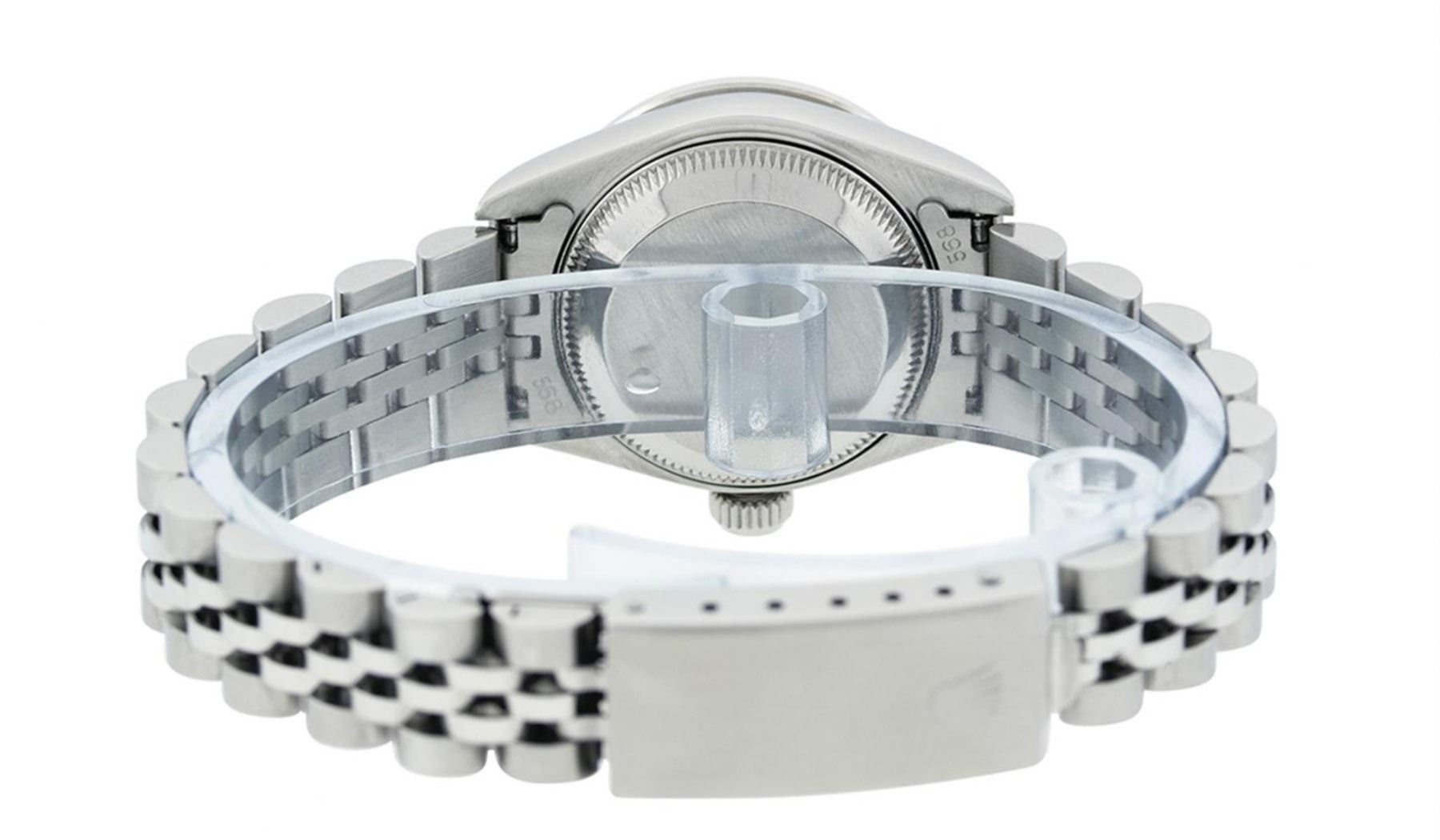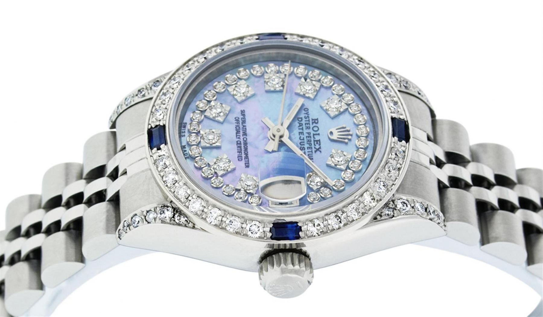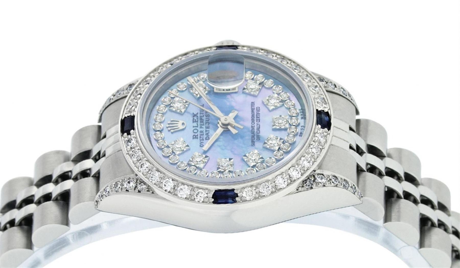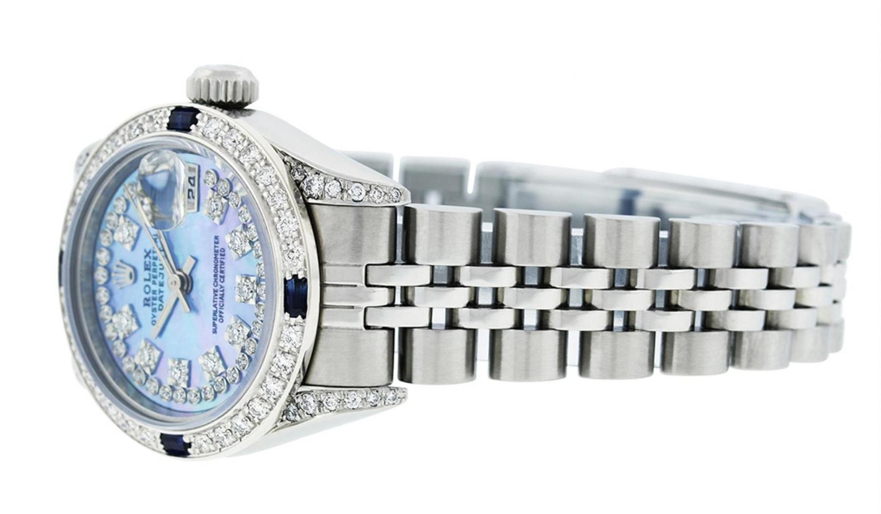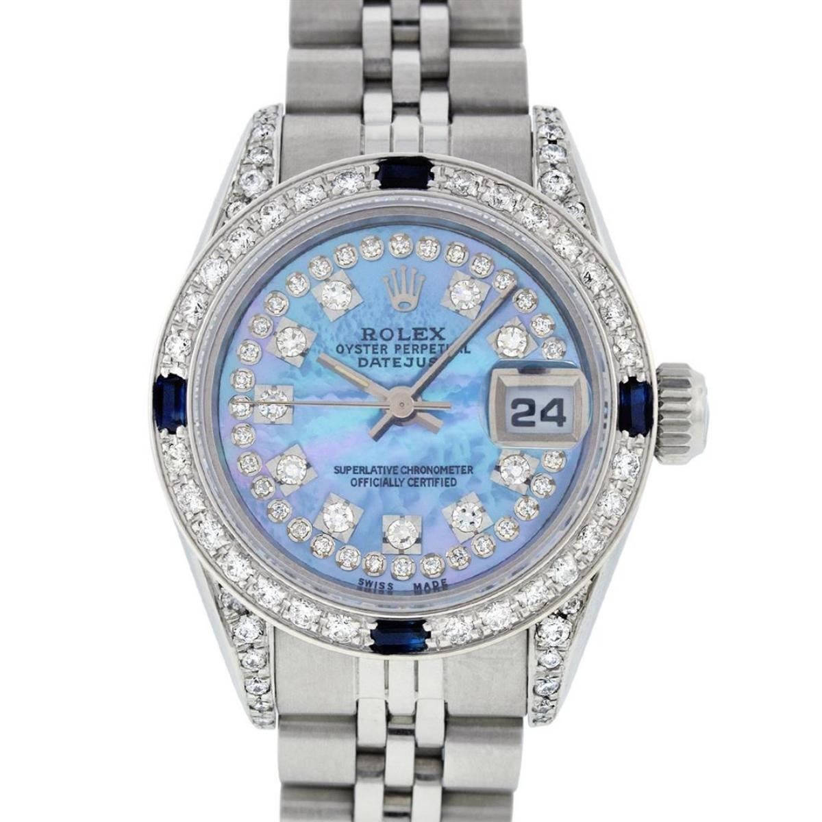 Rolex Quickset Ladies Stainless Steel Oyster Perpetual Datejust Polished Bright with Satin Finish, Serviced & Electronically Tested, Stainless Steel Case: 26mm, Stainless Steel Crown, Custom Diamond Lugs: 24 Diamonds On Lugs, Clarity: SI-VS, Color: G to H. Custom Bezel: New 18K White Gold Diamond + Sapphire Beadset Diamond Bezel, Stone Count: 28 Diamonds + 4 Sapphires, Total Weight .70 Carat, Clarity: SI-VS, Color: G to H. Custom Crystal: New Scratch Resistant Synthetic Sapphire Cyclops Lens. Custom Hands: New Luminescent Hands. Movement: Automatic Winding Movement. Custom Dial: Refinished Single Cut Blue Mother Of Pearl String Diamond Dial, 43 Diamonds in Dial G To H In Color, Clarity: VS. Date Window: 3 O'Clock Position Date Display, Model: Quickset Datejust. Condition: G-6 Extra Fine. Bracelet: Stainless Steel Jubilee Band. Bright Polish & Satin Finish. 6.0 Inch Length, Adjustable. Standard Clasp, With Rolex Logo. This Watch Has Been Serviced Time Tested And Is In Excellent Condition It Is Free Of All Scratches And Dents.
