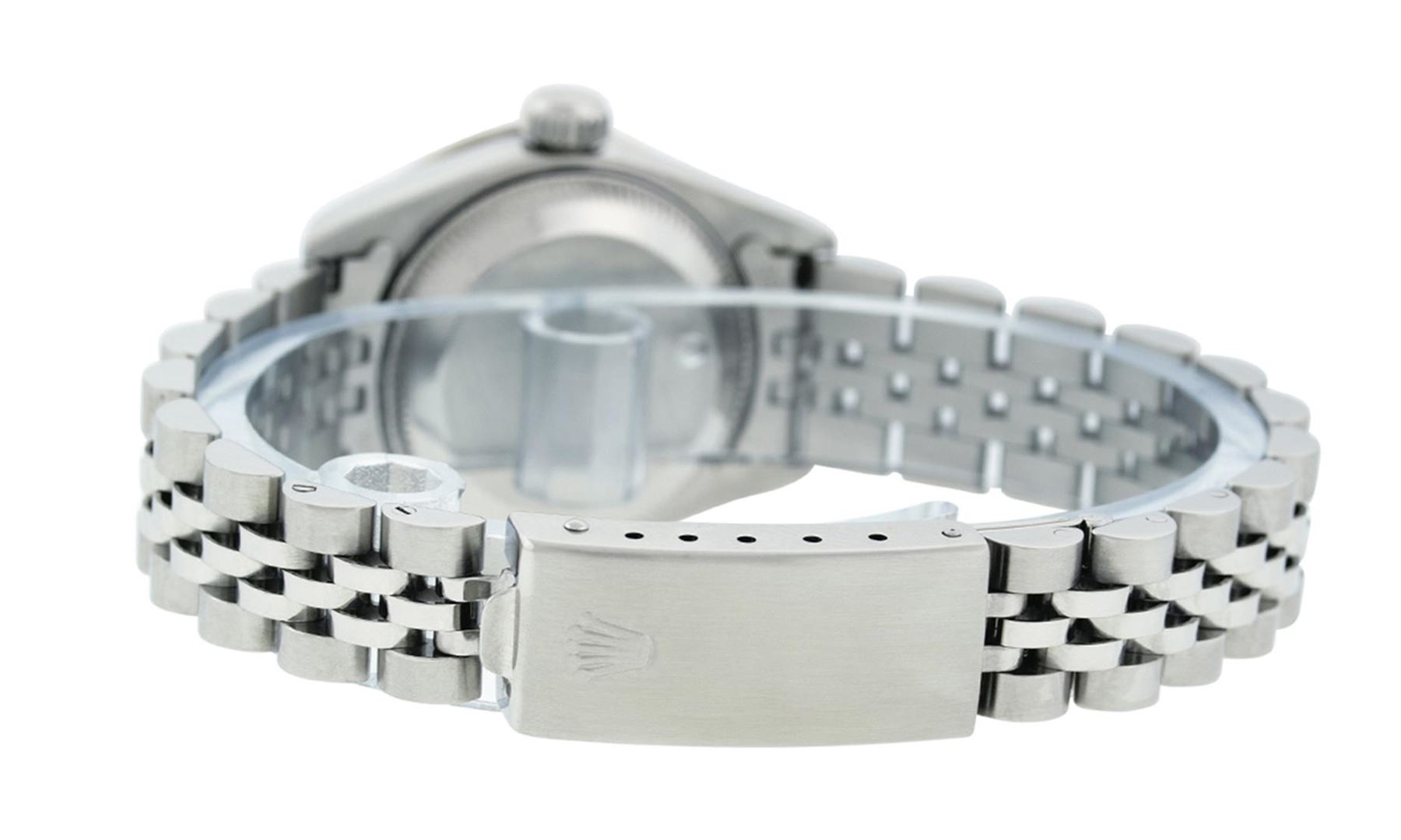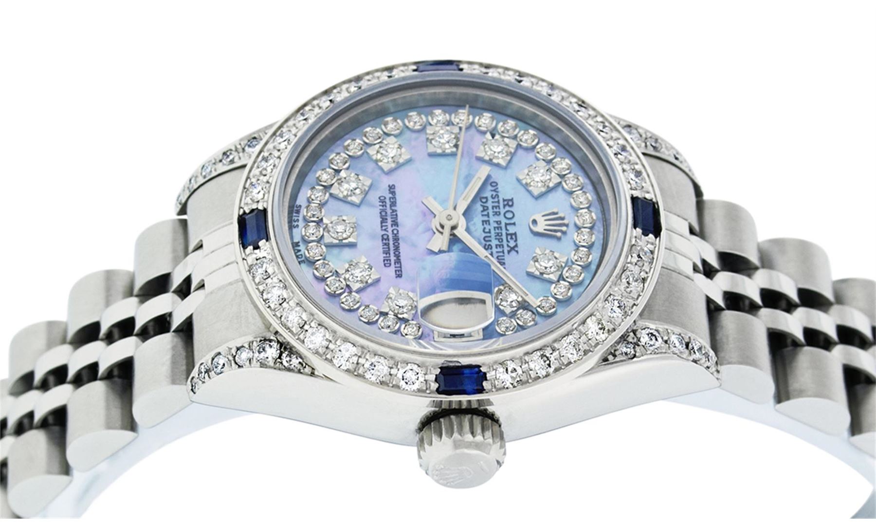 Rolex Quickset Ladies Stainless Steel Oyster Perpetual Datejust Polished Bright with Satin Finish, Serviced & Electronically Tested, Stainless Steel Case: 26mm, Stainless Steel Crown, Custom Diamond Lugs: 24 Diamonds On Lugs, Clarity: SI-VS, Color: G to H. Custom Bezel: New 18K White Gold Diamond + Sapphire Beadset Diamond Bezel, Stone Count: 28 Diamonds + 4 Sapphires, Total Weight .70 Carat, Clarity: SI-VS, Color: G to H. Custom Crystal: New Scratch Resistant Synthetic Sapphire Cyclops Lens. Custom Hands: New Luminescent Hands. Movement: Automatic Winding Movement. Custom Dial: Refinished Single Cut Blue Mother Of Pearl String Diamond Dial, 43 Diamonds in Dial G To H In Color, Clarity: VS. Date Window: 3 O'Clock Position Date Display, Model: Quickset Datejust. Condition: G-6 Extra Fine. Bracelet: Stainless Steel Jubilee Band. Bright Polish & Satin Finish. 6.0 Inch Length, Adjustable. Standard Clasp, With Rolex Logo. This Watch Has Been Serviced Time Tested And Is In Excellent Condition It Is Free Of All Scratches And Dents.