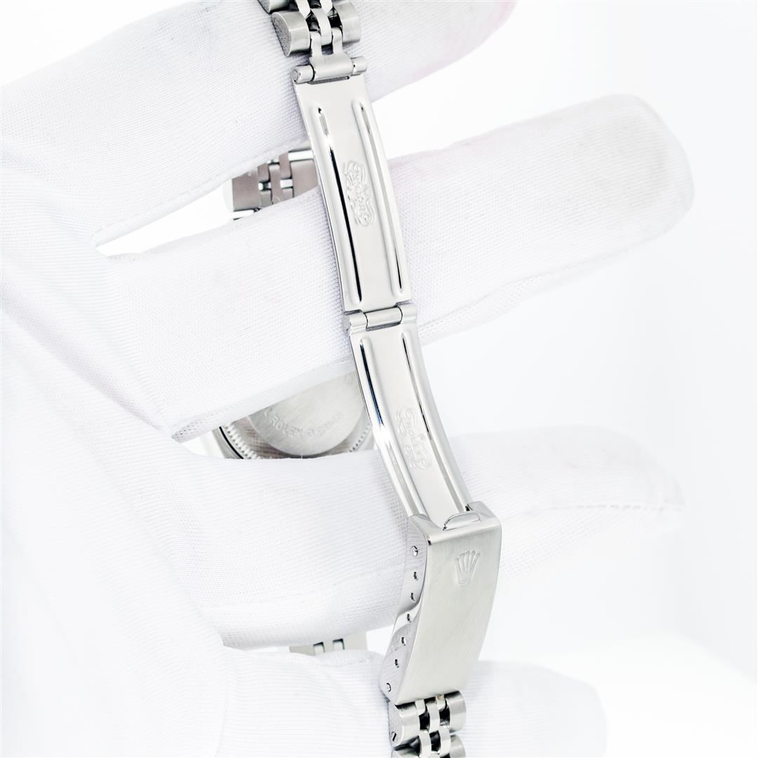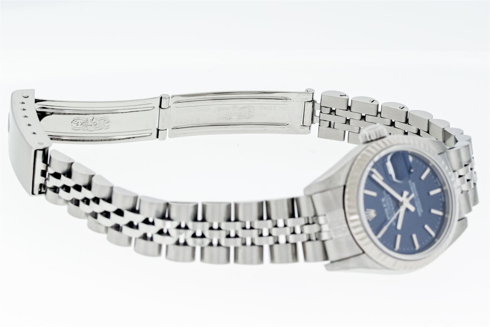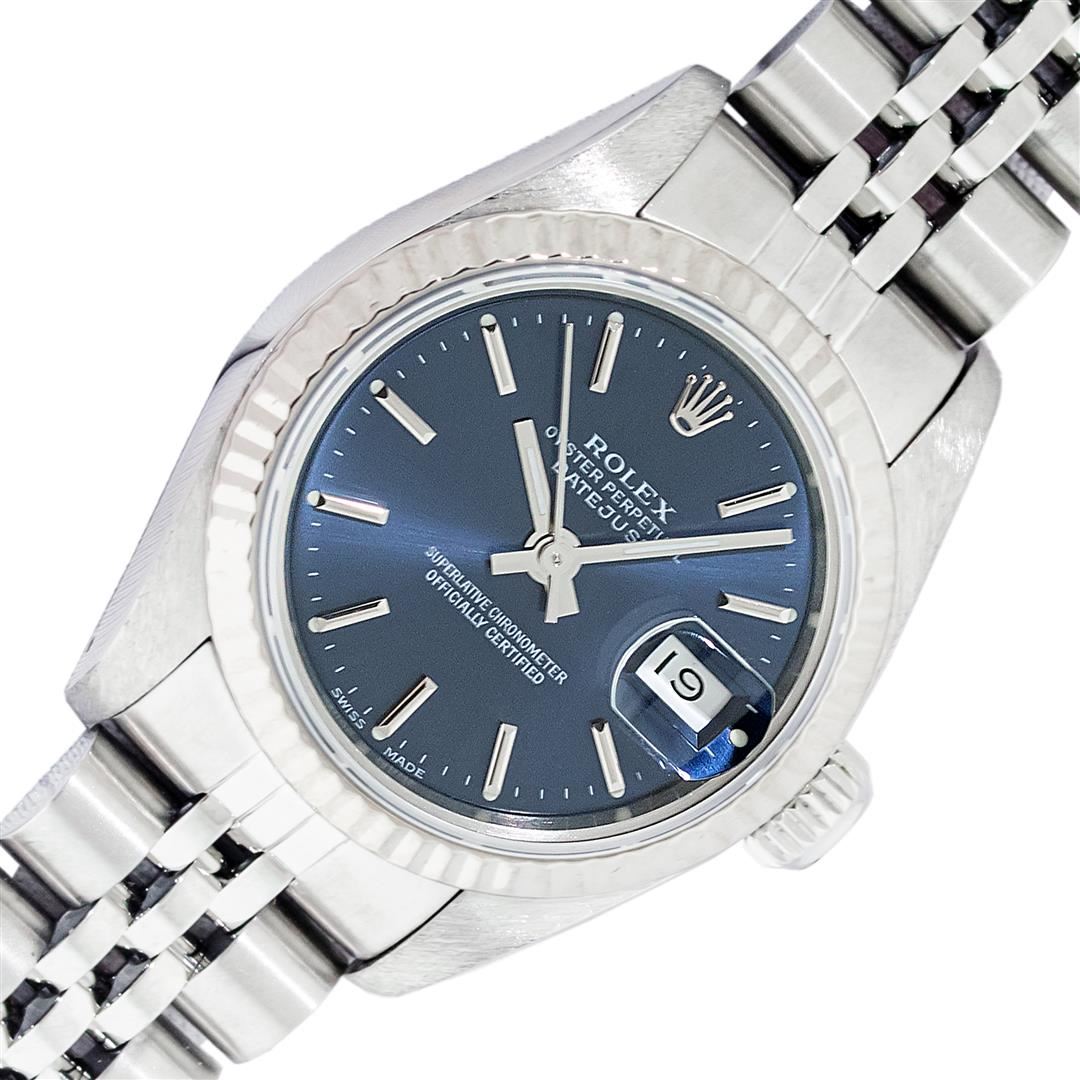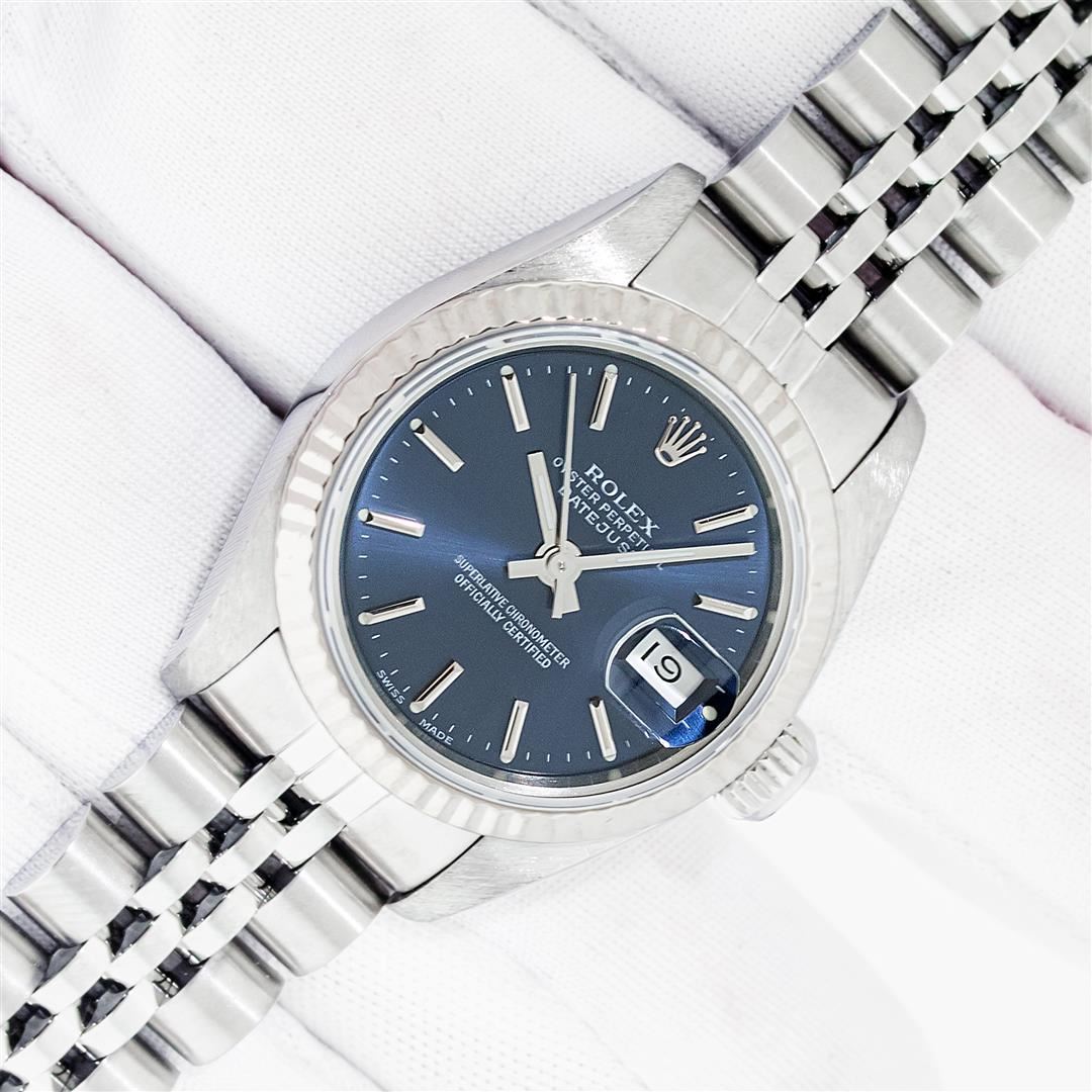 One Ladies Pre Owned Quickset Stainless Steel Rolex Datejust Polished Bright with Satin Finish Serviced & Electronically Tested, Rolex Stainless Steel Case: 26mm, Rolex Stainless Steel Crown, Rolex Bezel: 18K White Gold Fluted Bezel. Custom Crystal: New Sapphire With Magnified Date Window. Custom Hands: New Luminescent Hands. Rolex Movement: Automatic Winding Movement. Rolex Dial: Blue Index Dial With Dash Track. Date Window: 3 O'Clock Position Date Display, Model: Quickset Datejust. Condition: G-6 Extra Fine. Rolex Bracelet: Stainless Steel Jubilee Band With Rolex Crown On Buckle. Bright Polish & Satin Finish. Band Length: 6.0 Inch Length, Adjustable. Standard Clasp, With Rolex Logo. This Watch Has Been Serviced Time Tested And Is In Excellent Condition It Is Free Of All Scratches And Dents.