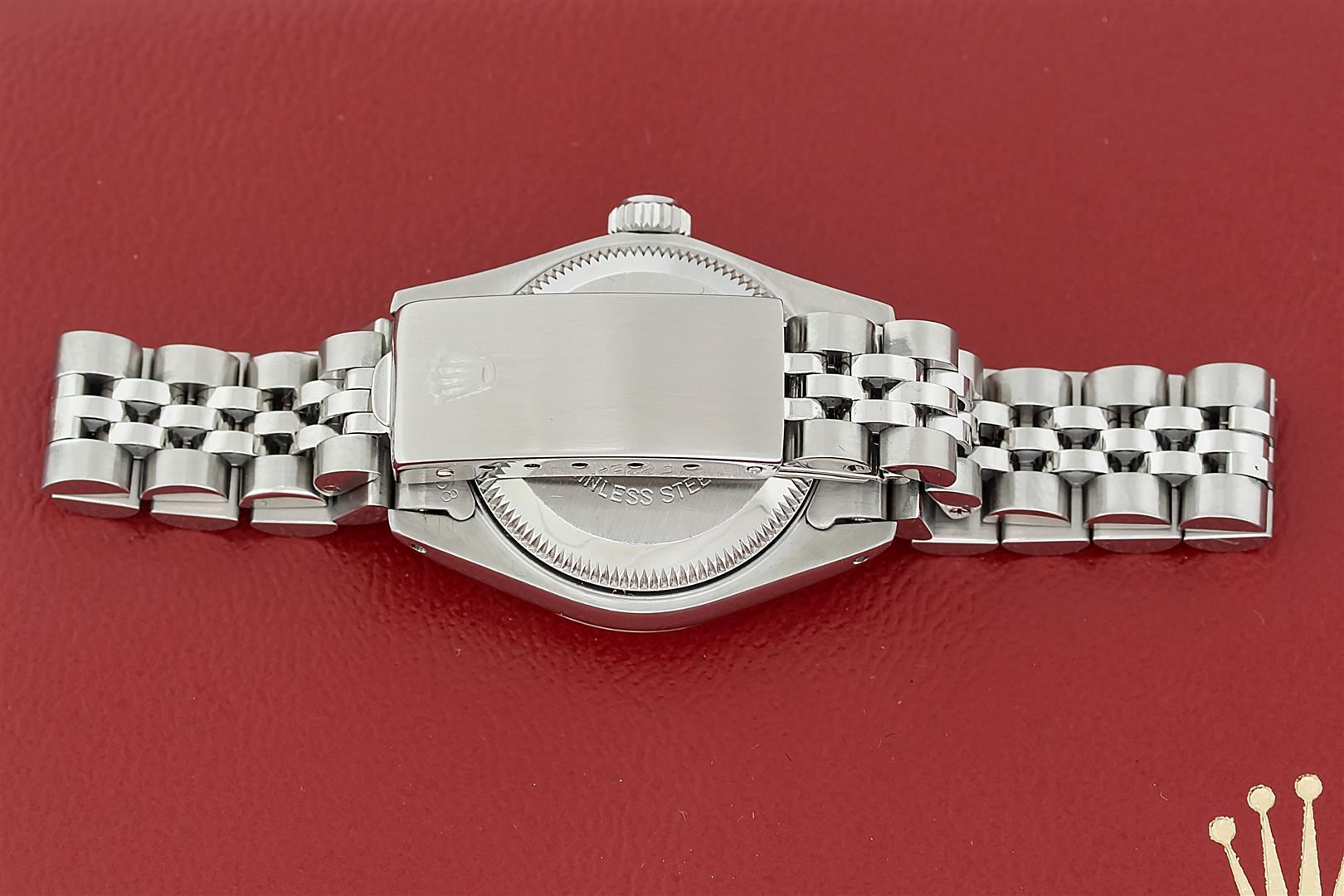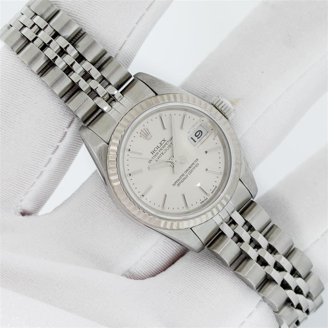 One Ladies Quickset Pre Owned Stainless Steel Rolex Datejust Polished Bright with Satin Finish, Serviced & Electronically Tested, Rolex Stainless Steel Case: 26mm, Rolex Stainless Steel Crown, Rolex Bezel: 18K White Gold Fluted Bezel, Custom Crystal: New With Magnifying Date Window. Rolex Hands: Luminescent Hands. Rolex Movement: Automatic Winding Movement. Rolex Dial: Silver Dial With Index Hour Markers And Lumi Dots. Date Window: 3 O'Clock Position Date Display, Model: Datejust. Condition: G-6 Extra Fine. Rolex Bracelet: Stainless Steel Jubilee Band. Bright Polish & Satin Finish. 6.0 Inch Length, Adjustable. Standard Clasp, With Rolex Logo. This Watch Has Been Serviced Time Tested And Is In Excellent Condition It Is Free Of All Scratches And Dents. This Watch Comes With A Rolex Box And Booklets.