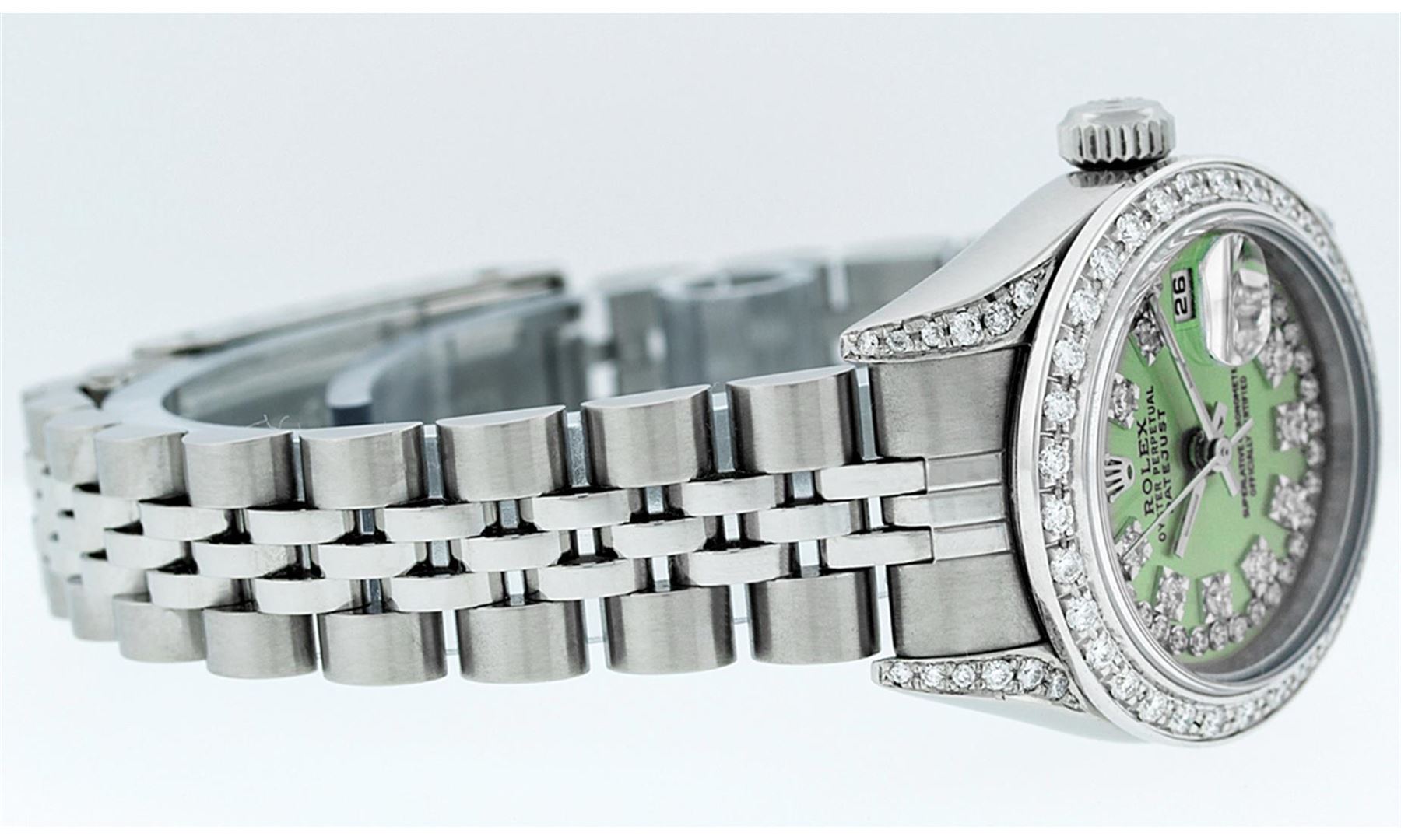 One Quickset Ladies Stainless Steel Rolex Datejust Polished Bright with Satin Finish, Serviced & Electronically Tested, Stainless Steel Case: 26mm, Stainless Steel Crown, Custom Diamond Lugs: 24 Diamonds On Lugs, Clarity: SI-VS, Color: G to H. Custom Bezel: New 18K White Gold Beadset Diamond Bezel, Stone Count: 32 Diamonds On Bezel, Clarity: SI-VS, Color: G to H. Custom Crystal: New Sapphire With Date Window. Custom Hands: New Luminescent Hands. Rolex Movement: Automatic Winding Movement. Custom Dial: Refinished To Green String Diamond Dial, 43 Diamonds in Dial G To H In Color, Clarity: VS. Date Window: 3 O'Clock Position Date Display, Model: Quickset Datejust. Condition: G-6 Extra Fine. Bracelet: Stainless Steel Jubilee Band. Bright Polish & Satin Finish. 6.0 Inch Length, Adjustable. Standard Clasp, With Rolex Logo. This Pre Owned Watch Has Been Serviced Time Tested And Is In Excellent Condition It Is Free Of All Scratches And Dents.