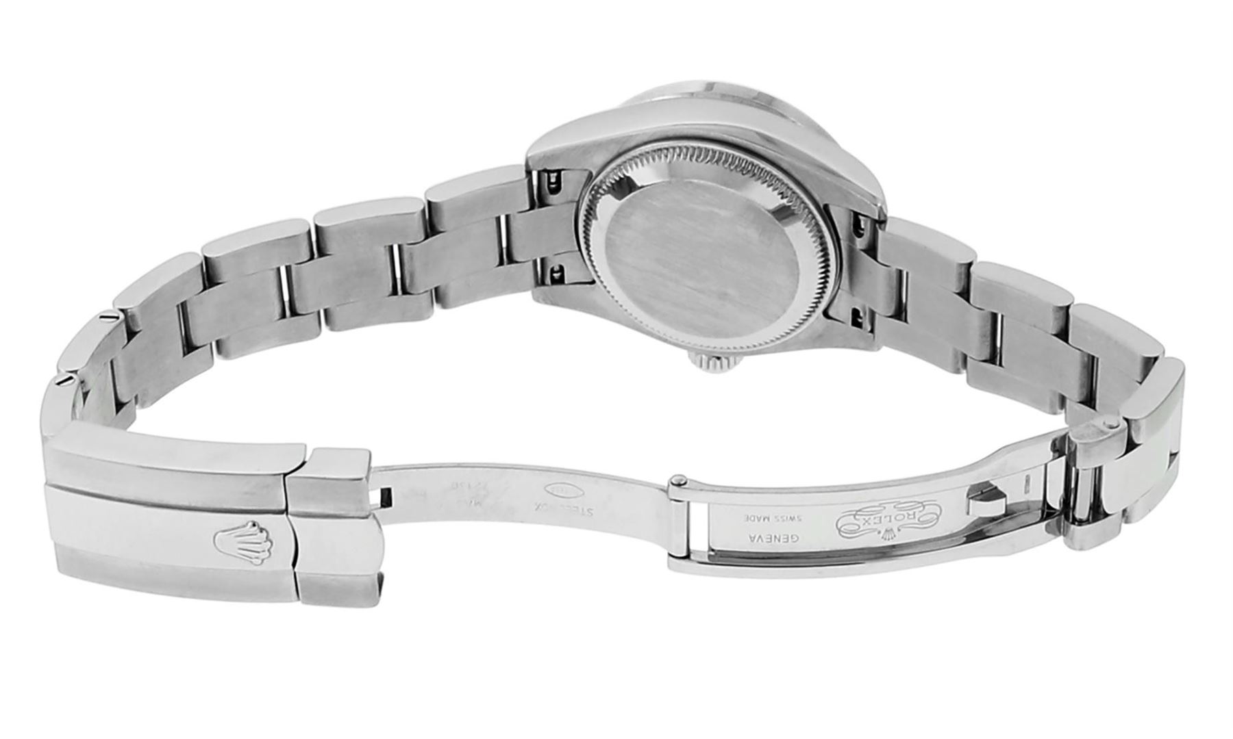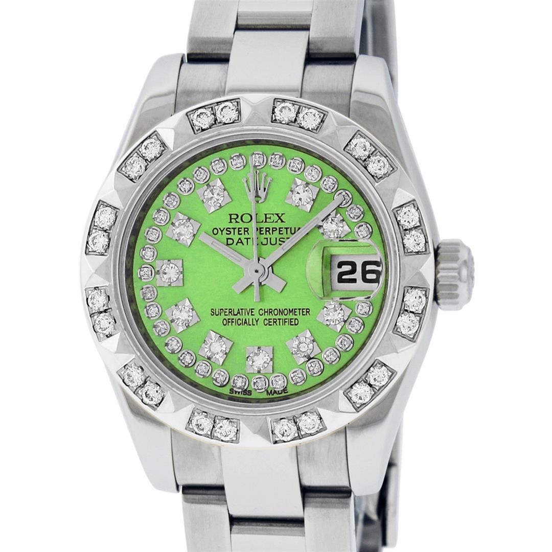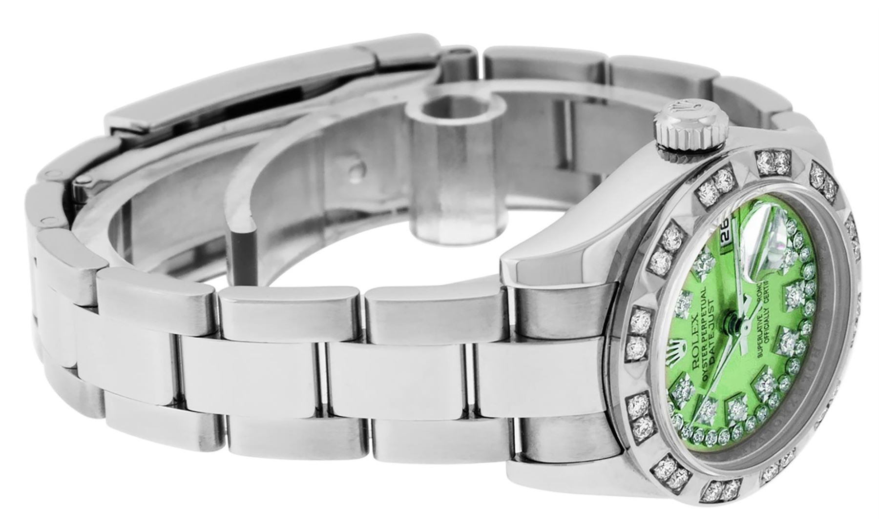 One Pre Owned Quickset Ladies Stainless Steel Rolex Datejust Polished Bright with Satin Finish, Serviced & Electronically Tested, Stainless Steel Case: 26mm, Stainless Steel Crown, Custom Bezel: New 18K White Gold Pyramid Diamond Bezel, Stone Count: 24 Diamonds On Bezel, Clarity: SI-VS, Color: G to H. Custom Crystal: New Sapphire With Date Window. Custom Hands: New Luminescent Hands. Rolex Movement: Automatic Winding Movement. Custom Dial: Refinished To Single Cut Green String Diamond Dial, 43 Diamonds in Dial, G To H In Color, Clarity: VS. Date Window: 3 O'clock Position Date Display, Model: Quickset Datejust. Condition: G-6 Extra Fine. Rolex Bracelet: Stainless Steel Oyster Band. Bright Polish & Satin Finish. 6.0 Inch Length, Adjustable. Standard Clasp, With Rolex Logo. This Watch Has Been Serviced Time Tested And Is In Excellent Condition It Is Free Of All Scratches And Dents.