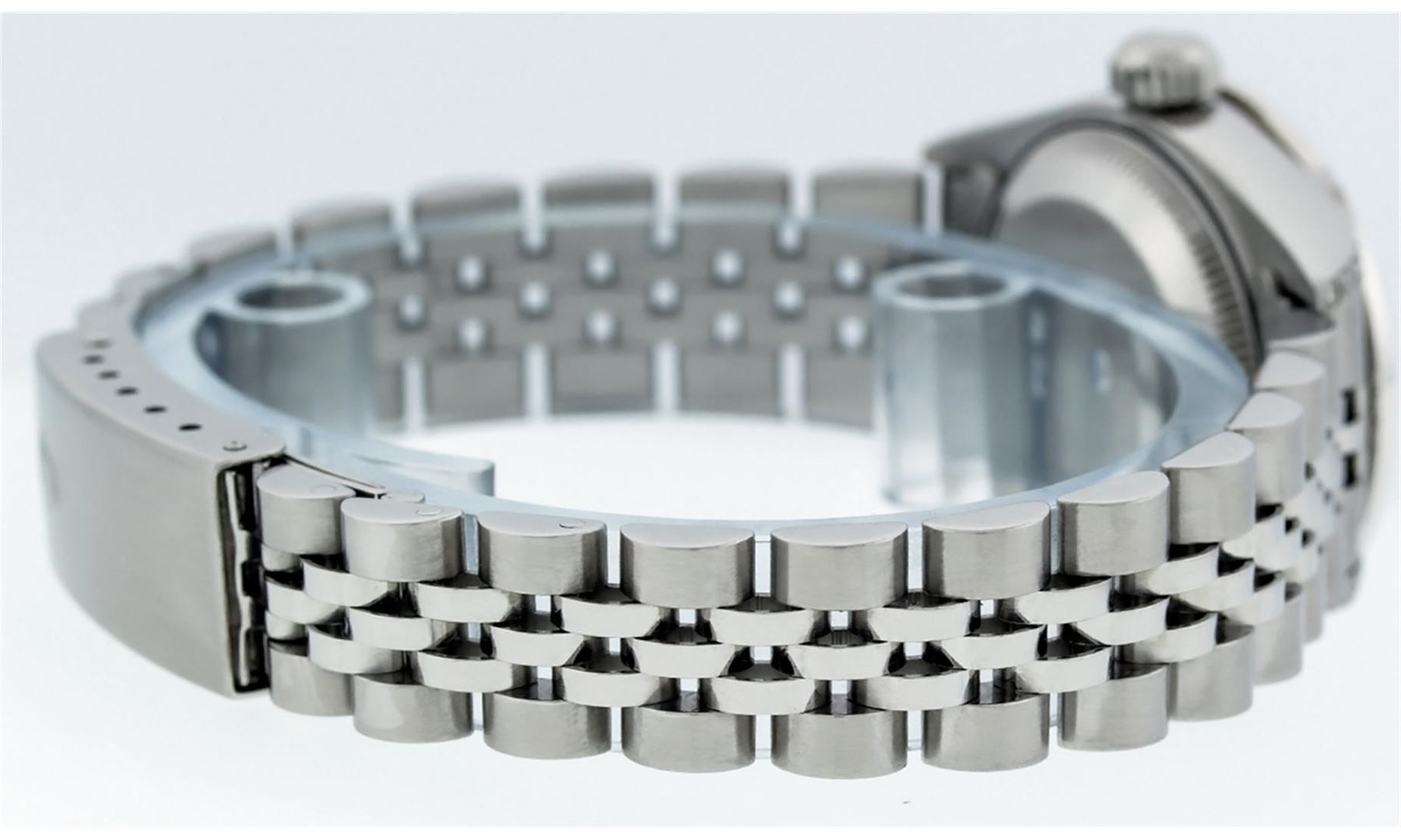 One Quickset Pre Owned Ladies Stainless Steel Rolex Datejust Polished Bright with Satin Finish, Serviced & Electronically Tested, Stainless Steel Case: 26mm, Stainless Steel Crown, Custom Diamond Lugs: 24 Diamonds On Lugs, Clarity: SI-VS, Color: G to H. C