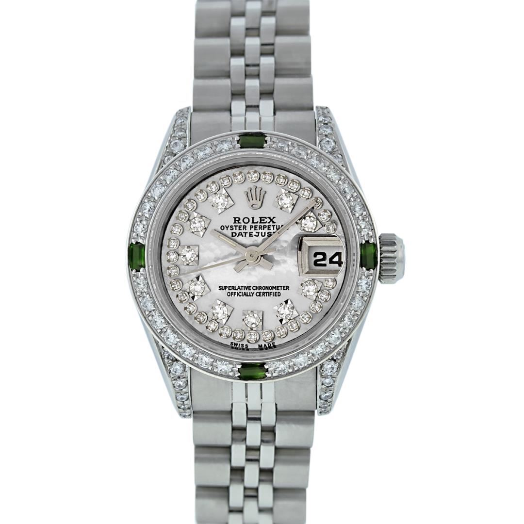 One Quickset Pre Owned Ladies Stainless Steel Rolex Datejust Polished Bright with Satin Finish, Serviced & Electronically Tested, Stainless Steel Case: 26mm, Stainless Steel Crown, Custom Diamond Lugs: 24 Diamonds On Lugs, Clarity: SI-VS, Color: G to H. C