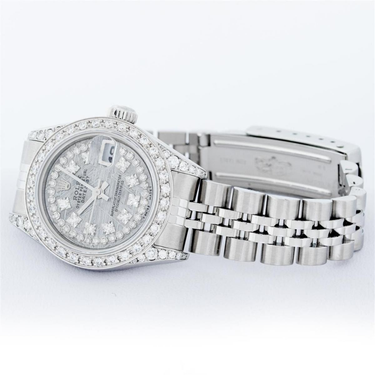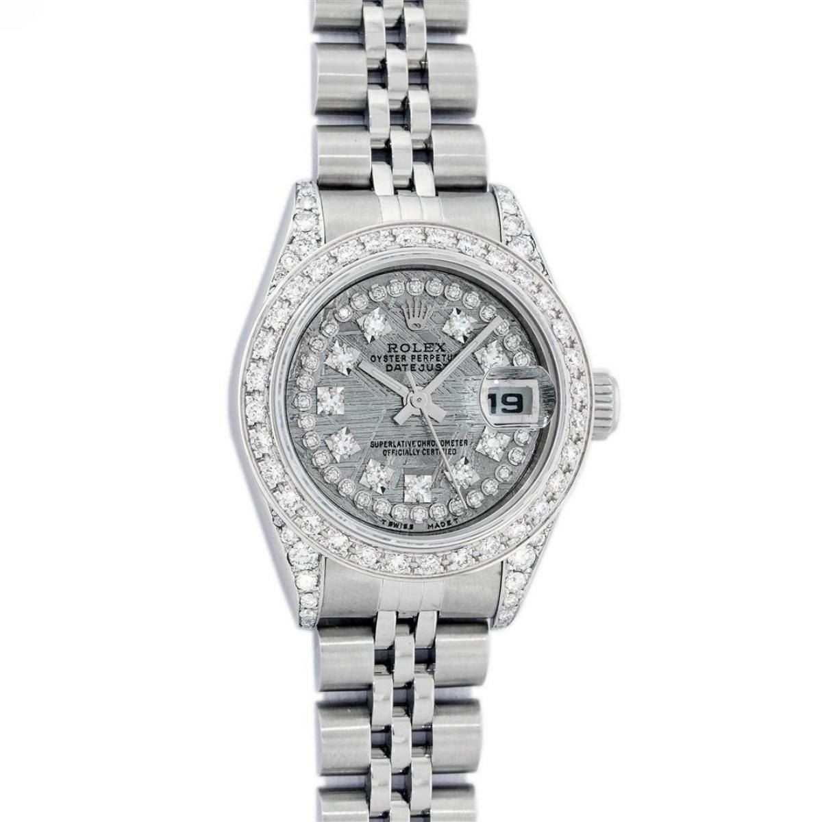 One Quickset Ladies Stainless Steel Rolex Datejust Polished Bright with Satin Finish, Serviced & Electronically Tested, Stainless Steel Case: 26mm, Stainless Steel Crown, Custom Diamond Lugs: 24 Diamonds On Lugs, Clarity: SI-VS, Color: G to H. Custom Bezel: New Stainless Steel Beadset Diamond Bezel, Stone Count: 39 Diamonds On Bezel, Total Weight .70 Carat, Clarity: SI-VS, Color: G to H. Custom Crystal: New Scratch Resistant Synthetic Sapphire Cyclops Lens. Custom Hands: New Luminescent Hands. Movement: Automatic Winding Movement. Custom Dial: Refinished Single Cut Meteorite String Diamond Dial, 43 Diamonds in Dial G To H In Color, Clarity: VS. Date Window: 3 O'Clock Position Date Display, Model: 79174 Quickset Datejust. Condition: G-6 Extra Fine. Bracelet: Stainless Steel Jubilee Band. Bright Polish & Satin Finish. 6.0 Inch Length, Adjustable. Standard Clasp, With Rolex Logo. This Watch Has Been Serviced Time Tested And Is In Excellent Condition It Is Free Of All Scratches And Dents.