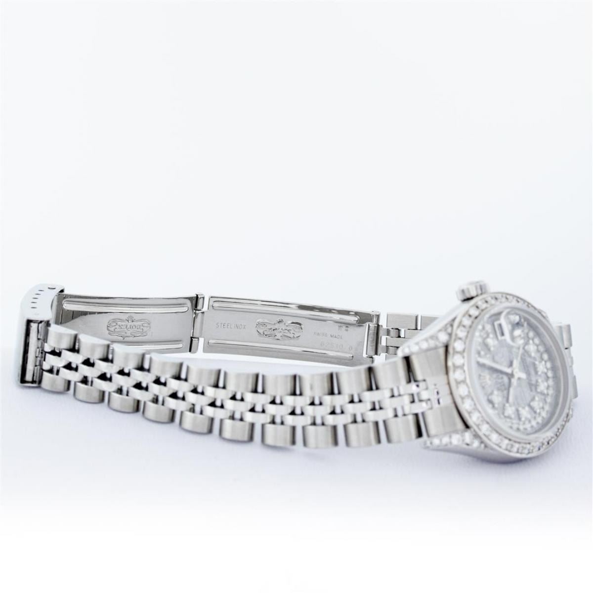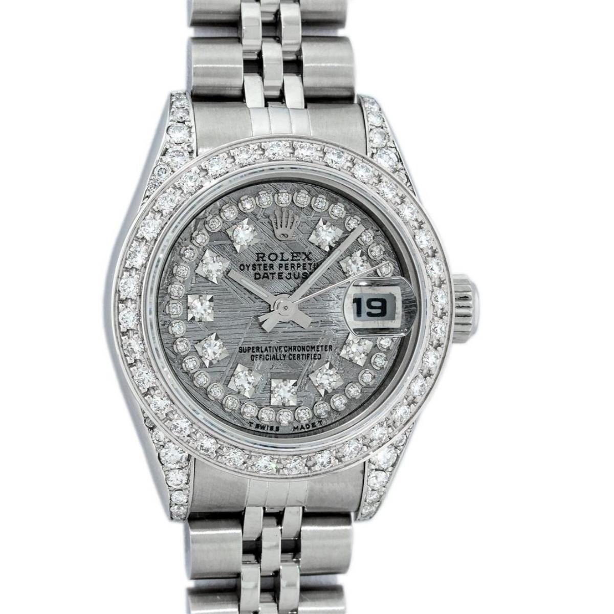 One Quickset Ladies Stainless Steel Rolex Datejust Polished Bright with Satin Finish, Serviced & Electronically Tested, Stainless Steel Case: 26mm, Stainless Steel Crown, Custom Diamond Lugs: 24 Diamonds On Lugs, Clarity: SI-VS, Color: G to H. Custom Bezel: New Stainless Steel Beadset Diamond Bezel, Stone Count: 39 Diamonds On Bezel, Total Weight .70 Carat, Clarity: SI-VS, Color: G to H. Custom Crystal: New Scratch Resistant Synthetic Sapphire Cyclops Lens. Custom Hands: New Luminescent Hands. Movement: Automatic Winding Movement. Custom Dial: Refinished Single Cut Meteorite String Diamond Dial, 43 Diamonds in Dial G To H In Color, Clarity: VS. Date Window: 3 O'Clock Position Date Display, Model: 79174 Quickset Datejust. Condition: G-6 Extra Fine. Bracelet: Stainless Steel Jubilee Band. Bright Polish & Satin Finish. 6.0 Inch Length, Adjustable. Standard Clasp, With Rolex Logo. This Watch Has Been Serviced Time Tested And Is In Excellent Condition It Is Free Of All Scratches And Dents.