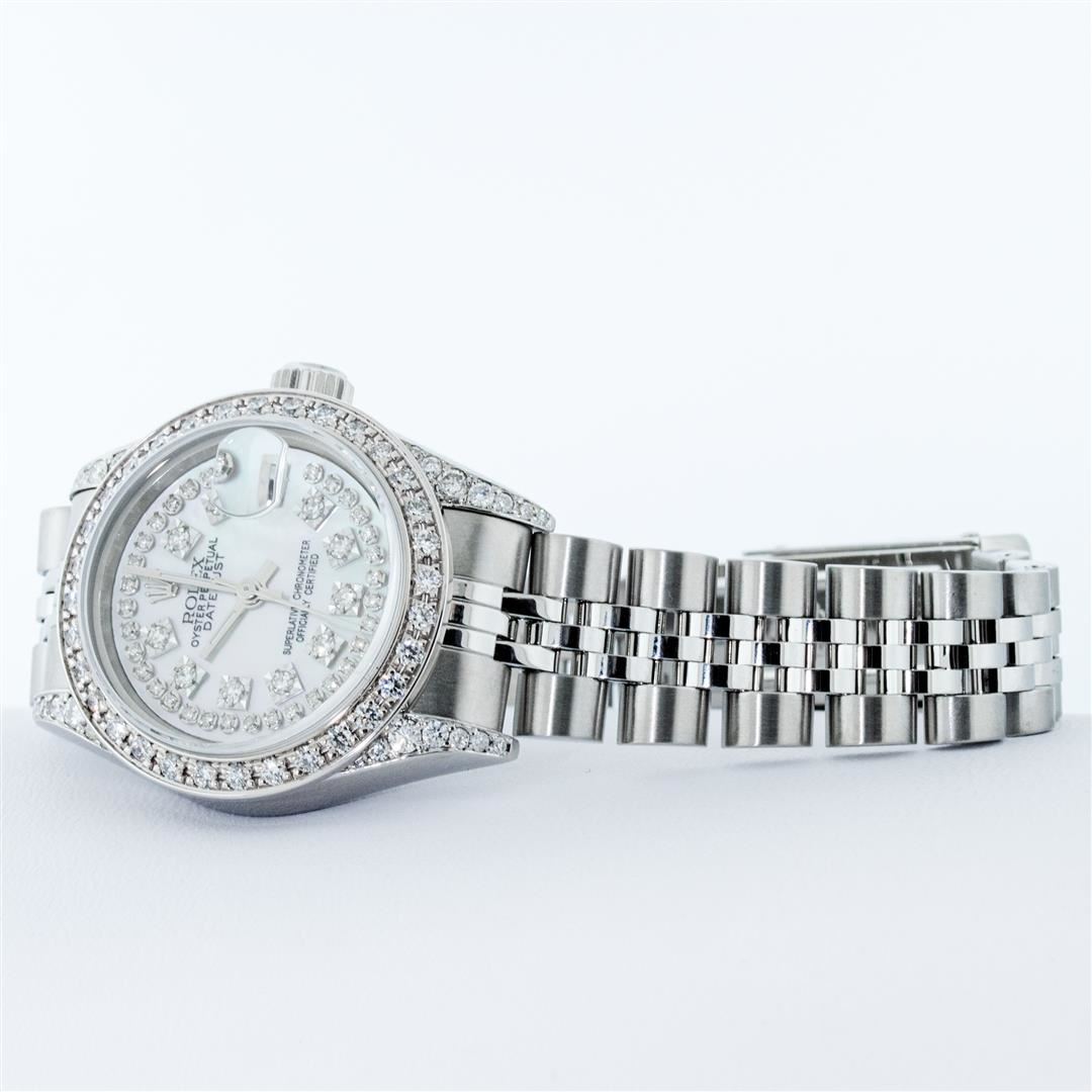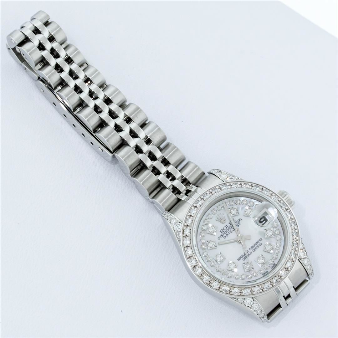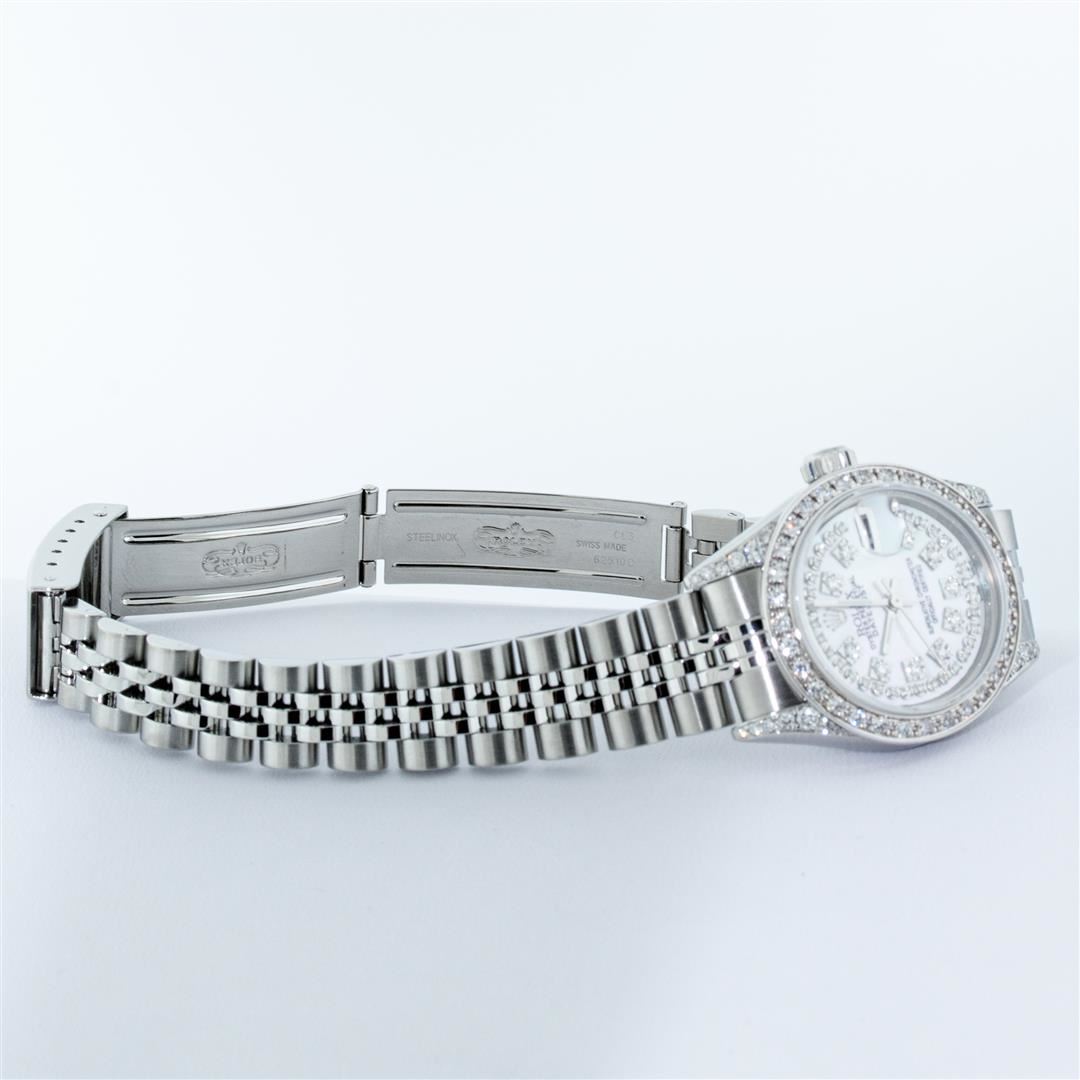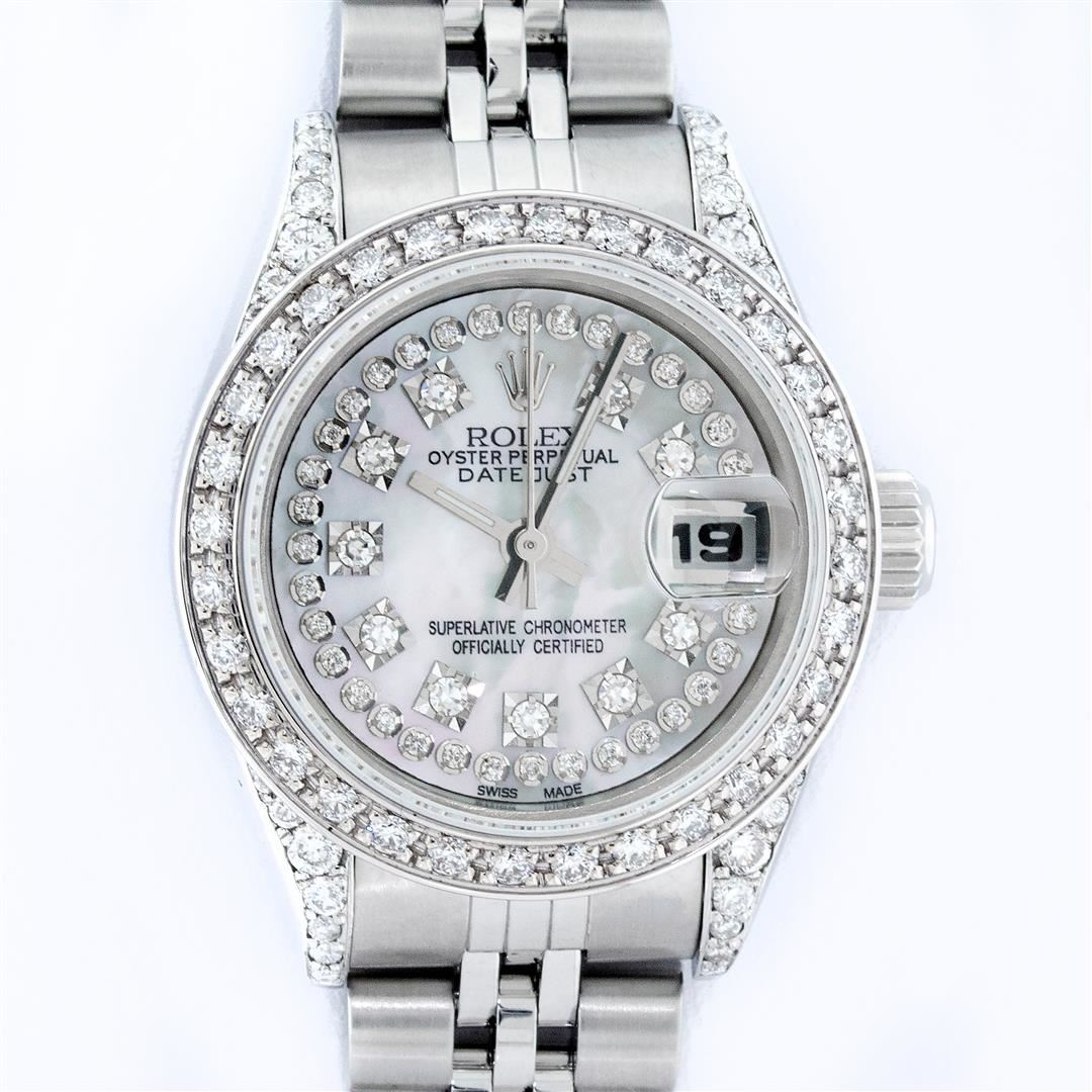 One Quickset Ladies Stainless Steel Rolex Oyster Perpetual Datejust Polished Bright with Satin Finish, Serviced & Electronically Tested, Stainless Steel Case: 26mm, Stainless Steel Crown, Custom Diamond Lugs: 24 Diamonds On Lugs, Clarity: SI-VS, Color: G to H. Custom Bezel: New Stainless Steel Beadset Diamond Bezel, Stone Count: 39 Diamonds On Bezel, Total Weight .70 Carat, Clarity: SI-VS, Color: G to H. Custom Crystal: New Scratch Resistant Synthetic Sapphire Cyclops Lens. Custom Hands: New Luminescent Hands. Movement: Automatic Winding Movement. Custom Dial: Refinished Single Cut Mother Of Pearl String Diamond Dial, 43 Diamonds in Dial G To H In Color, Clarity: VS. Date Window: 3 O'Clock Position Date Display, Model: Quickset Datejust Caliber 2230. Condition: G-6 Extra Fine. Bracelet: Stainless Steel Jubilee Band. Bright Polish & Satin Finish. 6.0 Inch Length, Adjustable. Standard Clasp, With Rolex Logo. This Watch Has Been Serviced Time Tested And Is In Excellent Condition It Is Free Of All Scratches And Dents. This Watch Comes With A Rolex Box.
