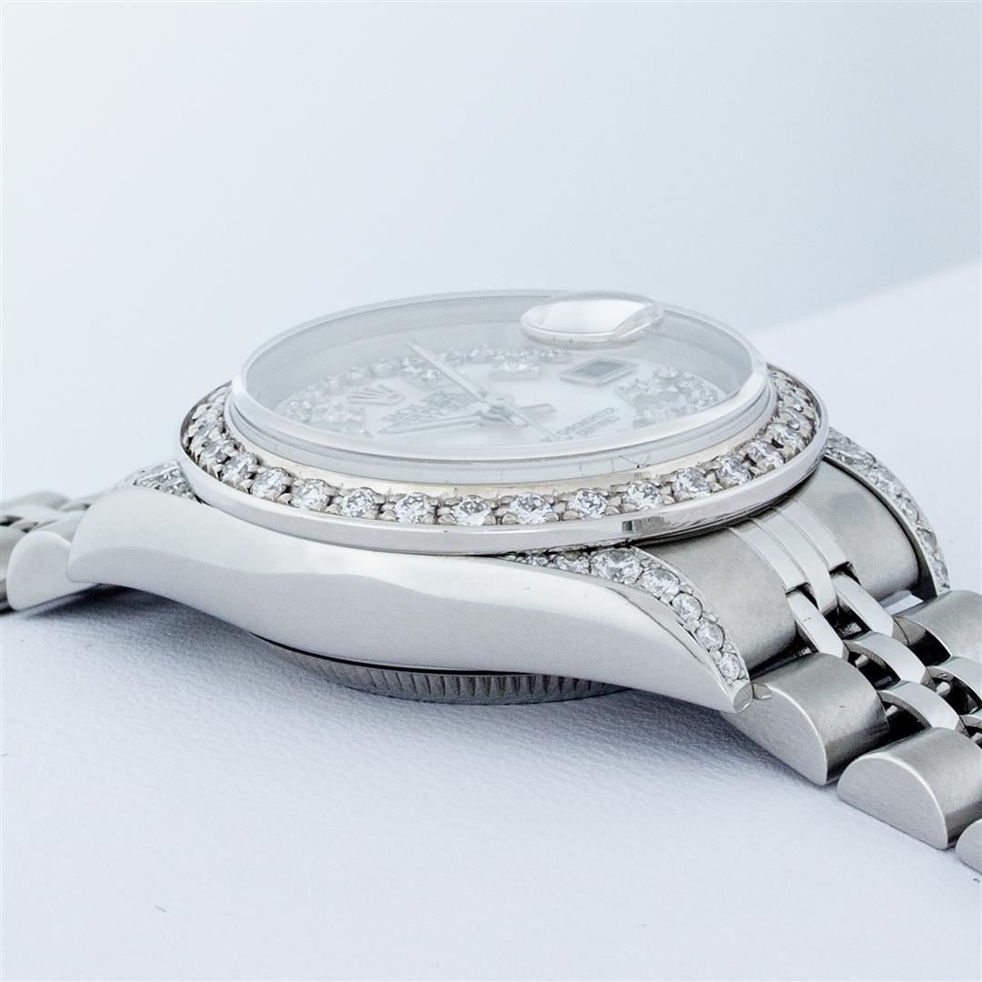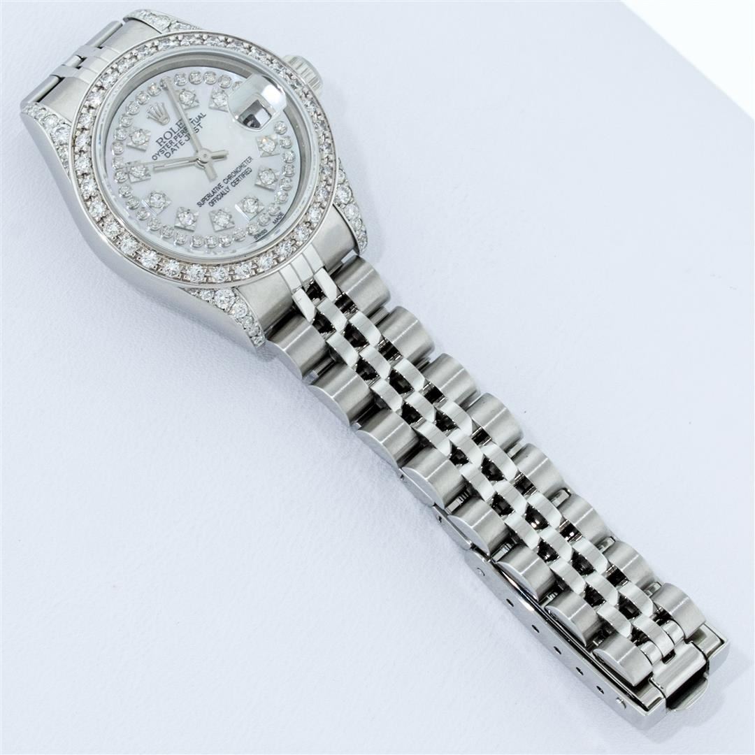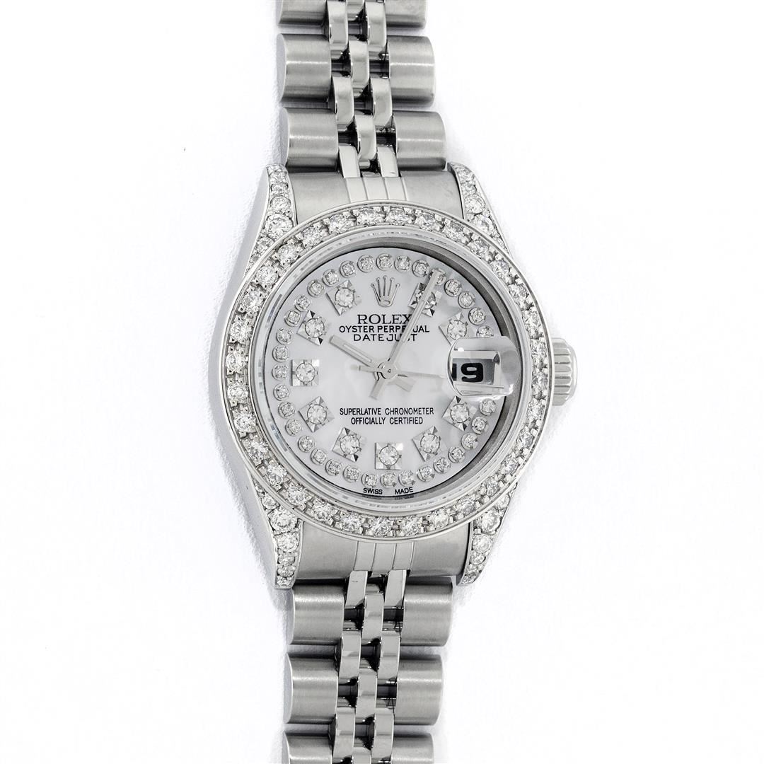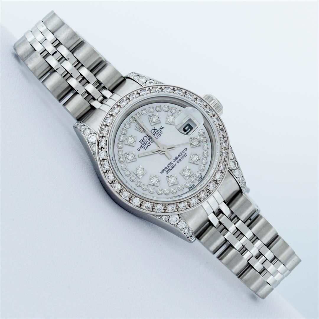 One Quickset Ladies Stainless Steel Rolex Oyster Perpetual Datejust Polished Bright with Satin Finish, Serviced & Electronically Tested, Stainless Steel Case: 26mm, Stainless Steel Crown, Custom Diamond Lugs: 24 Diamonds On Lugs, Clarity: SI-VS, Color: G to H. Custom Bezel: New Stainless Steel Beadset Diamond Bezel, Stone Count: 39 Diamonds On Bezel, Total Weight .70 Carat, Clarity: SI-VS, Color: G to H. Custom Crystal: New Scratch Resistant Synthetic Sapphire Cyclops Lens. Custom Hands: New Luminescent Hands. Movement: Automatic Winding Movement. Custom Dial: Refinished Single Cut Mother Of Pearl String Diamond Dial, 43 Diamonds in Dial G To H In Color, Clarity: VS. Date Window: 3 O'Clock Position Date Display, Model: Quickset Datejust Caliber 2230. Condition: G-6 Extra Fine. Bracelet: Stainless Steel Jubilee Band. Bright Polish & Satin Finish. 6.0 Inch Length, Adjustable. Standard Clasp, With Rolex Logo. This Watch Has Been Serviced Time Tested And Is In Excellent Condition It Is Free Of All Scratches And Dents. This Watch Comes With A Rolex Box.
