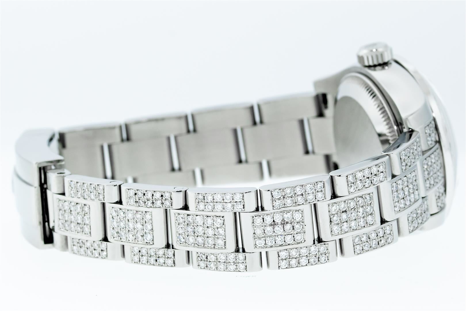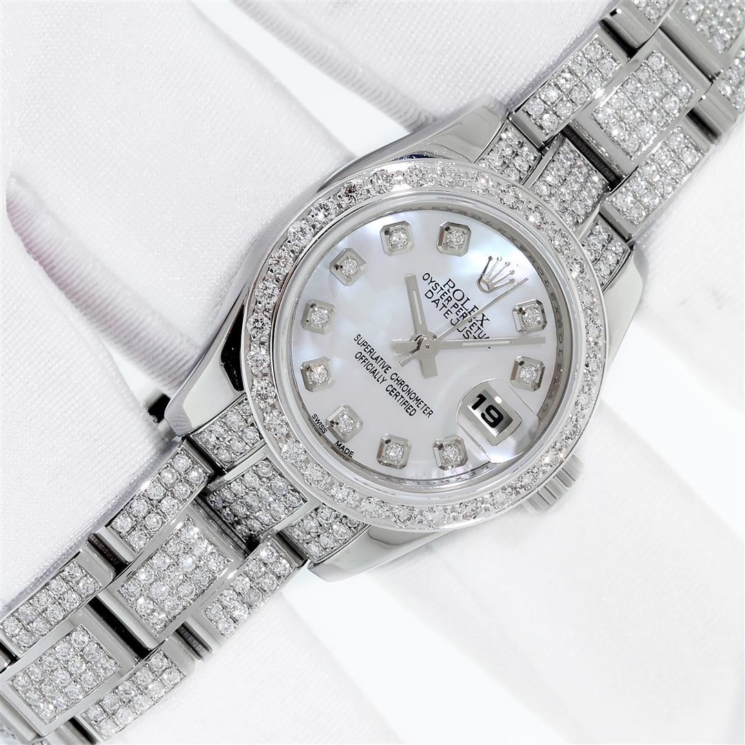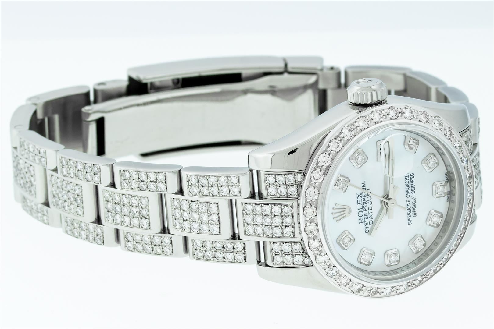 One Quickset Ladies Stainless Steel Rolex Datejust Polished Bright with Satin Finish, Serviced & Electronically Tested, Stainless Steel Case: 26mm, Stainless Steel Crown, Custom Bezel: New 18K White Gold Diamond Bezel, Stone Count: 32 Diamonds On Bezel, Total Weight .70 Carat, Clarity: SI-VS, Color: G to H. Custom Crystal: New Scratch Resistant Synthetic Sapphire Cyclops Lens. Custom Hands: New Luminescent Hands. Movement: Automatic Winding Movement. Custom Dial: Mother Of Pearl Diamond Dial, Stone Count: 10 Diamonds On Dial, G To H In Color, Clarity: VS2. Date Window: 3 O'Clock Position Date Display, Model: 179160 Quickjset Datejust. Condition: G-6 Extra Fine. Bracelet: Stainless Steel Oyster Band set with Round Diamonds. Bright Polish & Satin Finish. 6.0 Inch Length, Adjustable. Standard Clasp, With Rolex Logo. This Watch Has Been Serviced Time Tested And Is In Excellent Condition It Is Free Of All Scratches And Dents.