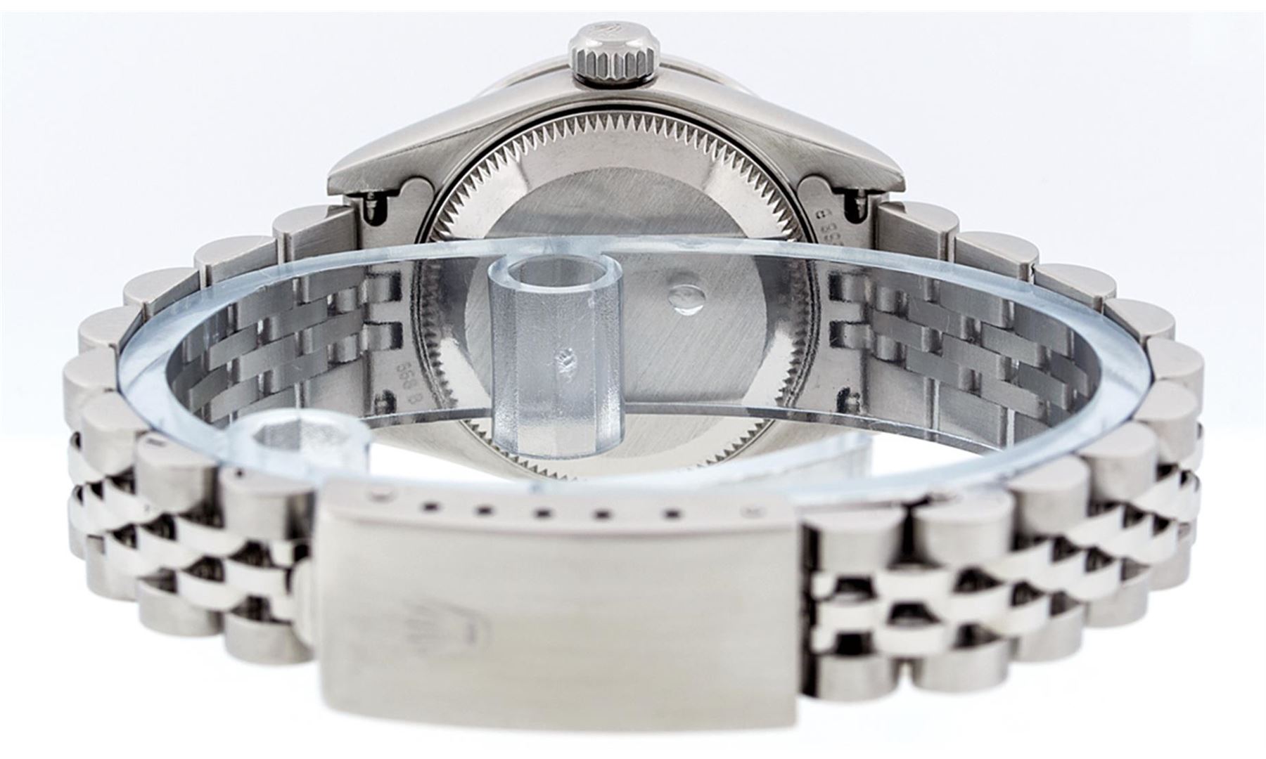 One Quickset Ladies Stainless Steel Rolex Datejust Polished Bright with Satin Finish, Serviced & Electronically Tested, Stainless Steel Case: 26mm, Stainless Steel Crown, Custom Diamond Lugs: 24 Diamonds On Lugs, Clarity: SI-VS, Color: G to H. Custom Bezel: New 18K White Gold Beadset Diamond Bezel, Stone Count: 32 Diamonds On Bezel, Clarity: SI-VS, Color: G to H. Custom Crystal: New Sapphire With Date Window. Custom Hands: New Luminescent Hands. Rolex Movement: Automatic Winding Movement. Custom Dial: Refinished To Orange With Custom Added String Diamonds, 43 Diamonds in Dial G To H In Color, Clarity: VS. Date Window: 3 O'Clock Position Date Display, Model: 79174 Quickjset Datejust. Condition: G-6 Extra Fine. Rolex Bracelet: Stainless Steel Jubilee Band. Bright Polish & Satin Finish. 6.0 Inch Length, Adjustable. Standard Clasp, With Rolex Logo. This Pre Owned Watch Has Been Serviced Time Tested And Is In Excellent Condition It Is Free Of All Scratches And Dents.