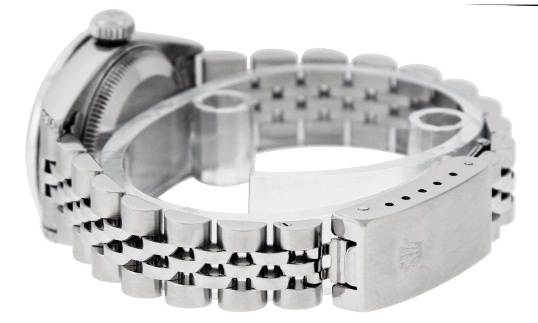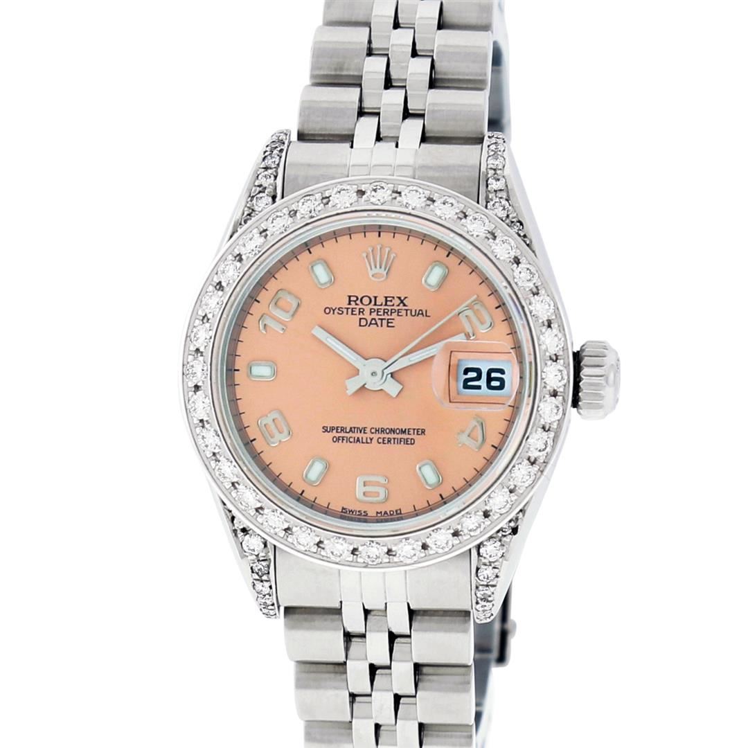 One Quickset Pre Owned Ladies Stainless Steel Rolex Date Polished Bright with Satin Finish, Serviced & Electronically Tested, Rolex Stainless Steel Case: 26mm, Rolex Stainless Steel Crown, Custom Diamond Lugs: 24 Diamonds On Lugs, Clarity: SI-VS, Color: G to H. Custom Bezel: New 18K White Gold Beadset Diamond Bezel, Stone Count: 32 Diamonds On Bezel, Total Weight.70 Carat, Clarity: SI-VS, Color: G to H. Custom Crystal: New Sapphire With Magnified Date Window. Custom Hands: New Luminescent Hands. Rolex Movement: Automatic Winding 2235 Movement. Rolex Dial: Salmon Arabic With Dash Track, Date Window: 3 O'Clock Position Date Display, Model: Sapphire Quickset Date. Condition: G-6 Extra Fine. Rolex Bracelet: Stainless Steel Jubilee Band. Bright Polish & Satin Finish. 6.0 Inch Length, Adjustable. Standard Clasp, With Rolex Logo. This Watch Has Been Serviced Time Tested And Is In Excellent Condition It Is Free Of All Scratches And Dents.