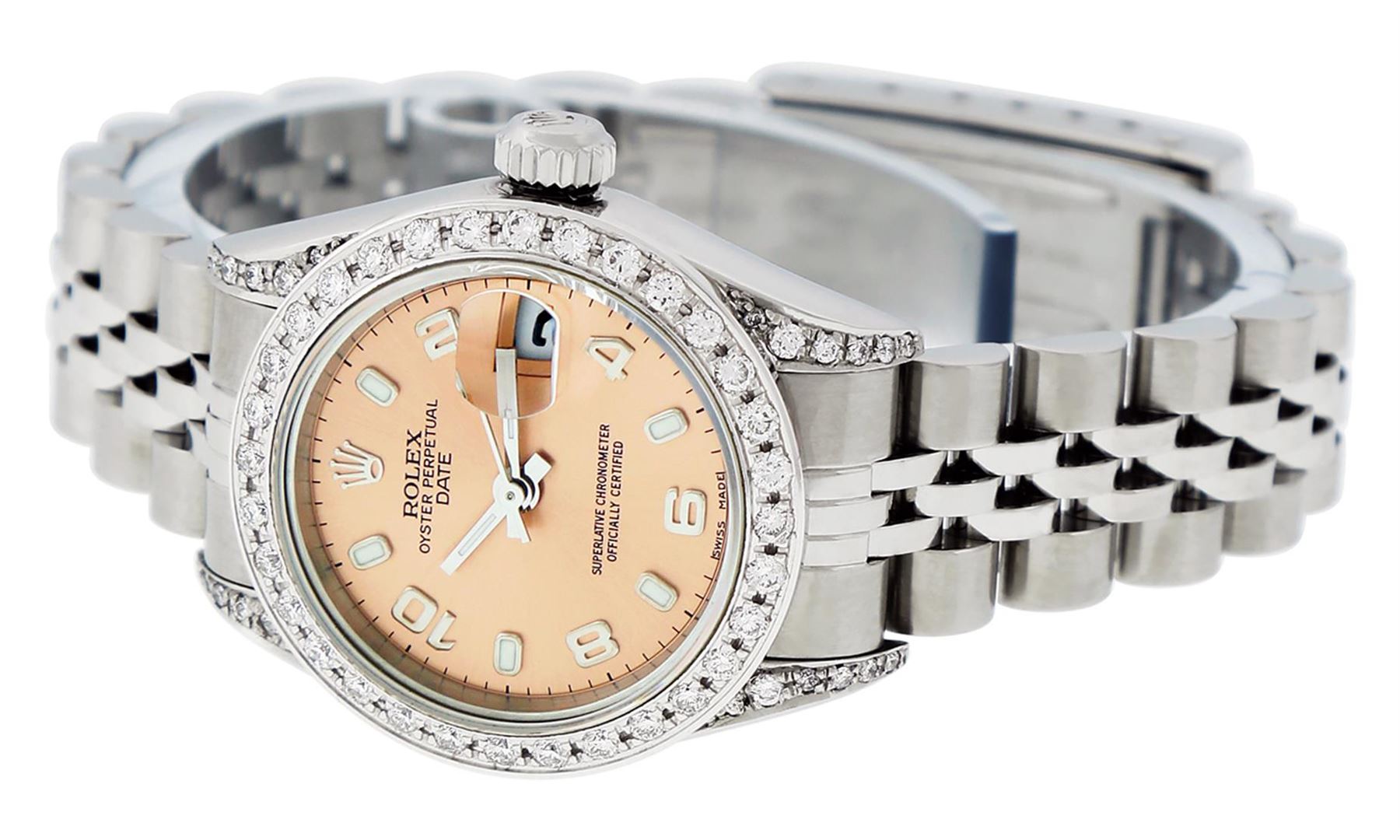 One Quickset Pre Owned Ladies Stainless Steel Rolex Date Polished Bright with Satin Finish, Serviced & Electronically Tested, Rolex Stainless Steel Case: 26mm, Rolex Stainless Steel Crown, Custom Diamond Lugs: 24 Diamonds On Lugs, Clarity: SI-VS, Color: G to H. Custom Bezel: New 18K White Gold Beadset Diamond Bezel, Stone Count: 32 Diamonds On Bezel, Total Weight.70 Carat, Clarity: SI-VS, Color: G to H. Custom Crystal: New Sapphire With Magnified Date Window. Custom Hands: New Luminescent Hands. Rolex Movement: Automatic Winding 2235 Movement. Rolex Dial: Salmon Arabic With Dash Track, Date Window: 3 O'Clock Position Date Display, Model: Sapphire Quickset Date. Condition: G-6 Extra Fine. Rolex Bracelet: Stainless Steel Jubilee Band. Bright Polish & Satin Finish. 6.0 Inch Length, Adjustable. Standard Clasp, With Rolex Logo. This Watch Has Been Serviced Time Tested And Is In Excellent Condition It Is Free Of All Scratches And Dents.