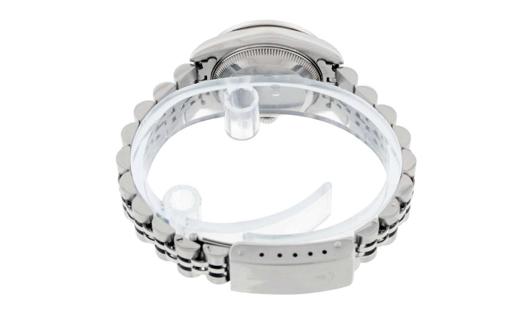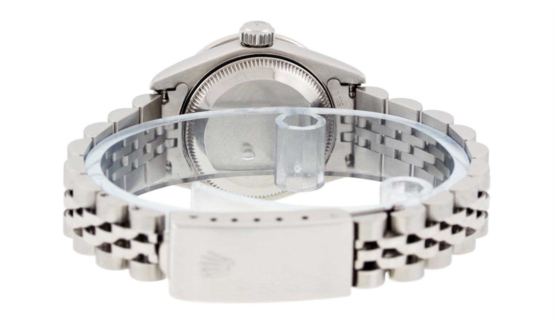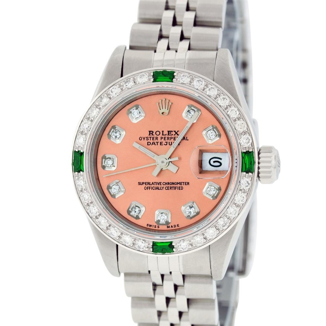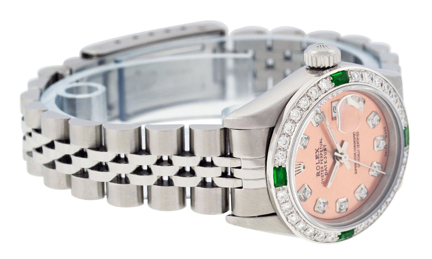 One Quickset Ladies Pre Owned Stainless Steel Rolex Datejust Polished Bright with Satin Finish, Serviced & Electronically Tested, Stainless Steel Case: 26mm, Stainless Steel Crown, Custom Bezel: New 18K White Gold Diamond + Emerald Beadset Diamond Bezel,