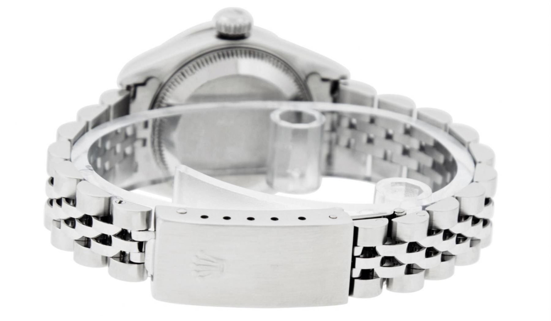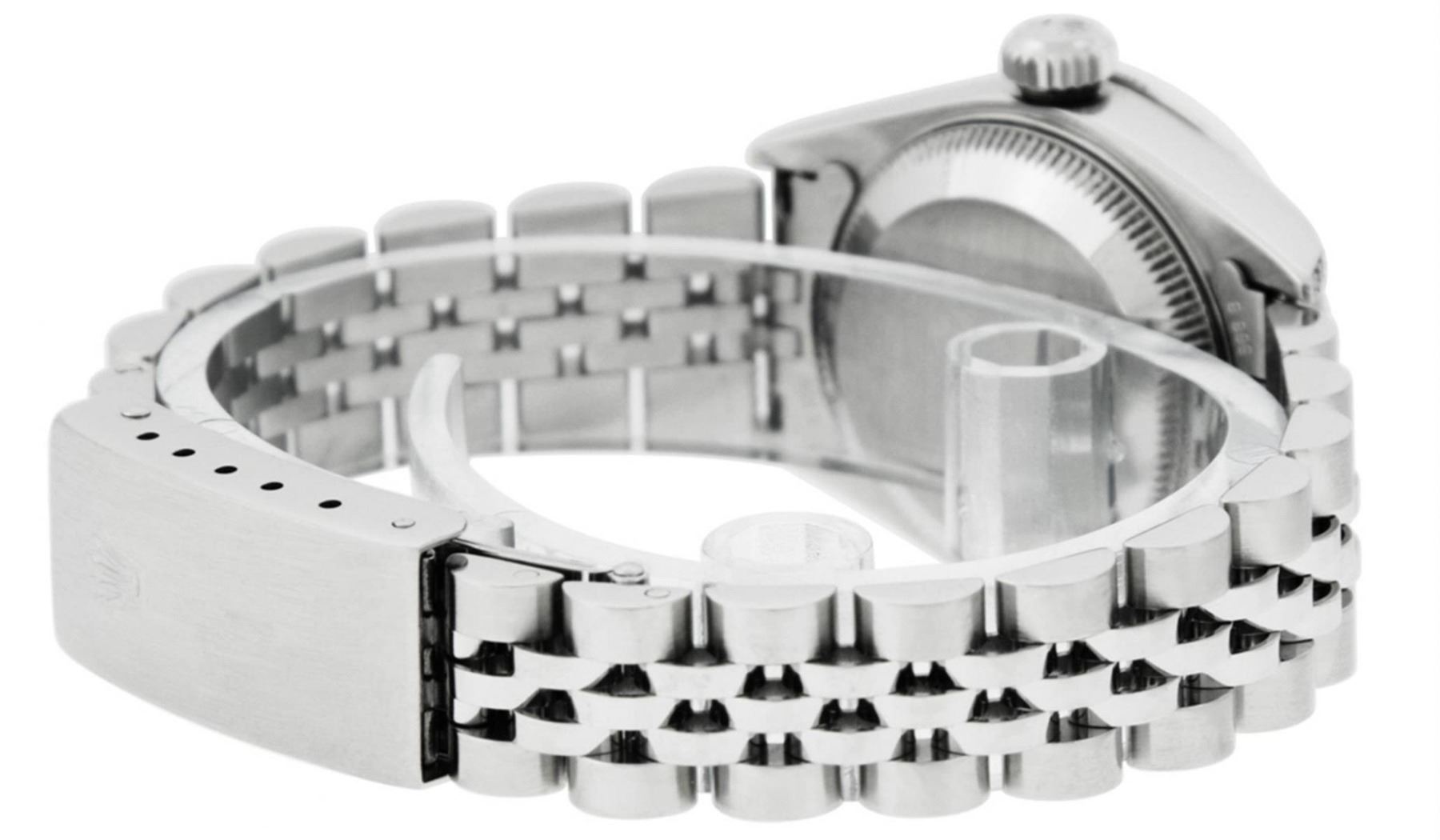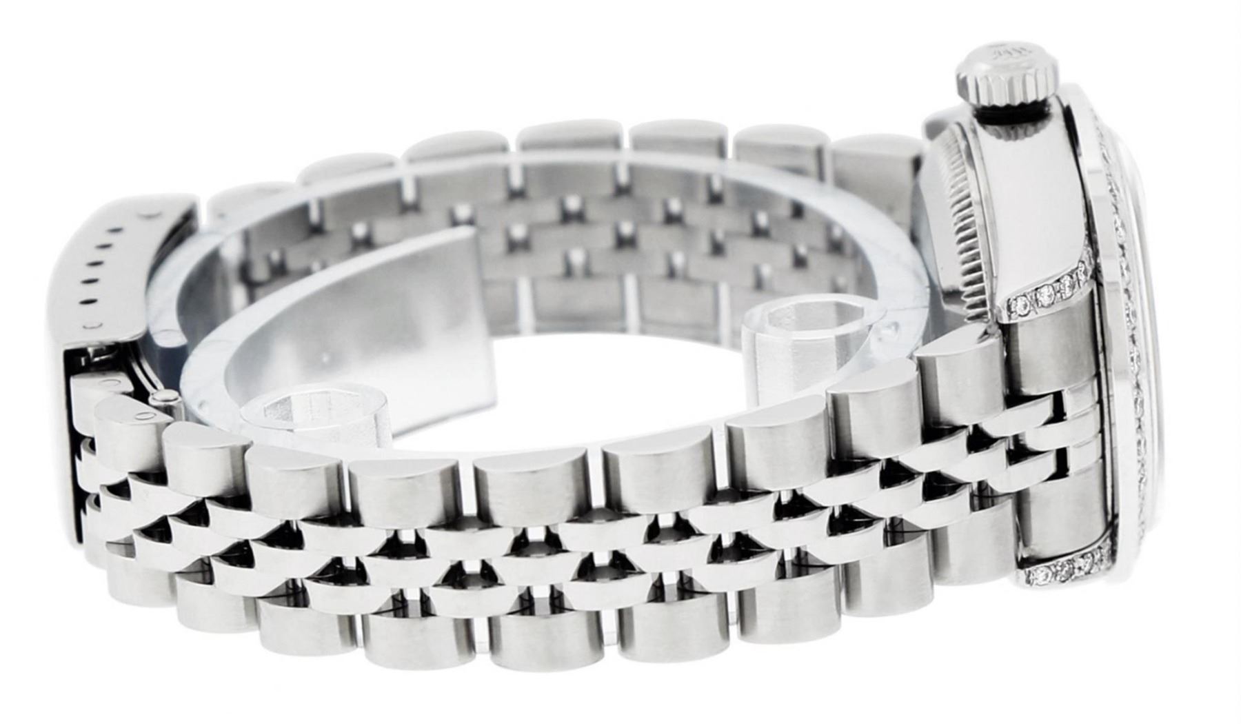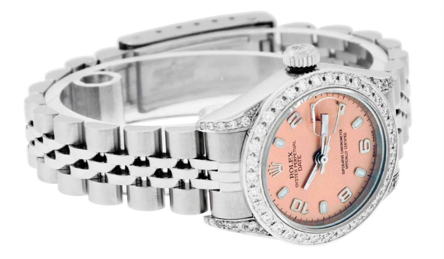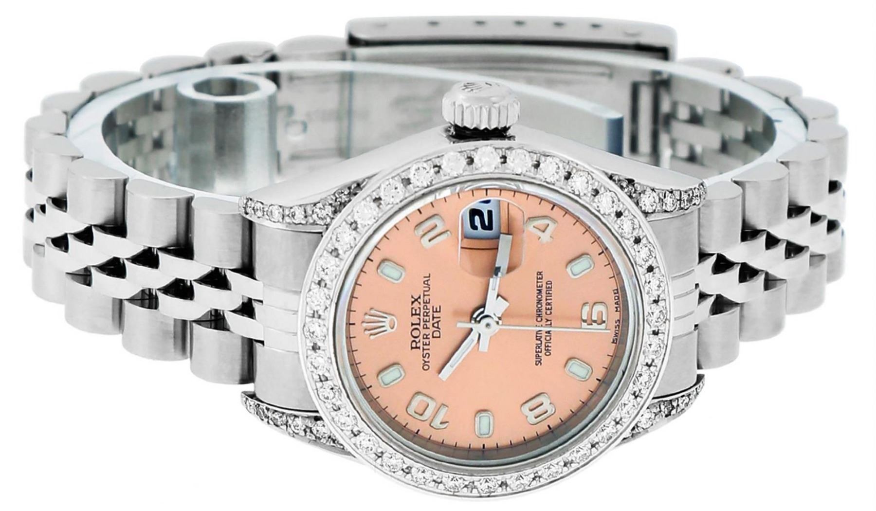 One Quickset Ladies Stainless Steel Rolex Datejust Polished Bright with Satin Finish, Serviced & Electronically Tested, Stainless Steel Case: 26mm, Stainless Steel Crown, Custom Diamond Lugs: 24 Diamonds On Lugs, Clarity: SI-VS, Color: G to H. Custom Bezel: New 18K White Gold Beadset Diamond Bezel, Stone Count: 32 Diamonds On Bezel, Total Weight .70 Carat, Clarity: SI-VS, Color: G to H. Custom Crystal: New Scratch Resistant Synthetic Sapphire Cyclops Lens. Custom Hands: New Luminescent Hands. Movement: Automatic Winding Movement . Dial: Salmon Arabic With Dash Track, Date Window: 3 O'Clock Position Date Display, Model: Sapphire Quickjset Datejust. Condition: G-6 Extra Fine. Bracelet: Stainless Steel Jubilee Band. Bright Polish & Satin Finish. 6.0 Inch Length, Adjustable. Standard Clasp, With Rolex Logo. This Watch Has Been Serviced Time Tested And Is In Excellent Condition It Is Free Of All Scratches And Dents.