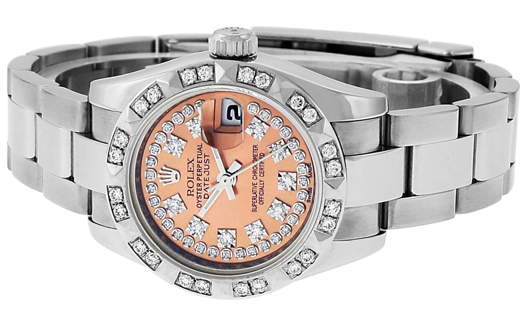 One Quickset Pre Owned Ladies Stainless Steel Rolex Datejust Polished Bright with Satin Finish, Serviced And Electronically Tested, Stainless Steel Case: 26mm, Stainless Steel Crown, Custom Bezel: New 18K White Gold Pyramid Diamond Bezel, Stone Count: 24 Diamonds On Bezel. Crystal: Sapphire With Date Window. Custom Hands: New Luminescent Hands. Rolex Movement: Automatic Winding Movement 2235. Custom Dial: Custom Salmon Dial With Added Diamond Hour Markers, 43 Diamonds On Dial. Date Window: 3 O'Clock Position Date Display, Model: Quickset Sapphire Datejust. Condition: G-6 Extra Fine. Rolex Bracelet: Stainless Steel Oyster Band. Bright Polish And Satin Finish. 6.0 Inch Length, Adjustable. Standard Clasp, With Rolex Logo. This Watch Has Been Serviced Time Tested And Is In Excellent Condition It Is Free Of All Scratches And Dents.