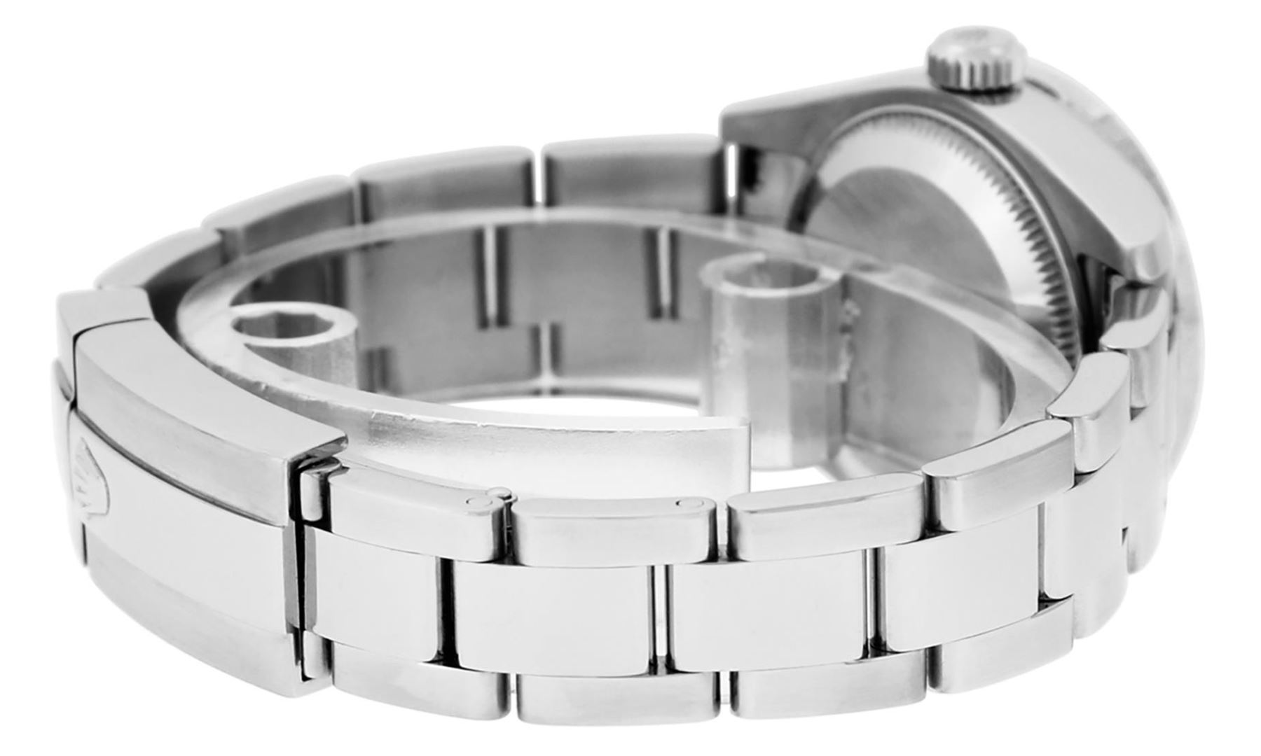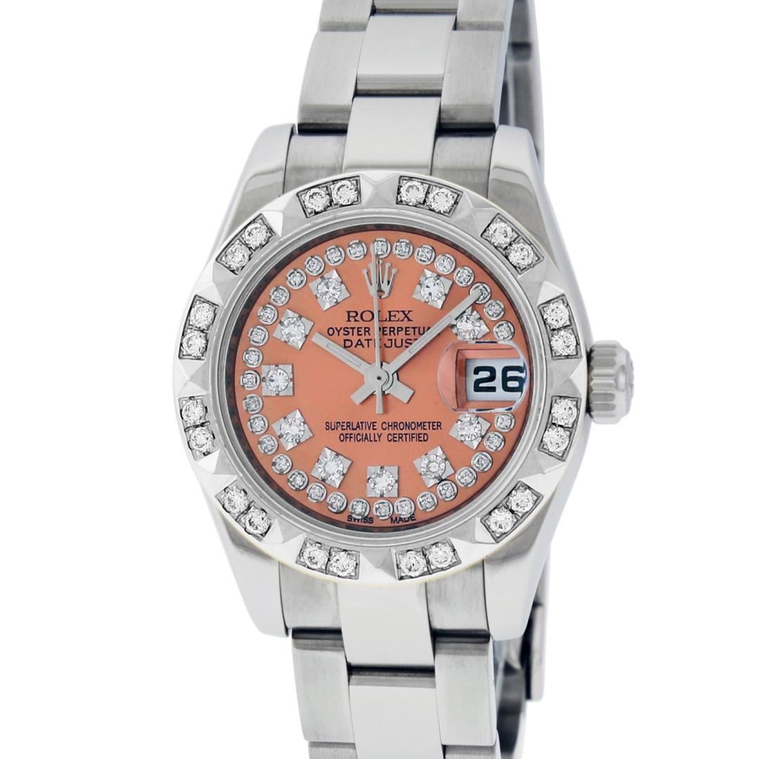 One Quickset Pre Owned Ladies Stainless Steel Rolex Datejust Polished Bright with Satin Finish, Serviced And Electronically Tested, Stainless Steel Case: 26mm, Stainless Steel Crown, Custom Bezel: New 18K White Gold Pyramid Diamond Bezel, Stone Count: 24 Diamonds On Bezel. Crystal: Sapphire With Date Window. Custom Hands: New Luminescent Hands. Rolex Movement: Automatic Winding Movement 2235. Custom Dial: Custom Salmon Dial With Added Diamond Hour Markers, 43 Diamonds On Dial. Date Window: 3 O'Clock Position Date Display, Model: Quickset Sapphire Datejust. Condition: G-6 Extra Fine. Rolex Bracelet: Stainless Steel Oyster Band. Bright Polish And Satin Finish. 6.0 Inch Length, Adjustable. Standard Clasp, With Rolex Logo. This Watch Has Been Serviced Time Tested And Is In Excellent Condition It Is Free Of All Scratches And Dents.
