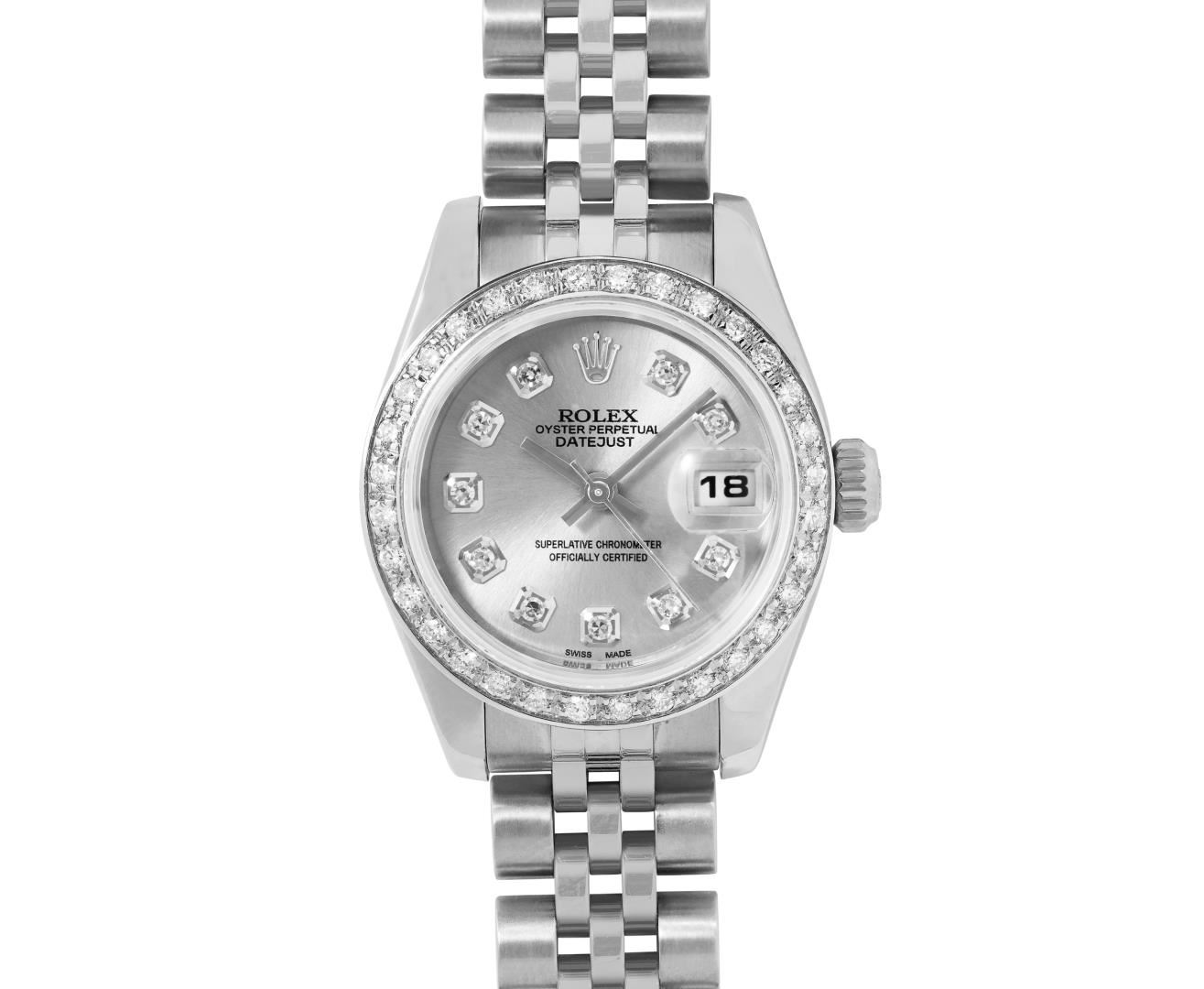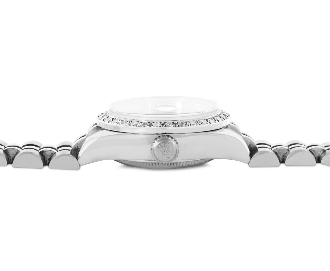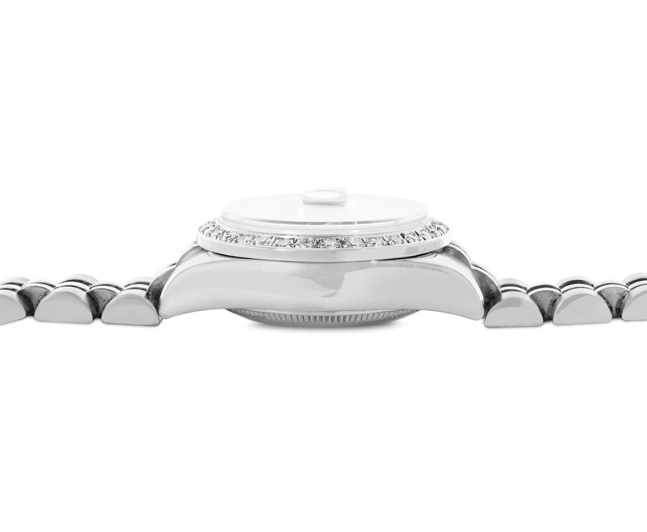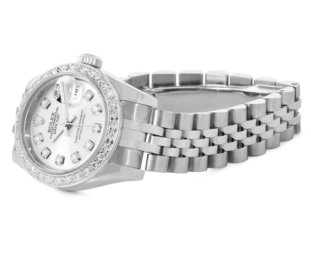 One Rolex Ladies Rolex Quickset Pre Owned Stainless Steel Datejust Wristwatch Polished Bright with Satin Finish, Serviced And Electronically Tested, Stainless Steel Case: 26mm, Stainless Steel Crown, Custom Bezel: New 18K White Gold Beadset Diamond Bezel, Diamond Count: 32 Diamonds. Crystal: Sapphire With Magnified Date Window. Hands: Non Luminescent Hands. Rolex Movement: 2235 Automatic Winding Movement 2235. Custom Dial: Custom Silver Dial With Added Diamond Hour Markers, Diamond Count: 10 Diamonds On Dial. Date Window: 3 O'Clock Position Date Display, Model: Quickset Datejust. Condition: G-6 Extra Fine. Rolex Bracelet: Stainless Steel Jubilee Band. Bright Polish And Satin Finish. 6.0 Inch Length, Adjustable. Hidden Clasp, With Rolex Logo. This Watch Has Been Serviced And Time Tested. It Is In Excellent Condition, Free Of All Scratches And Dents. This Watch Comes With A Rolex Box.