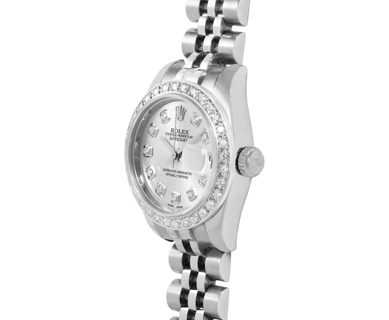 One Rolex Ladies Rolex Quickset Pre Owned Stainless Steel Datejust Wristwatch Polished Bright with Satin Finish, Serviced And Electronically Tested, Stainless Steel Case: 26mm, Stainless Steel Crown, Custom Bezel: New 18K White Gold Beadset Diamond Bezel, Diamond Count: 32 Diamonds. Crystal: Sapphire With Magnified Date Window. Hands: Non Luminescent Hands. Rolex Movement: 2235 Automatic Winding Movement 2235. Custom Dial: Custom Silver Dial With Added Diamond Hour Markers, Diamond Count: 10 Diamonds On Dial. Date Window: 3 O'Clock Position Date Display, Model: Quickset Datejust. Condition: G-6 Extra Fine. Rolex Bracelet: Stainless Steel Jubilee Band. Bright Polish And Satin Finish. 6.0 Inch Length, Adjustable. Hidden Clasp, With Rolex Logo. This Watch Has Been Serviced And Time Tested. It Is In Excellent Condition, Free Of All Scratches And Dents. This Watch Comes With A Rolex Box.