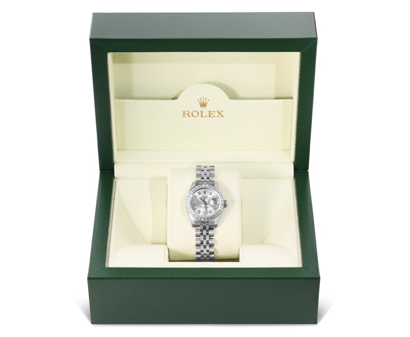 One Rolex Ladies Rolex Quickset Pre Owned Stainless Steel Datejust Wristwatch Polished Bright with Satin Finish, Serviced And Electronically Tested, Stainless Steel Case: 26mm, Stainless Steel Crown, Custom Bezel: New 18K White Gold Beadset Diamond Bezel, Diamond Count: 32 Diamonds. Crystal: Sapphire With Magnified Date Window. Hands: Non Luminescent Hands. Rolex Movement: 2235 Automatic Winding Movement 2235. Custom Dial: Custom Silver Dial With Added Diamond Hour Markers, Diamond Count: 10 Diamonds On Dial. Date Window: 3 O'Clock Position Date Display, Model: Quickset Datejust. Condition: G-6 Extra Fine. Rolex Bracelet: Stainless Steel Jubilee Band. Bright Polish And Satin Finish. 6.0 Inch Length, Adjustable. Hidden Clasp, With Rolex Logo. This Watch Has Been Serviced And Time Tested. It Is In Excellent Condition, Free Of All Scratches And Dents. This Watch Comes With A Rolex Box.