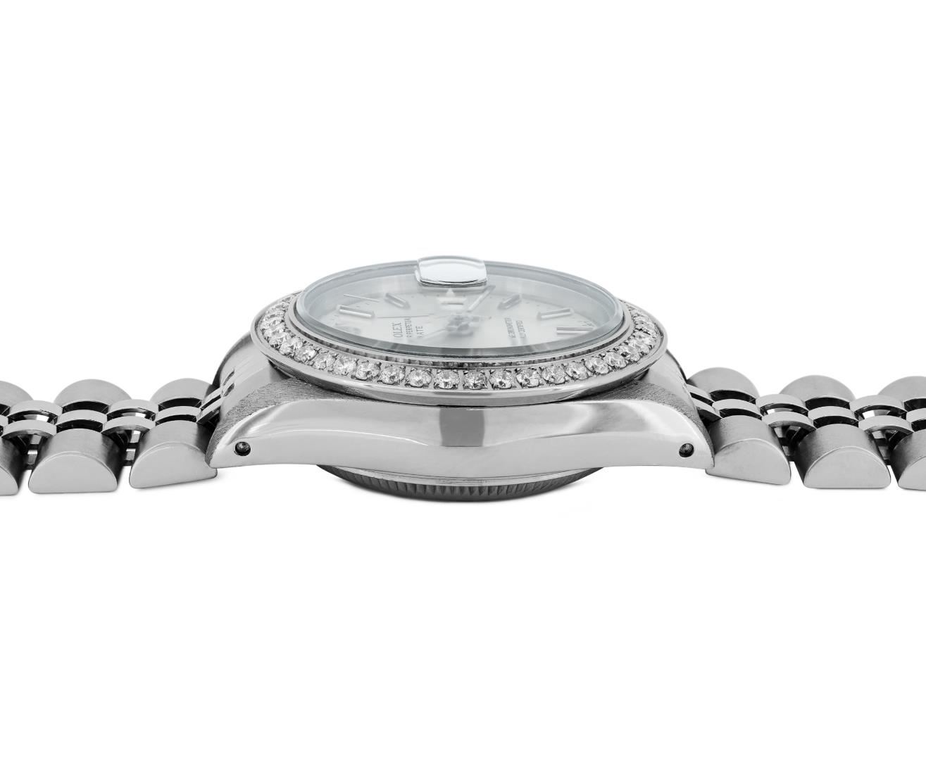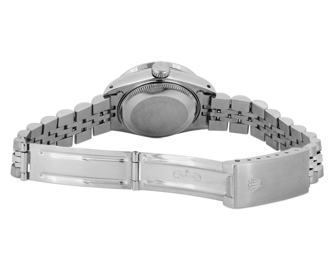 One Rolex Ladies Pre Owned Stainless Steel Date Wristwatch Polished Bright with Satin Finish, Serviced And Electronically Tested, Stainless Steel Case: 26mm, Stainless Steel Crown, Custom Bezel: New Stainless Steel Beadset Diamond Bezel, Diamond Count: 40 Diamonds. Custom Crystal: New Sapphire With Magnified Date Window. Custom Hands: New Luminescent Hands. Rolex Movement: 2135 Automatic Winding Movement. Rolex Dial: Factory Silver With Index Hour Markers And Lumi Dots. Date Window: 3 O'Clock Position Date Display, Model: Quickset Date. Condition: G-6 Extra Fine. Rolex Bracelet: Stainless Steel Jubilee Band. Bright Polish And Satin Finish. 6.0 Inch Length, Adjustable. Standard Clasp, With Rolex Logo. This Watch Has Been Serviced And Time Tested. It Is In Excellent Condition, Free Of All Scratches And Dents. This Watch Comes With A Rolex Box.