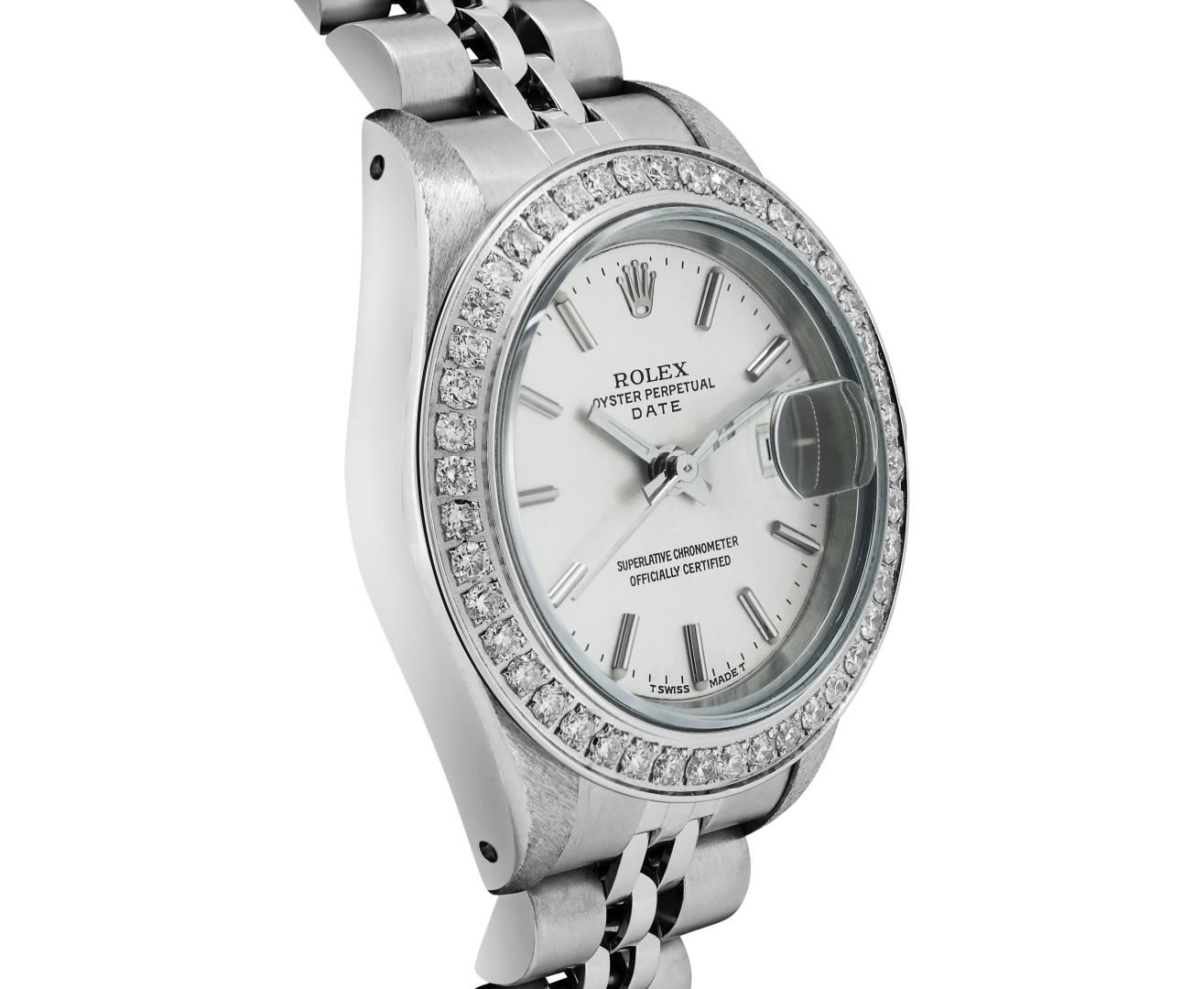 One Rolex Ladies Pre Owned Stainless Steel Date Wristwatch Polished Bright with Satin Finish, Serviced And Electronically Tested, Stainless Steel Case: 26mm, Stainless Steel Crown, Custom Bezel: New Stainless Steel Beadset Diamond Bezel, Diamond Count: 40 Diamonds. Custom Crystal: New Sapphire With Magnified Date Window. Custom Hands: New Luminescent Hands. Rolex Movement: 2135 Automatic Winding Movement. Rolex Dial: Factory Silver With Index Hour Markers And Lumi Dots. Date Window: 3 O'Clock Position Date Display, Model: Quickset Date. Condition: G-6 Extra Fine. Rolex Bracelet: Stainless Steel Jubilee Band. Bright Polish And Satin Finish. 6.0 Inch Length, Adjustable. Standard Clasp, With Rolex Logo. This Watch Has Been Serviced And Time Tested. It Is In Excellent Condition, Free Of All Scratches And Dents. This Watch Comes With A Rolex Box.
