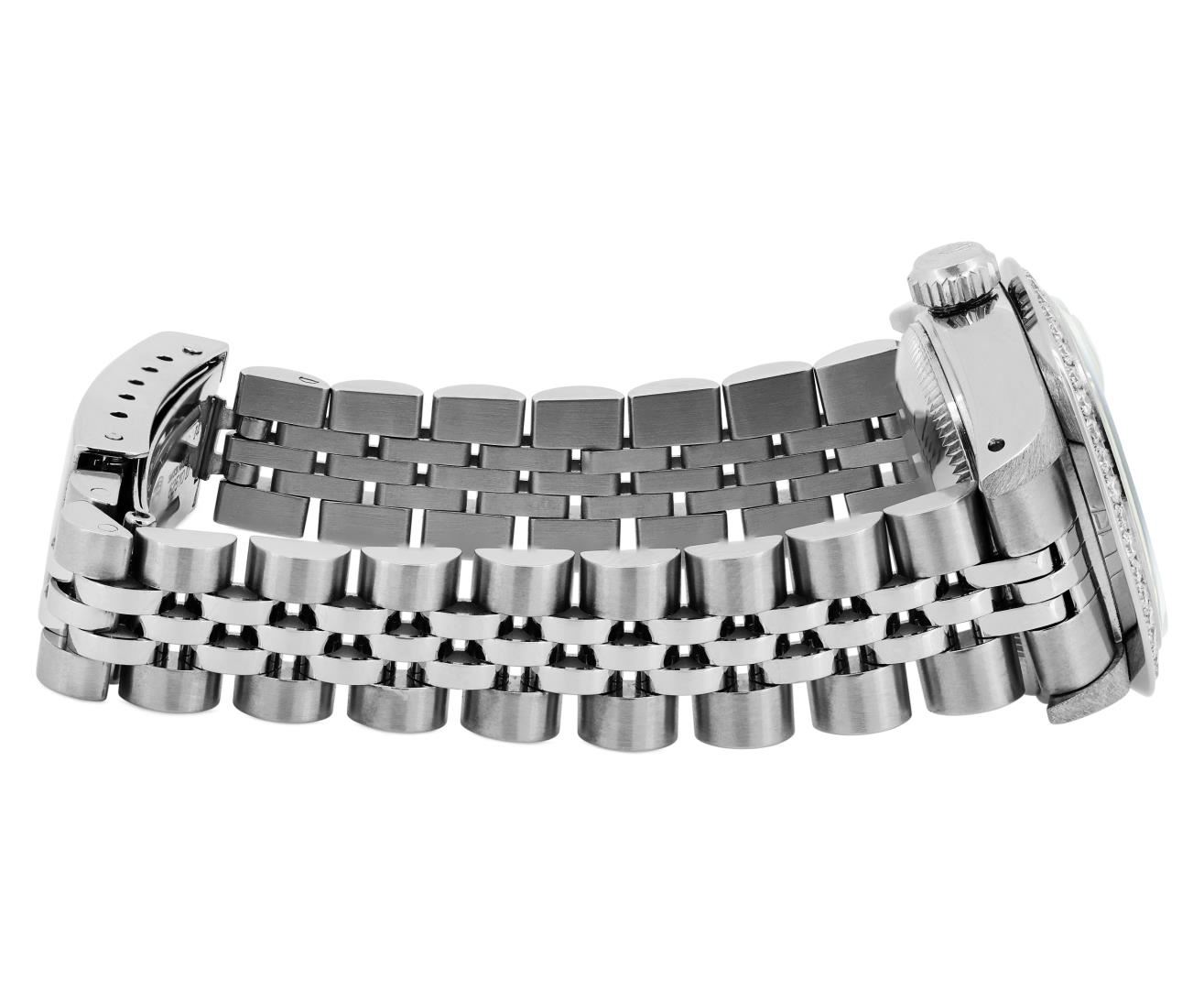 One Rolex Ladies Pre Owned Stainless Steel Date Wristwatch Polished Bright with Satin Finish, Serviced And Electronically Tested, Stainless Steel Case: 26mm, Stainless Steel Crown, Custom Bezel: New Stainless Steel Beadset Diamond Bezel, Diamond Count: 40 Diamonds. Custom Crystal: New Sapphire With Magnified Date Window. Custom Hands: New Luminescent Hands. Rolex Movement: 2135 Automatic Winding Movement. Rolex Dial: Factory Silver With Index Hour Markers And Lumi Dots. Date Window: 3 O'Clock Position Date Display, Model: Quickset Date. Condition: G-6 Extra Fine. Rolex Bracelet: Stainless Steel Jubilee Band. Bright Polish And Satin Finish. 6.0 Inch Length, Adjustable. Standard Clasp, With Rolex Logo. This Watch Has Been Serviced And Time Tested. It Is In Excellent Condition, Free Of All Scratches And Dents. This Watch Comes With A Rolex Box.