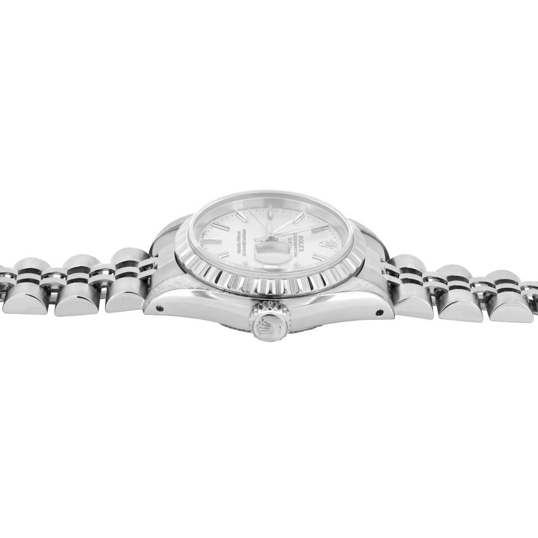 One Rolex Ladies Pre Owned Stainless Steel Date Wristwatch Polished Bright with Satin Finish, Serviced & Electronically Tested, Stainless Steel Case: 26mm, Stainless Steel Crown, Rolex Stainless Steel Engine Turn bezel. Custom Crystal: New Sapphire With Magnified Date Window. Custom Hands: New Luminescent Hands. Rolex Movement: 2135 Automatic Winding Movement. Rolex Dial: Factory Silver With Index Hour Markers And Lumi Dots. Date Window: 3 O'Clock Position Date Display, Model: Quickset Date. Condition: G-6 Extra Fine. Rolex Bracelet: Stainless Steel Jubilee Band. Bright Polish & Satin Finish. 6.0 Inch Length, Adjustable. Standard Clasp, With Rolex Logo. This Watch Has Been Serviced And Time Tested. It Is In Excellent Condition, Free Of All Scratches And Dents. This Watch Comes With A Rolex Box.