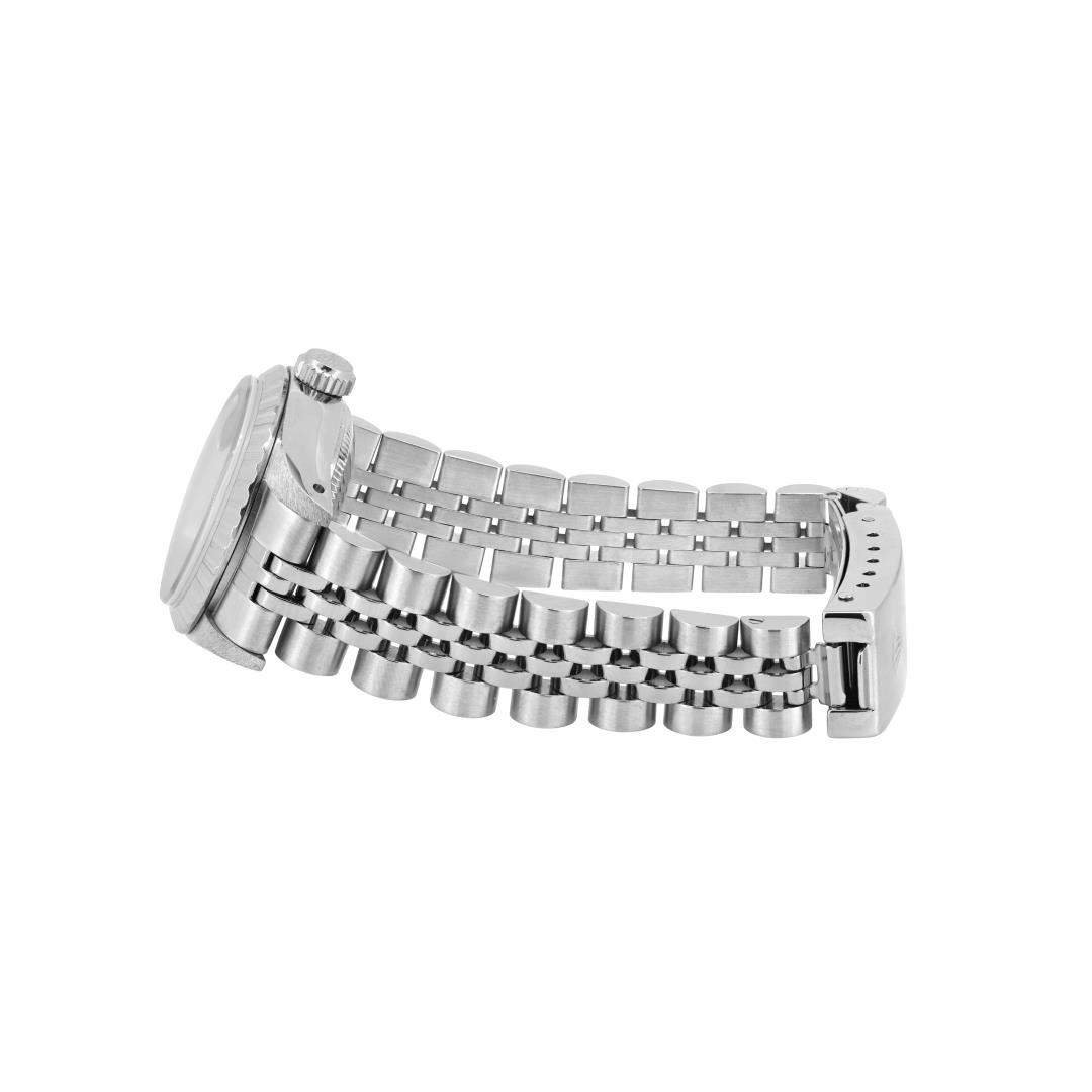 One Rolex Ladies Pre Owned Stainless Steel Date Wristwatch Polished Bright with Satin Finish, Serviced & Electronically Tested, Stainless Steel Case: 26mm, Stainless Steel Crown, Rolex Stainless Steel Engine Turn bezel. Custom Crystal: New Sapphire With Magnified Date Window. Custom Hands: New Luminescent Hands. Rolex Movement: 2135 Automatic Winding Movement. Rolex Dial: Factory Silver With Index Hour Markers And Lumi Dots. Date Window: 3 O'Clock Position Date Display, Model: Quickset Date. Condition: G-6 Extra Fine. Rolex Bracelet: Stainless Steel Jubilee Band. Bright Polish & Satin Finish. 6.0 Inch Length, Adjustable. Standard Clasp, With Rolex Logo. This Watch Has Been Serviced And Time Tested. It Is In Excellent Condition, Free Of All Scratches And Dents. This Watch Comes With A Rolex Box.
