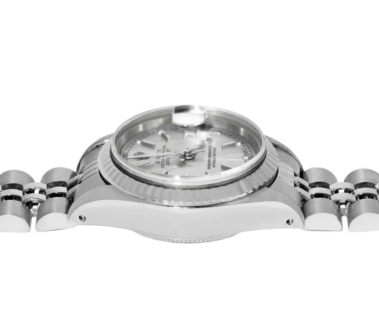 One Rolex Ladies Pre Owned Stainless Steel Datejust Wristwatch Polished Bright with Satin Finish, Serviced & Electronically Tested, Stainless Steel Case: 26mm, Stainless Steel Crown, 18K White Gold Fluted Bezel, Custom Crystal: New Sapphire With Magnifying Date Window. Custom Hands: New Luminescent Hands. Rolex Movement: Rolex Automatic Movement Self Winding 2135. Rolex Dial: Factory Silver With Index Hour Markers And Square Roman Track and Lumi Dots. Date Window: 3 O'Clock Position Date Display, Model: Quickset Datejust. Condition: G-6 Extra Fine. Rolex Bracelet: Stainless Steel Jubilee Band. Bright Polish & Satin Finish. 6.0 Inch Length, Adjustable. Standard Clasp, With Rolex Logo. This Watch Has Been Serviced Time Tested And Is In Excellent Condition. It Is Free Of All Scratches And Dents. This Watch Comes With A Rolex Box.