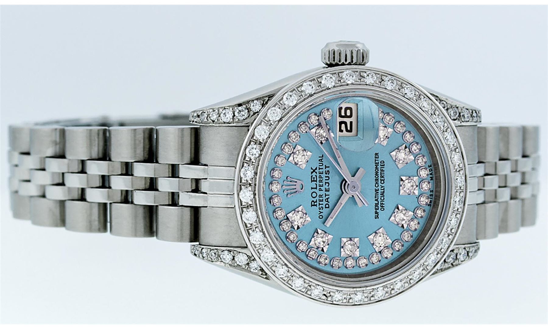 One Quickset Ladies Stainless Steel Rolex Datejust Polished Bright with Satin Finish, Serviced & Electronically Tested, Stainless Steel Case: 26mm, Stainless Steel Crown, Custom Diamond Lugs: 24 Diamonds On Lugs, Clarity: SI-VS, Color: G to H. Custom Bezel: New 18K White Gold Beadset Diamond Bezel, Stone Count: 32 Diamonds On Bezel. Custom Crystal: New Sapphire With Date Window. Custom Hands: New Luminescent Hands. Rolex Movement: Automatic Winding Movement. Custom Dial: Refinished To Blue With Custom Added String Diamonds, 43 Diamonds in Dial G To H In Color, Clarity: VS. Date Window: 3 O'Clock Position Date Display, Model: Quickset Datejust. Condition: G-6 Extra Fine. Rolex Bracelet: Stainless Steel Jubilee Band. Bright Polish & Satin Finish. 6.0 Inch Length, Adjustable. Standard Clasp, With Rolex Logo. This Watch Has Been Serviced Time Tested And Is In Excellent Condition It Is Free Of All Scratches And Dents.