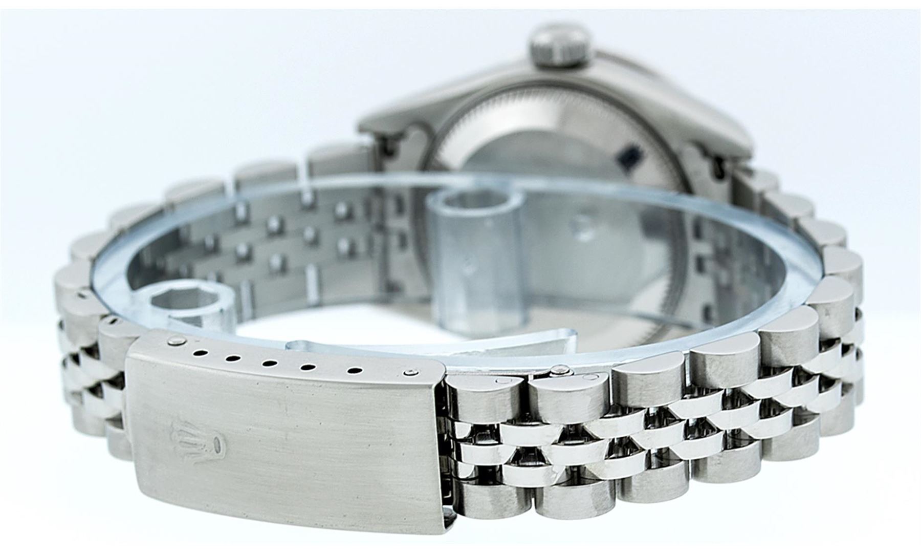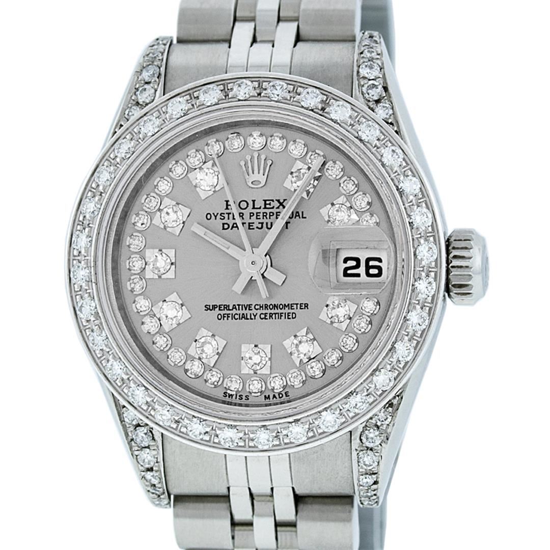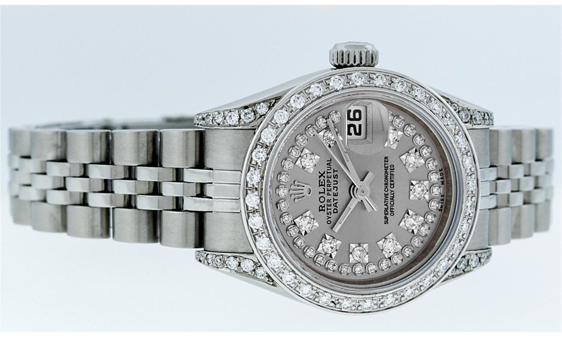 One Quickset Ladies Stainless Pre Owned Steel Rolex Datejust Polished Bright with Satin Finish, Serviced & Electronically Tested, Stainless Steel Case: 26mm, Stainless Steel Crown, Custom Diamond Lugs: 24 Diamonds On Lugs, Clarity: SI-VS, Color: G to H. C