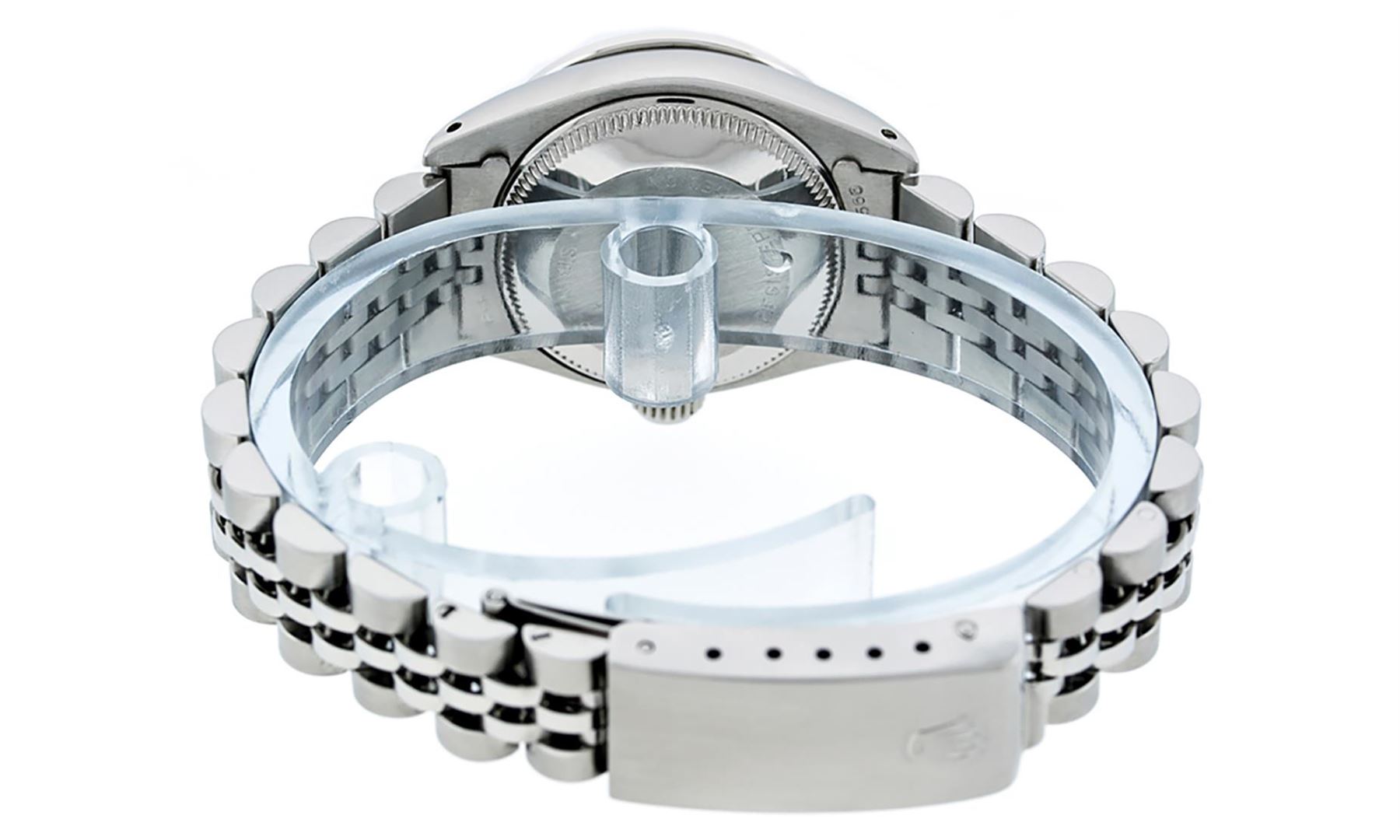 One Ladies Stainless Steel Rolex Datejust Polished Bright with Satin Finish, Serviced & Electronically Tested, Stainless Steel Case: 26mm, Stainless Steel Crown, Custom Bezel: New 18K White Gold Ruby Beadset Diamond Bezel, Diamond + Gem Count: 28 Diamonds + 4 Rubies, Total Weight .70 Carat, Clarity: SI-VS, Color: G to H. Custom Crystal: New Scratch Resistant Synthetic Sapphire Cyclops Lens. Custom Hands: New Luminescent Hands. Movement: Automatic Winding Movement. Custom Dial: Red Roman Dial With Square Track. Date Window: 3 O'Clock Position Date Display, Model: Datejust. Condition: G-6 Extra Fine. Bracelet: Stainless Steel Jubilee Band. Bright Polish & Satin Finish. 6.0 Inch Length, Adjustable. Standard Clasp, With Rolex Logo. This Watch Has Been Serviced Time Tested And Is In Excellent Condition It Is Free Of All Scratches And Dents.