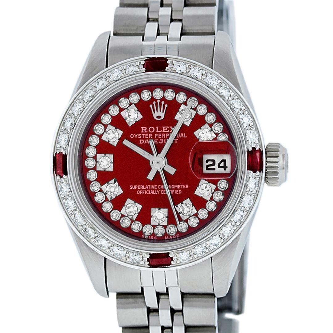 One Ladies Stainless Steel Rolex Datejust Polished Bright with Satin Finish, Serviced & Electronically Tested, Stainless Steel Case: 26mm, Stainless Steel Crown. Custom Bezel: New 18K White Gold Beadset & Ruby Diamond Bezel, Diamond Count: 28 Diamonds + 4 Rubies. Total Weight .70 Carat, Clarity: SI-VS, Color: G to H. Custom Crystal: New Scratch Resistant Synthetic Sapphire Cyclops Lens. Custom Hands: New Luminescent Hands. Movement: Automatic Winding Movement. Custom Dial: Refinished Red String Single Cut Diamond Dial, Stone Count: 43 Diamonds On Dial, G To H In Color, Clarity: SI-VS. Date Window: 3 O'Clock Position Date Display, Model: Datejust. Condition: G-6 Extra Fine. Bracelet: Stainless Steel Jubilee Band. Bright Polish & Satin Finish. 6.0 Inch Length, Adjustable. Standard Clasp, With Rolex Logo. This Watch Has Been Serviced Time Tested And Is In Excellent Condition It Is Free Of All Scratches And Dents.