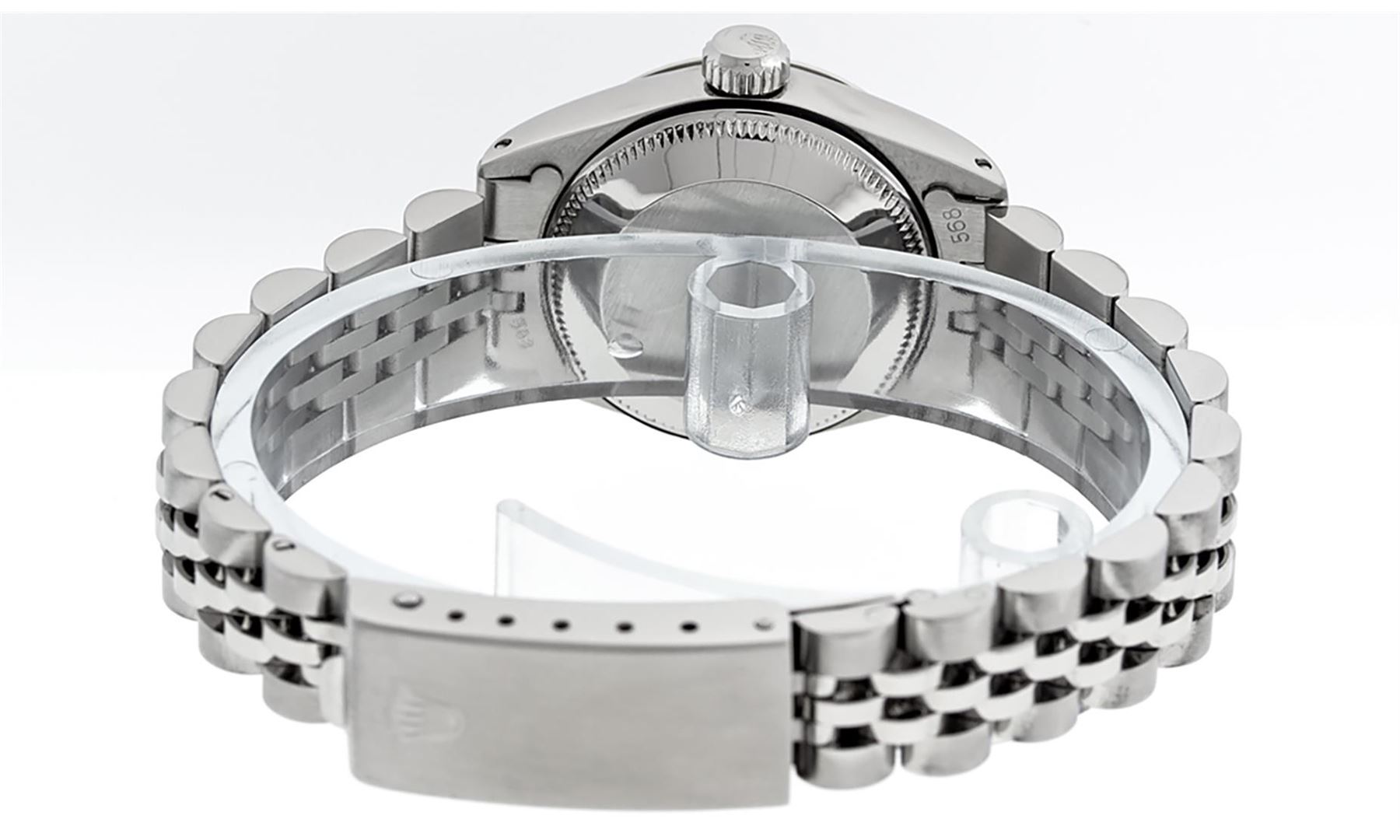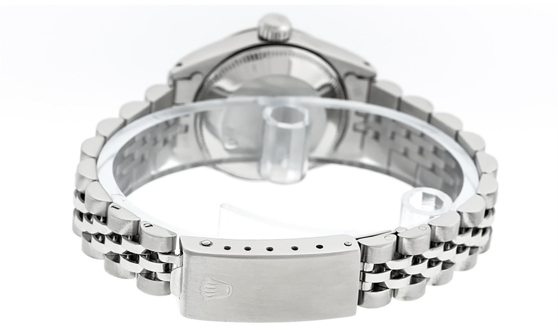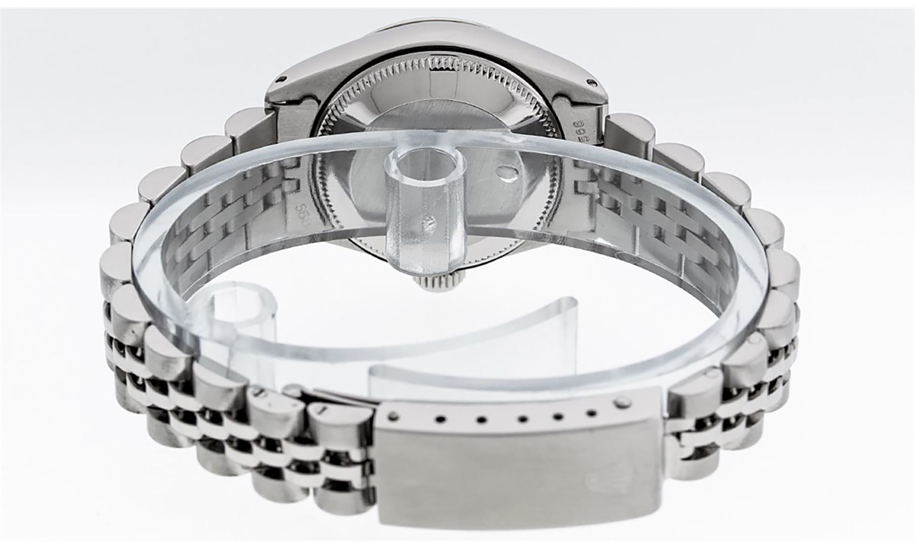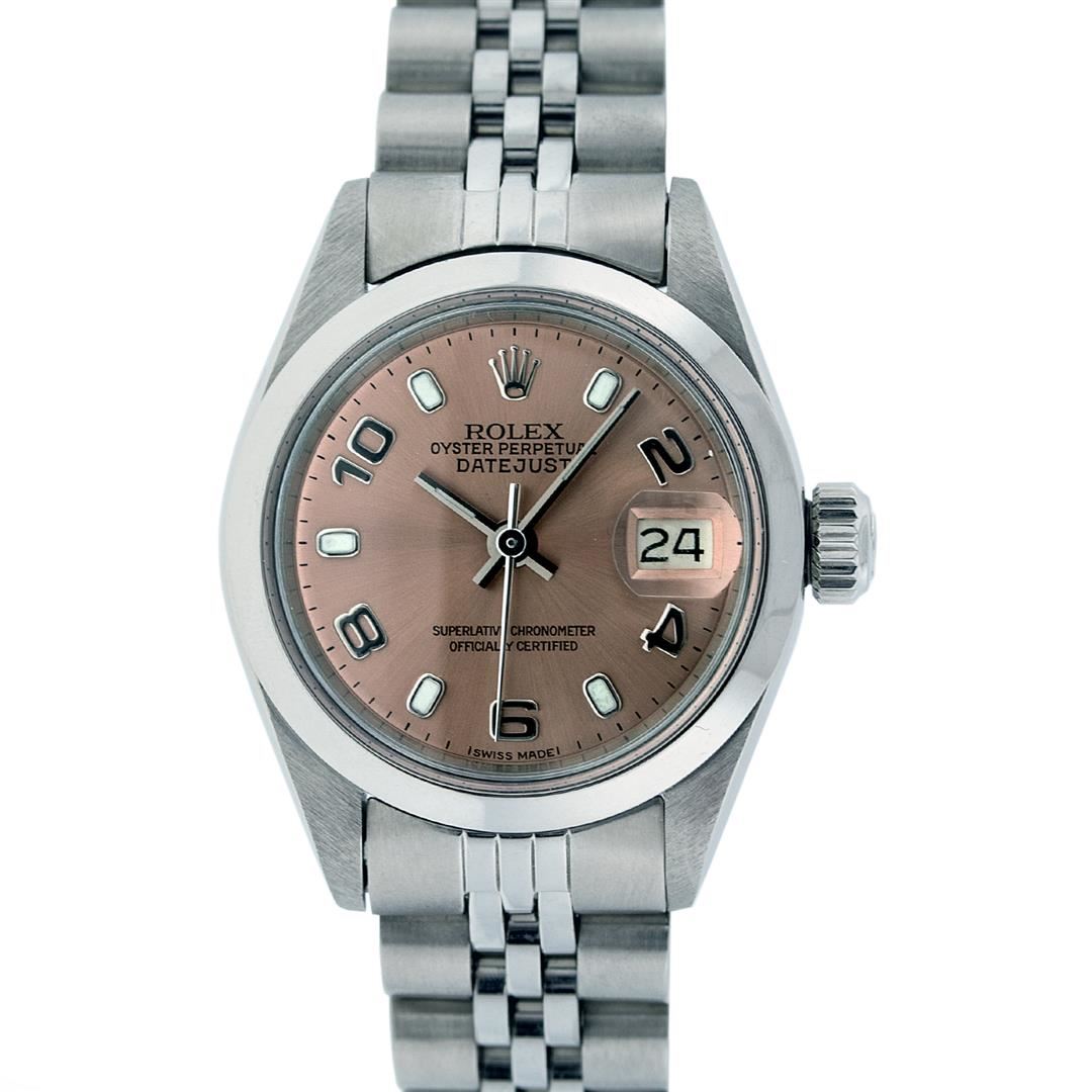 One Ladies Pre Owned Stainless Steel Rolex Datejust Polished Bright with Satin Finish, Serviced & Electronically Tested, Rolex Stainless Steel Case: 26mm, Rolex Stainless Steel Crown, Rolex Bezel: Stainless Steel Smooth Bezel. Custom Crystal: New With Cyclops Lens. Hands: Luminescent Hands. Rolex Movement: Automatic Winding Movement. Factory Dial: Salmon Arabic Dial With Dash Track, Date Window: 3 O'Clock Position Date Display, Model: Datejust. Condition: G-6 Extra Fine. Rolex Bracelet: Stainless Steel Jubilee Band. Bright Polish & Satin Finish. 6.0 Inch Length, Adjustable. Standard Clasp, With Rolex Logo. This Watch Has Been Serviced Time Tested And Is In Excellent Condition It Is Free Of All Scratches And Dents.