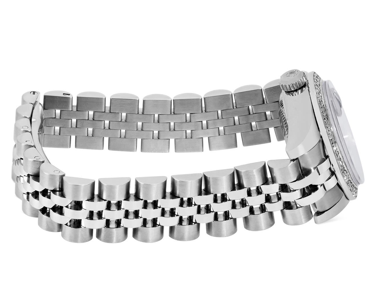 One Rolex Ladies Pre Owned Stainless Steel Datejust Wristwatch Polished Bright with Satin Finish, Serviced & Electronically Tested, Stainless Steel Case: 26mm, Stainless Steel Crown, Custom Bezel: New 18K White Gold Beadset Diamond Bezel, Diamond Count: 32 Diamonds, Total Weight .70 Carat, Clarity: SI-VS, Color: G to H. Crystal: Sapphire With Magnified Date Window. Custom Hands: Luminescent Hands. Rolex Movement: 2235 Automatic Winding Movement. Rolex Dial: Factory Salmon Luminescent Index Hour Markers. Date Window: 3 O'Clock Position Date Display, Model: Sapphire Quickset Datejust. Condition: G-6 Extra Fine. Rolex Bracelet: Stainless Steel Jubilee Band With Hidden Clasp. Bright Polish & Satin Finish. 6.0 Inch Length, Adjustable. Hidden Clasp, With Rolex Logo. This Watch Has Been Serviced And Time Tested. It Is In Excellent Condition, Free Of All Scratches And Dents.