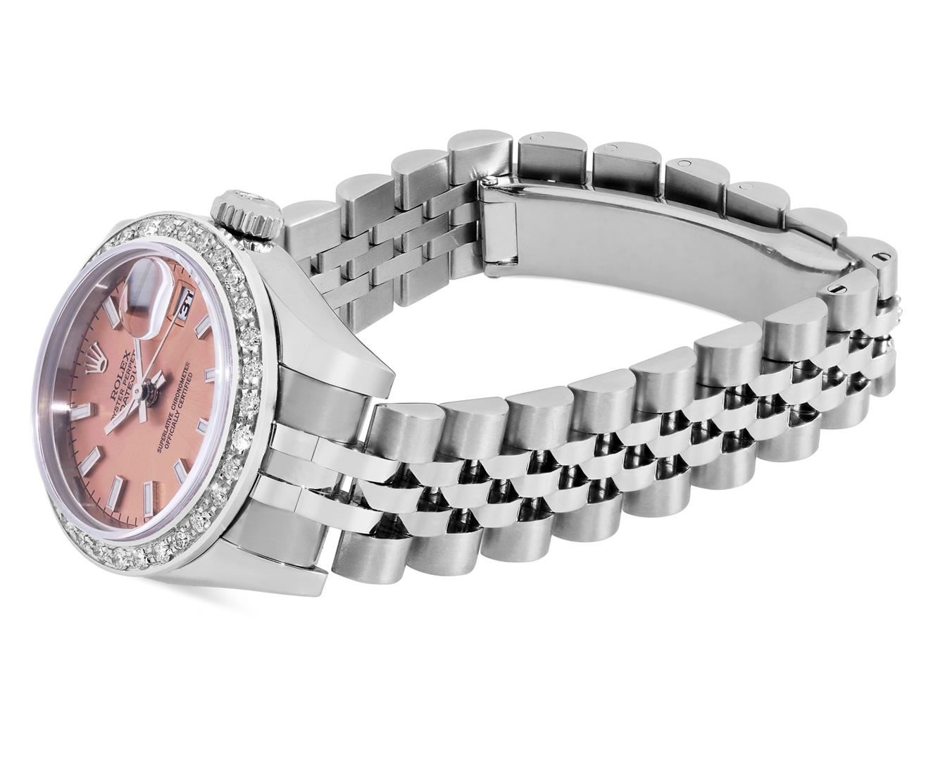 One Rolex Ladies Pre Owned Stainless Steel Datejust Wristwatch Polished Bright with Satin Finish, Serviced & Electronically Tested, Stainless Steel Case: 26mm, Stainless Steel Crown, Custom Bezel: New 18K White Gold Beadset Diamond Bezel, Diamond Count: 32 Diamonds, Total Weight .70 Carat, Clarity: SI-VS, Color: G to H. Crystal: Sapphire With Magnified Date Window. Custom Hands: Luminescent Hands. Rolex Movement: 2235 Automatic Winding Movement. Rolex Dial: Factory Salmon Luminescent Index Hour Markers. Date Window: 3 O'Clock Position Date Display, Model: Sapphire Quickset Datejust. Condition: G-6 Extra Fine. Rolex Bracelet: Stainless Steel Jubilee Band With Hidden Clasp. Bright Polish & Satin Finish. 6.0 Inch Length, Adjustable. Hidden Clasp, With Rolex Logo. This Watch Has Been Serviced And Time Tested. It Is In Excellent Condition, Free Of All Scratches And Dents.