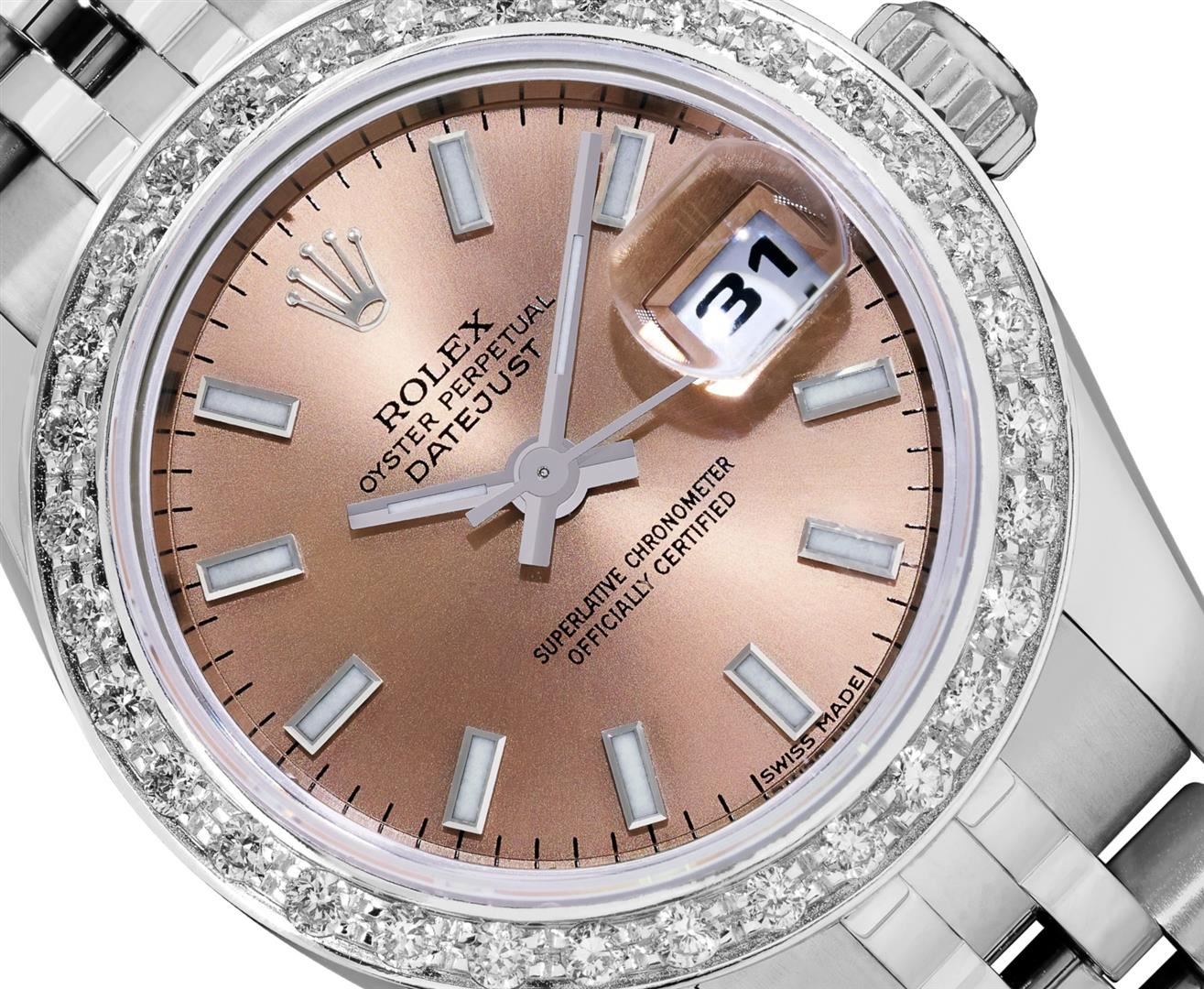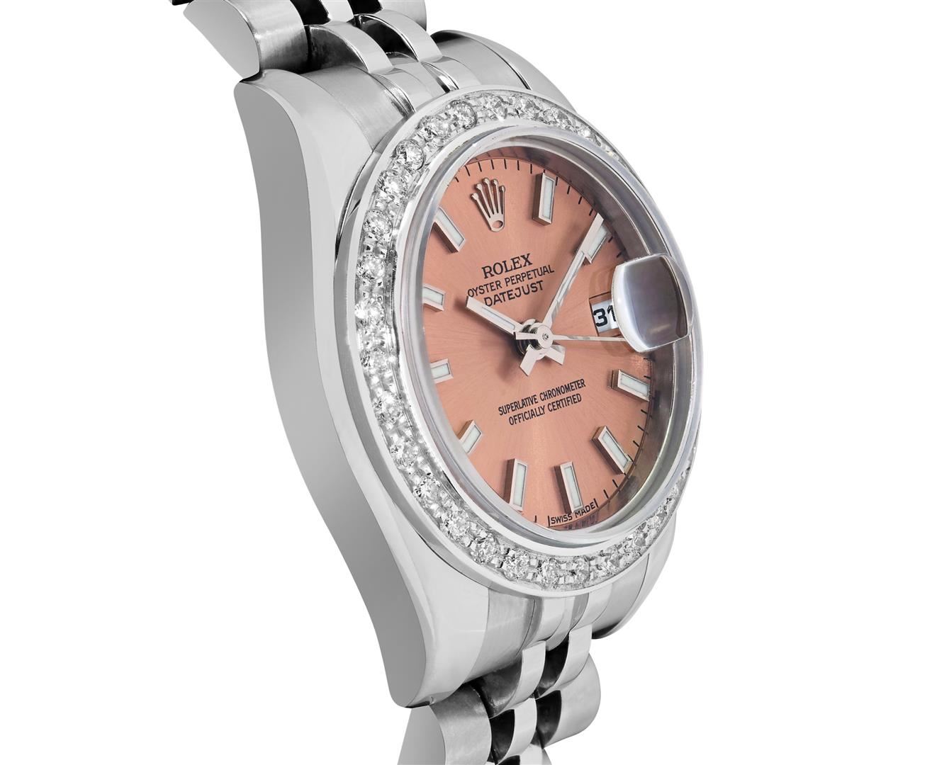 One Rolex Ladies Pre Owned Stainless Steel Datejust Wristwatch Polished Bright with Satin Finish, Serviced & Electronically Tested, Stainless Steel Case: 26mm, Stainless Steel Crown, Custom Bezel: New 18K White Gold Beadset Diamond Bezel, Diamond Count: 32 Diamonds, Total Weight .70 Carat, Clarity: SI-VS, Color: G to H. Crystal: Sapphire With Magnified Date Window. Custom Hands: Luminescent Hands. Rolex Movement: 2235 Automatic Winding Movement. Rolex Dial: Factory Salmon Luminescent Index Hour Markers. Date Window: 3 O'Clock Position Date Display, Model: Sapphire Quickset Datejust. Condition: G-6 Extra Fine. Rolex Bracelet: Stainless Steel Jubilee Band With Hidden Clasp. Bright Polish & Satin Finish. 6.0 Inch Length, Adjustable. Hidden Clasp, With Rolex Logo. This Watch Has Been Serviced And Time Tested. It Is In Excellent Condition, Free Of All Scratches And Dents.