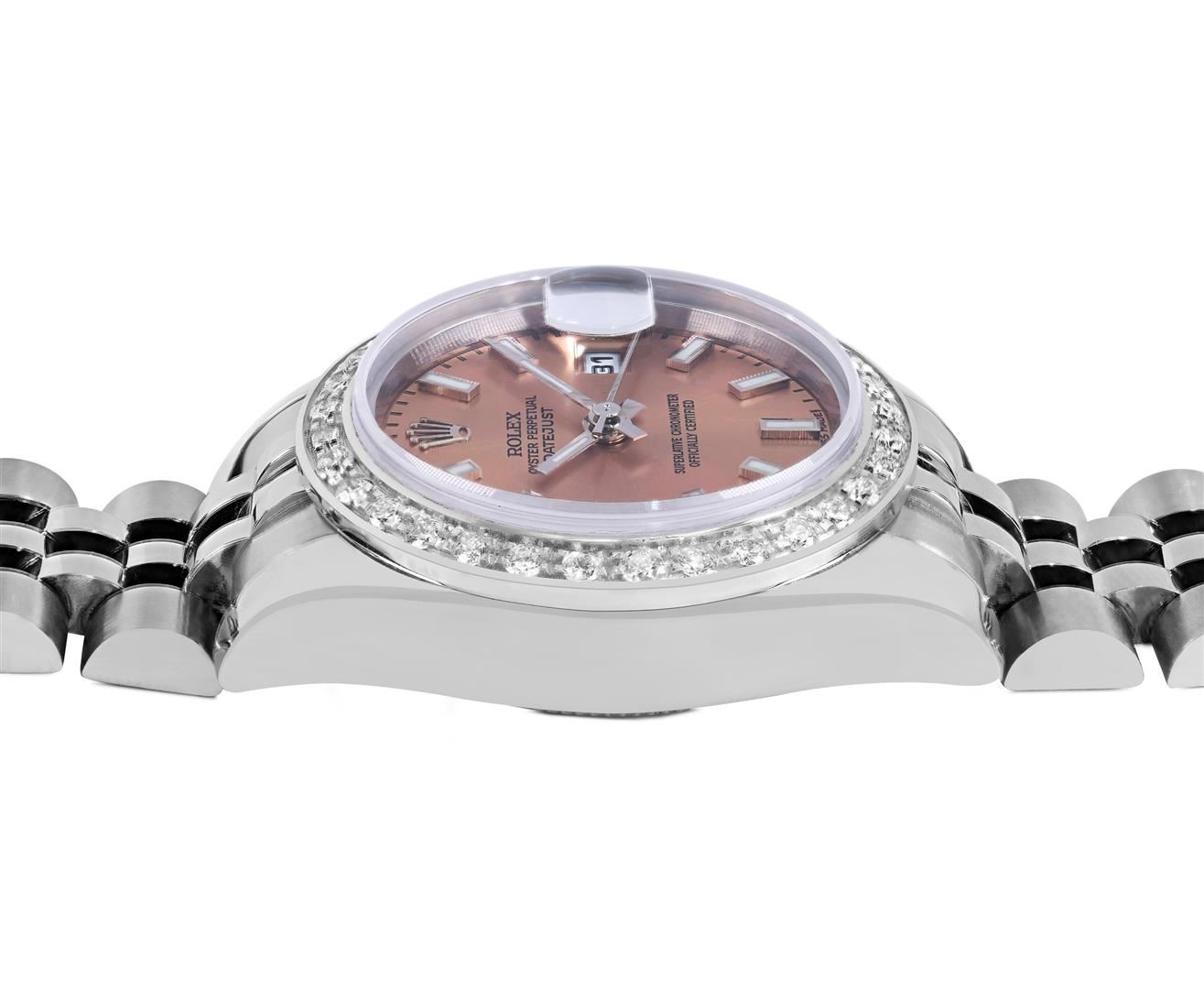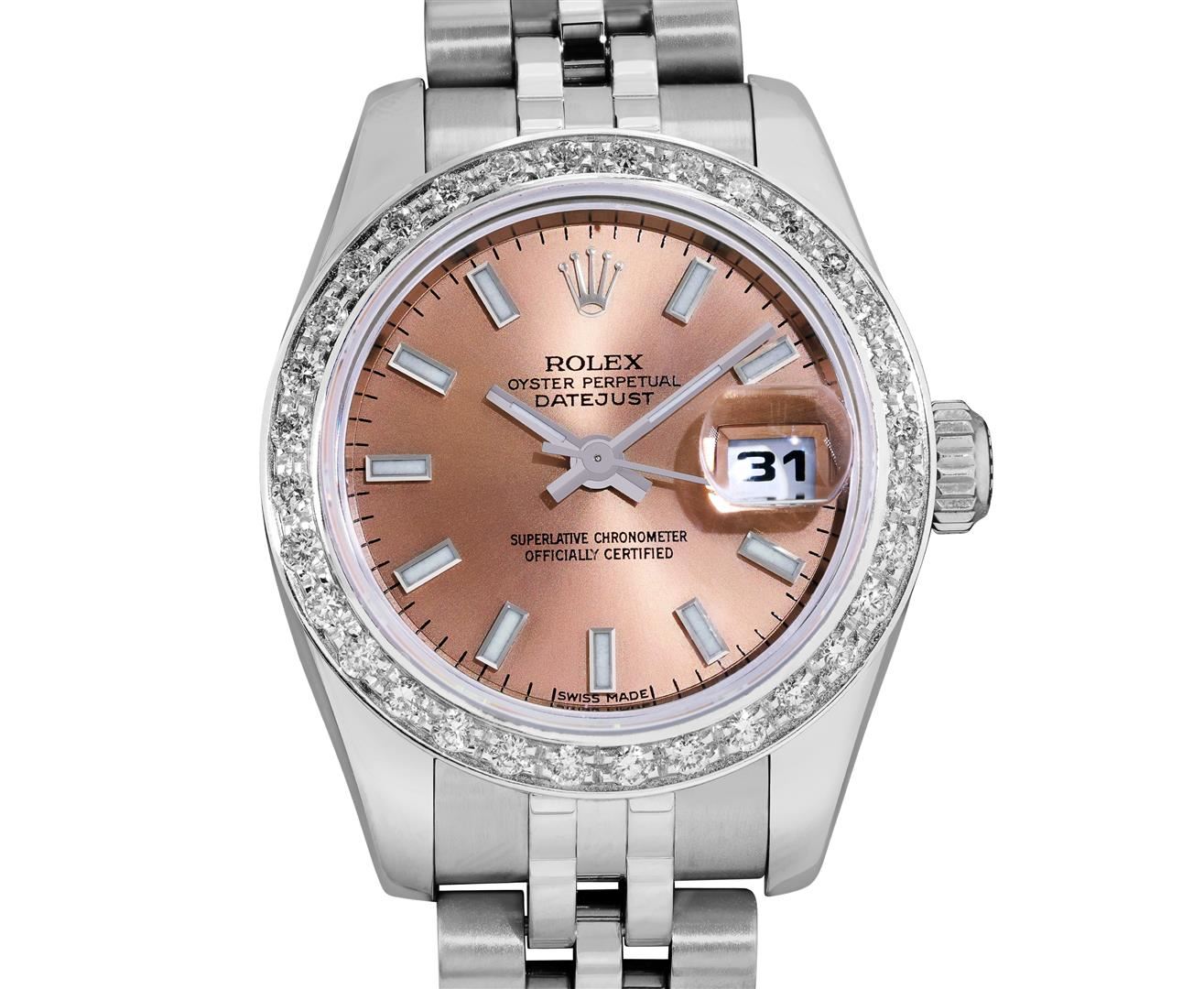 One Rolex Ladies Pre Owned Stainless Steel Datejust Wristwatch Polished Bright with Satin Finish, Serviced & Electronically Tested, Stainless Steel Case: 26mm, Stainless Steel Crown, Custom Bezel: New 18K White Gold Beadset Diamond Bezel, Diamond Count: 32 Diamonds, Total Weight .70 Carat, Clarity: SI-VS, Color: G to H. Crystal: Sapphire With Magnified Date Window. Custom Hands: Luminescent Hands. Rolex Movement: 2235 Automatic Winding Movement. Rolex Dial: Factory Salmon Luminescent Index Hour Markers. Date Window: 3 O'Clock Position Date Display, Model: Sapphire Quickset Datejust. Condition: G-6 Extra Fine. Rolex Bracelet: Stainless Steel Jubilee Band With Hidden Clasp. Bright Polish & Satin Finish. 6.0 Inch Length, Adjustable. Hidden Clasp, With Rolex Logo. This Watch Has Been Serviced And Time Tested. It Is In Excellent Condition, Free Of All Scratches And Dents.