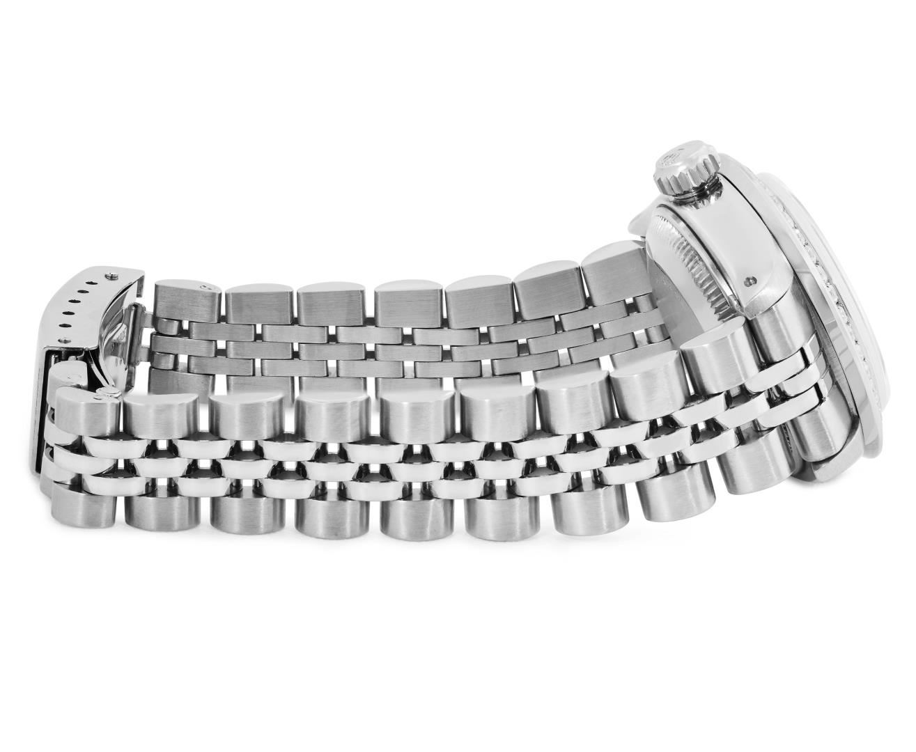 One Rolex Ladies Pre Owned Stainless Steel Date Wristwatch Polished Bright with Satin Finish, Serviced And Electronically Tested, Stainless Steel Case: 26mm, Stainless Steel Crown, Custom Bezel: New Stainless Steel Beadset Diamond Bezel, Diamond Count: 40 Diamonds. Custom Crystal: New Sapphire With Magnified Date Window. Custom Hands: New Solid Hands. Rolex Movement: Automatic Winding Movement 2035. Custom Dial: Custom Salmon Dial With Added Diamond Hour Markers And Lumi Dots, Diamond Count: 10 Diamonds On Dial. Date Window: 3 O'Clock Position Date Display, Model: Date. Condition: G-6 Extra Fine. Rolex Bracelet: Stainless Steel Jubilee Band. Bright Polish And Satin Finish. 6.0 Inch Length, Adjustable. Standard Clasp, With Rolex Logo. This Watch Has Been Serviced And Time Tested. It Is In Excellent Condition, Free Of All Scratches And Dents.